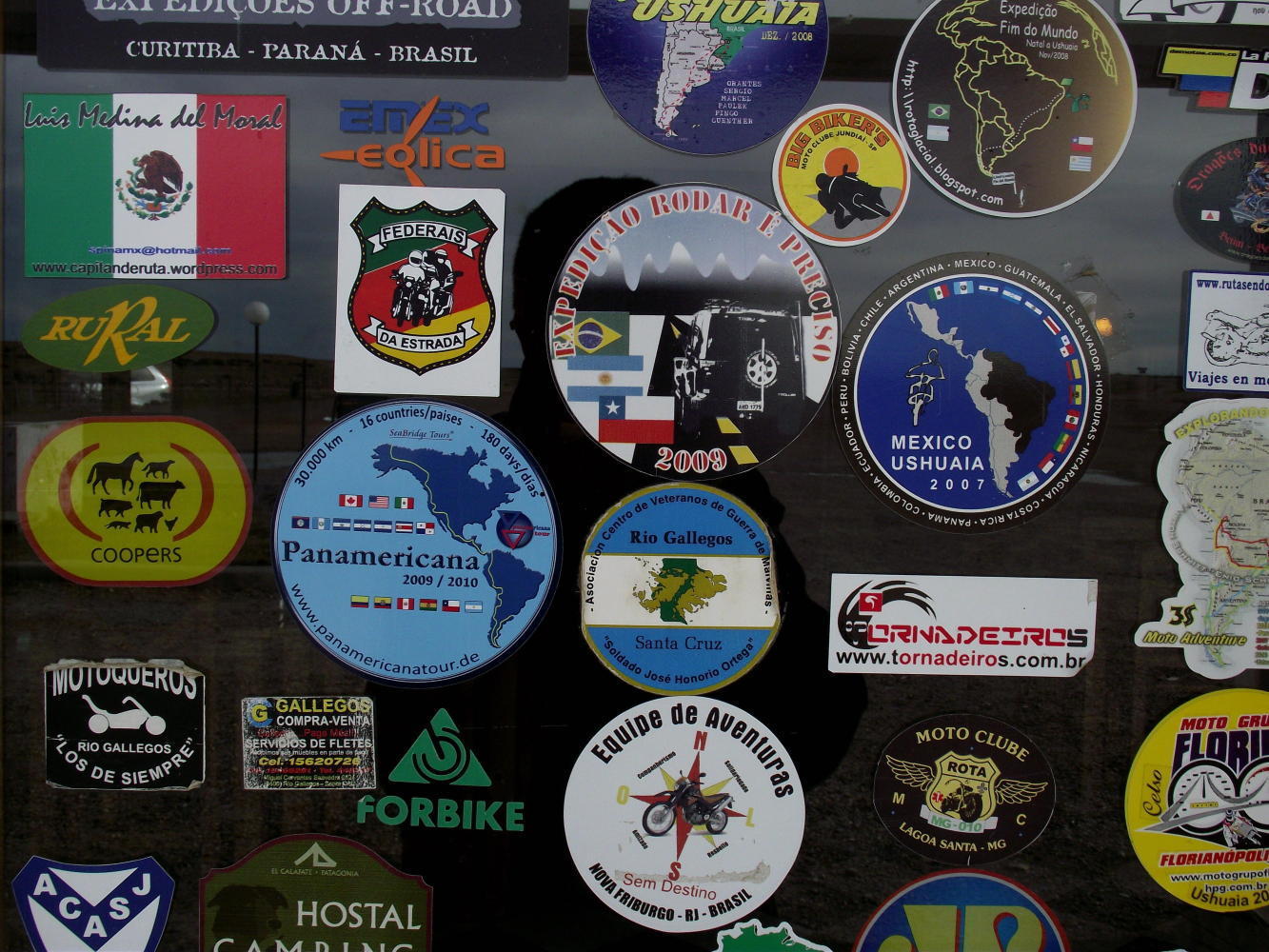 I take a seat to eat my scones with a beer which is a weird combination. The TV is on in the corner which is the only negative of the place as Argentine TV is endless frivolity; ever the TV-news isn't serious. I see, looking out the window, that the sun had broken through creating a brilliant yellow hue. There wasn't any place to camp sheltered from the wind outside so I planned on riding on to wherever, hoping to reduce tomorrows distance. I take a photo of the many stickers by many travelers on the glass door, and leave.