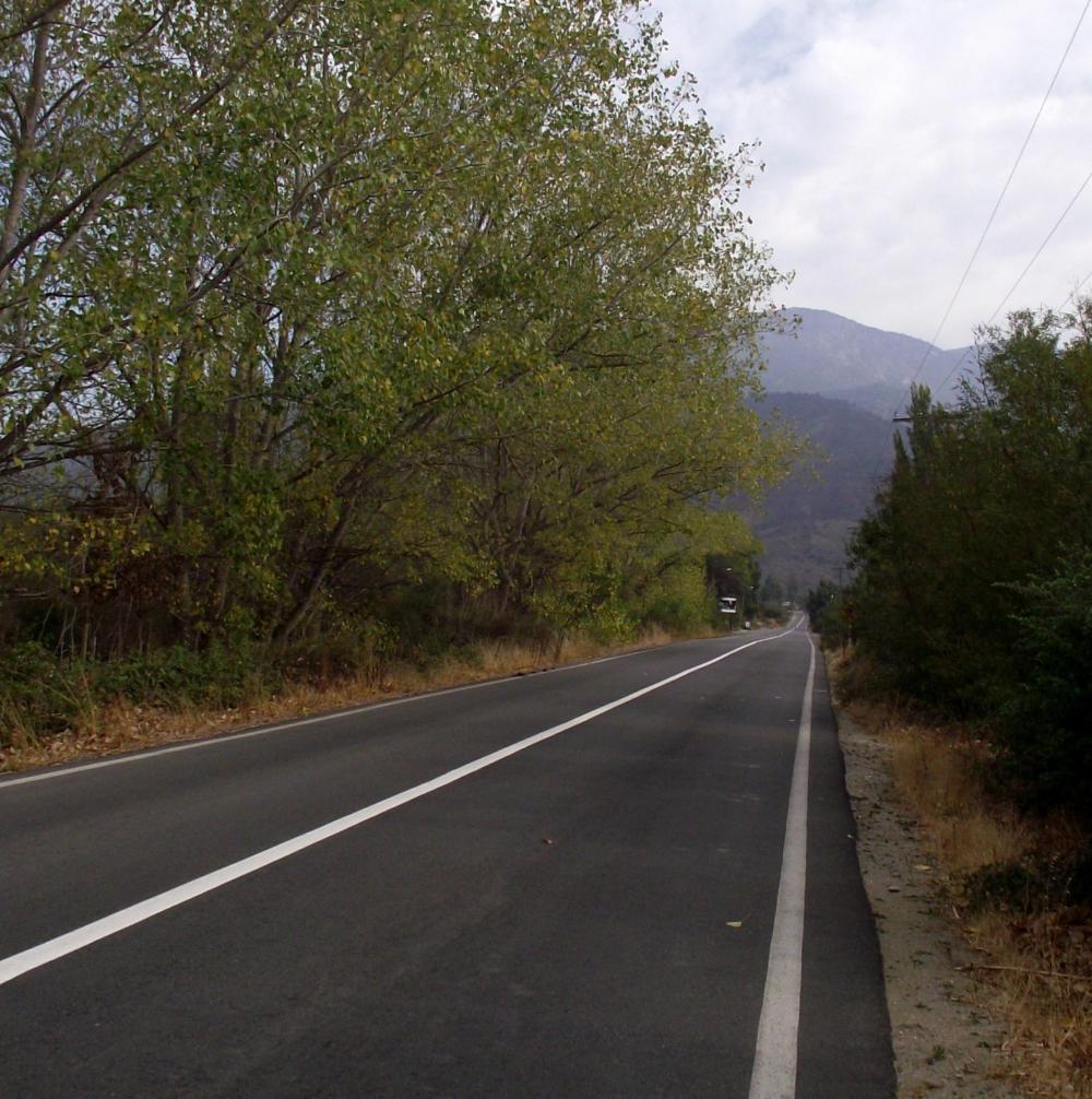 The road swung around as it began to ascend so that the mountain I'd seen getting bigger as I approached was off to the right and I thought that maybe the road after all would take a low path through a gorge at the side. But it wasn't to be, as on rounding a bend, I saw the road switchback it's way up a wall like slope. On turning many hairpins the road climbs steeply from dry stream-beds which had worn a depression down the hillside at these points. Then eventually turning a corner before which it seemed that Is almost there, I find almost as much climbing still lay ahead. The worst was that on crossing the summit, the road drops steeply down into a pocket in the mountains with no way out but another ascend.