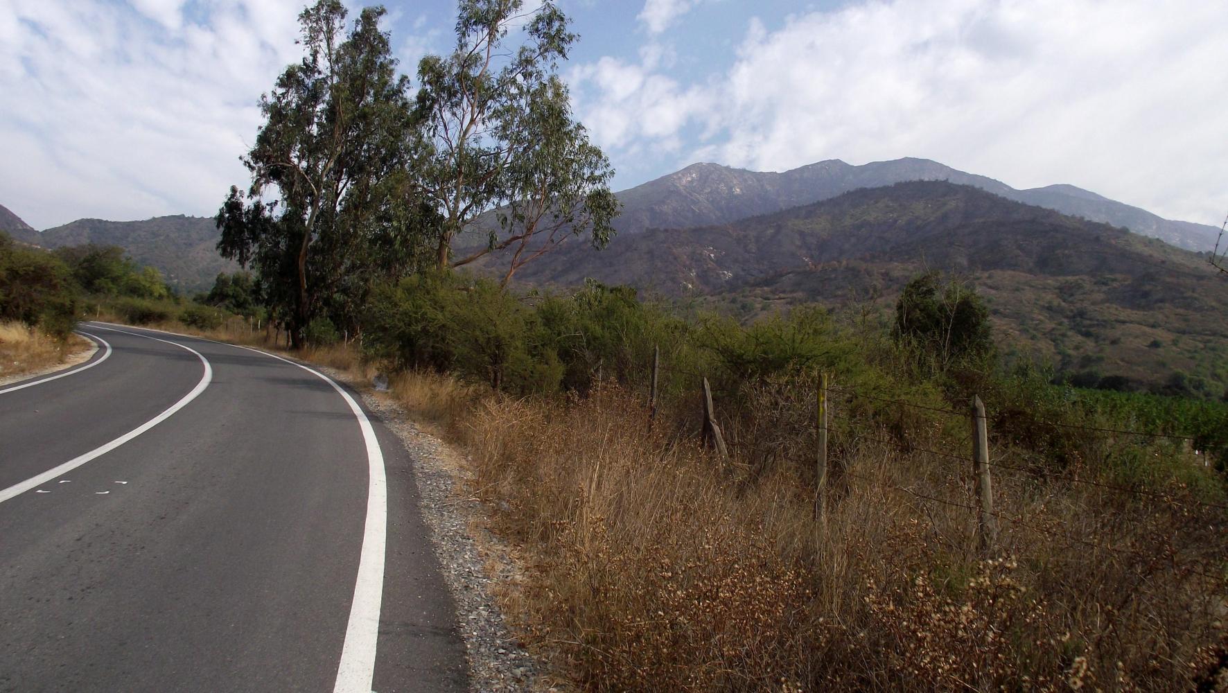 The scenery only became briefly interesting in the afternoon when the road crossed a bridge over the narrow part of a lake, "Lago Rapel". Shortly thereafter the road climbed up and over a ridge dropping down into a new region where the narrow shoulder disappear completely and I'd many kilometres of fearful looking out for the trucks bearing down from behind until I reached where the road split and all the trucks as I'd predicted went left towards the port city of San Antonio. The road straight on went to a place called Melipilla and struck me as a more direct route to Valparaiso. The countryside is now very hilly with dry scrubby hills on either side and lots of Cactus too. And it's densely populated with small villages all along and in-between which are farmhouse at short intervals so finding a place to camp wasn't looking easy.