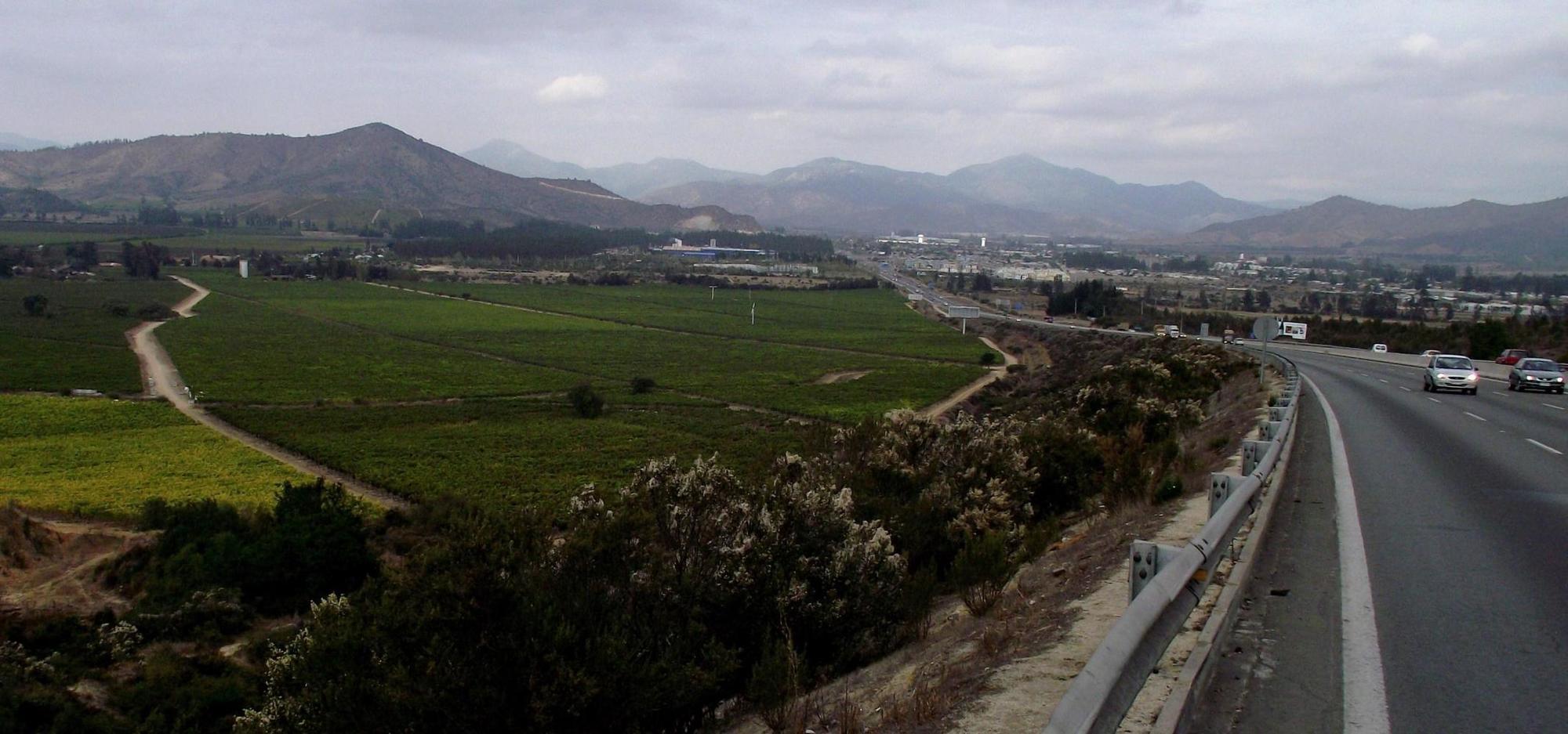 Talca I reached about midday. It's a sizable city of over 200 thousand according to my Copec map-guide booklet not that that matters too much as the Pan Am by-passes it or rather passes through the middle in a narrowed down concrete trench where the shoulder is reduced to a debris strewn metre wide and there are on-off slip-roads continually. It is also the childhood home of Chile's independents hero Bernard O Higgins, according to the booklet. On either side of the centre there are great warehouses were truck loads of crates arrive and a fruity fermenting smell fills the air. I'm now very much in wine country and North of Talca it is all row upon row of vines.