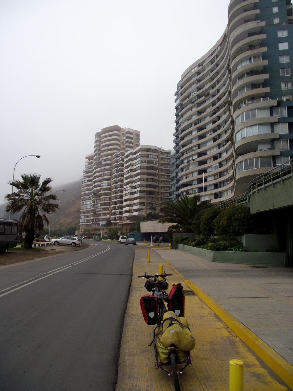 It was a foggy Sunday morning as I set-off cycling again leaving the joy of meeting and socializing with others behind, returning to the solitary existence of a lone cycle-tourer. Cycling on the dual-carriageway which follows the coast North of Valparaiso to Vina del Mar, whereupon on a quieter street I pass well groomed horses drawing white and maroon carriages with polished lamps looking somewhat like part of a scene from a filming of a Dickens classic in London fog.