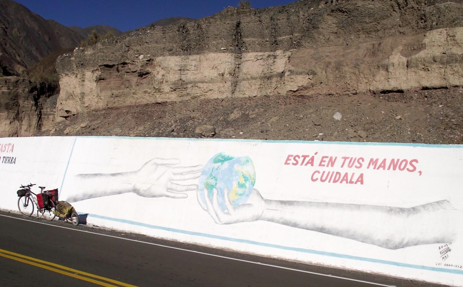 Today would be a day to remember for all the wrong reasons. Though it began idyllic enough me up and out for nature's call at seven just as darkness was giving way to the light of the coming day and with birdsong in the plantation where I'd camped. And cycling away, the road followed the gorge descending gently with the swift flowing river to the left meandering it's coarse amongst the scrub and clumps of Pampa-grass. On the inside was near vertical rock-face and on the opposite side of the river were towering mountains. Evidently, quite a few people lived in this valley at one time; their houses now lay roofless and derelict in groves of trees. The ruins have recently been painted white with the slogan "GIOJA SI 2011" boldly painted in red. I later read on the front page of a local newspaper that Jose Luis Gioja is running for Governor in San Juan and has 65% in the opinion polls. I also past a monstrous hole by the riverbank, what remains of an abandoned mine, and here too the old industrial buildings have been brightly painted white and red with the peoples favourite candidate.
