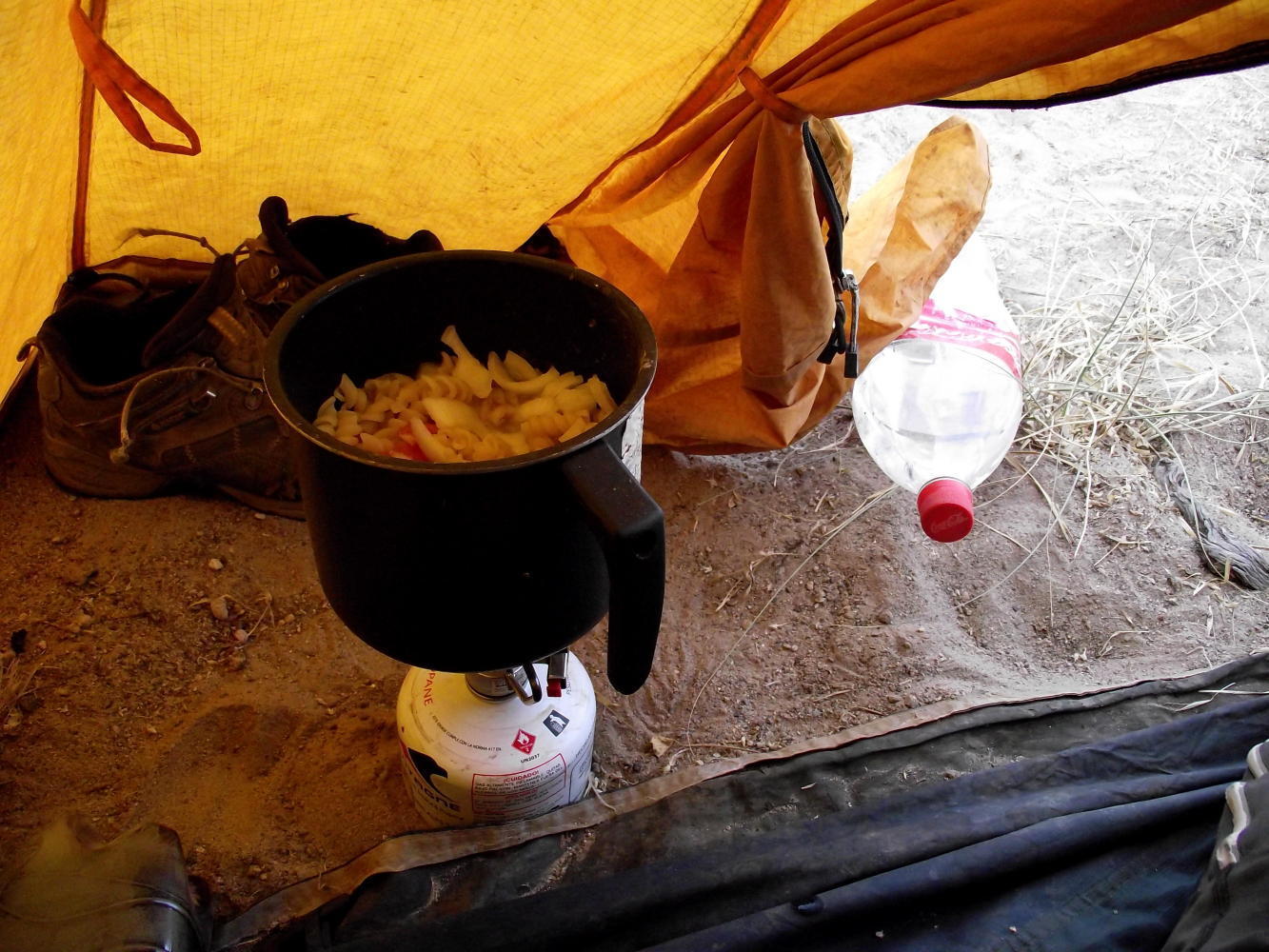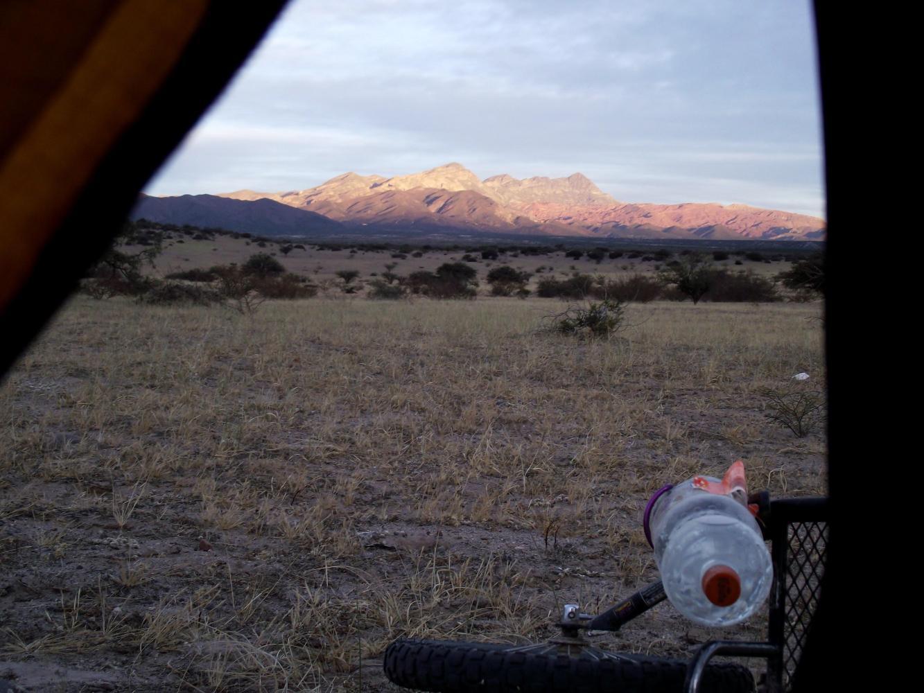 Saturday 28th May: on waking the tent fluddered and shook in a brisk wind. The great thing about this tent is it's design as it withstands the wind so well. Yesterday the wind was light and from behind. In the night it had increased in strenght and shifted direction so that this morning it was blowing in through the tent openning. Because of the wind, I used the stove inside the tent which is an advantage of gas. An advantage of petrol however is it's availabily and it's usefulness for cleaning the chain and cassette. Petrol cannot be bought without a proper container which I don't have resulting in a dirty black chain and cassette which I'd like to wash as a dirty drive-train is harder to pedal. The alternative is a produce called Bensina Blanca but difficult to find.