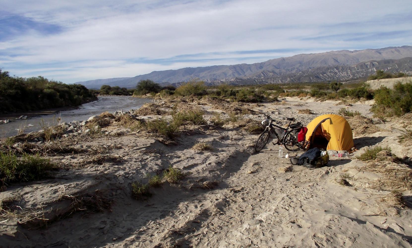 The wind picked up in the afternoon and progess was slow again. Eventually at three o'clock I reach the hills which I'd been cycling towards since morning. Here the road slipped away down through a gap: the descend I pedal hard because of crosswind. Below the road levell out in a valley with brown hills close on either side and easy access to the riverbank with good camping possiblities all along, so I decided to stop early at four with the sun still high in the sky.