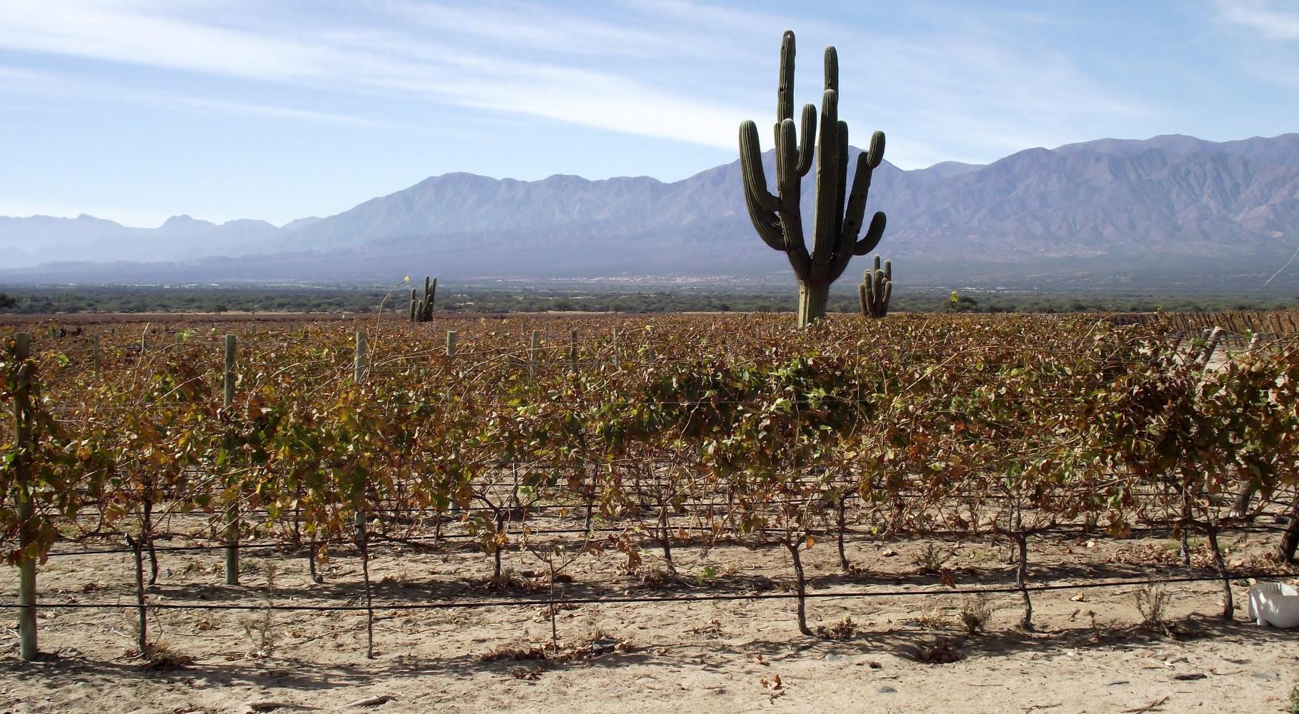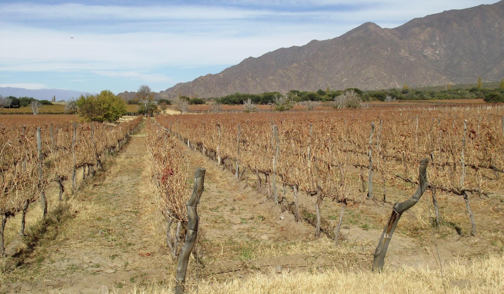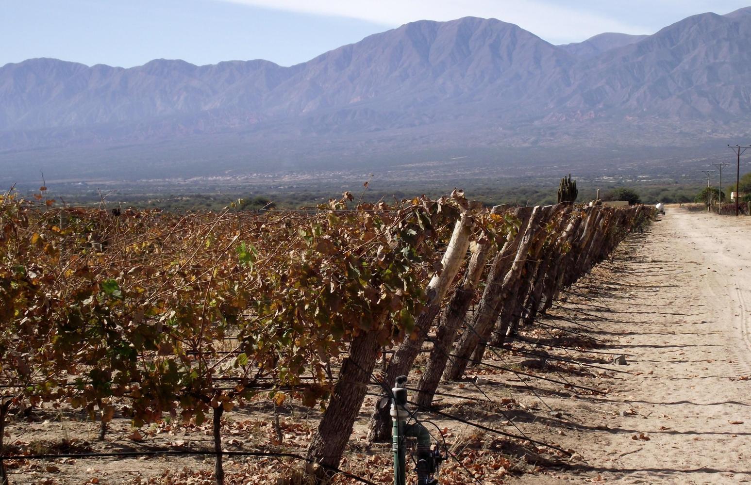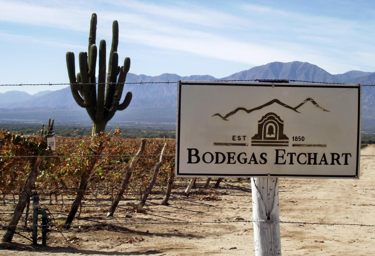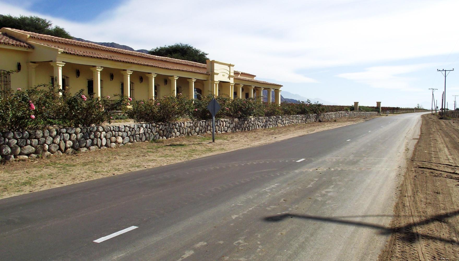 In a short time Is in wine country with row upon row of vines behind the roadside fence.. There were placards with names like "Etchart": a wine from Cafayate in the provence of Salta where wine is produced from grapes grown at over two-thousand metres altitude; notably the highest vineculture in the world.