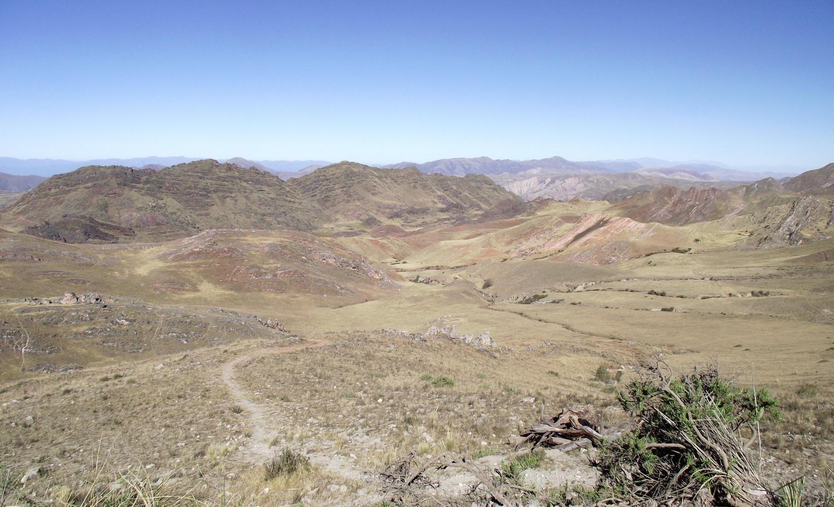 The provence of Buenos Aires isn't Brazil. Tuesday twentyeighth December: Breakfast was porridge made palatable with vanila flavour yogurt and tea. It was good to be on the road at an early hour where a big bank of dark cloud met on the horizon golden wheat. There were spits of rain but it was bright ahead. As I made progress, the countryside changes from snookertable flat to low gentle slopes and hills. Further still the cloud began to clear revealing mountain ridges. From late morning the road past along and up a valley amongst the mountains. It resembled the Scotish highlands a bit. At some point the road dropped steeply down to another valley with small patchwork wheatfields with heather margins sloping up from the roadside to rock-outcrops and escarpment.
