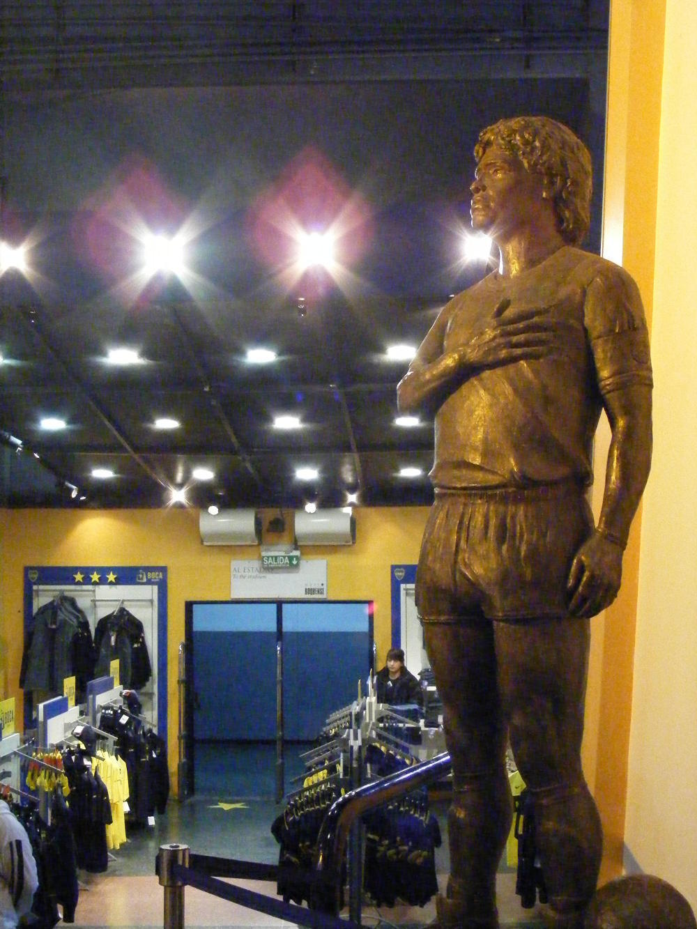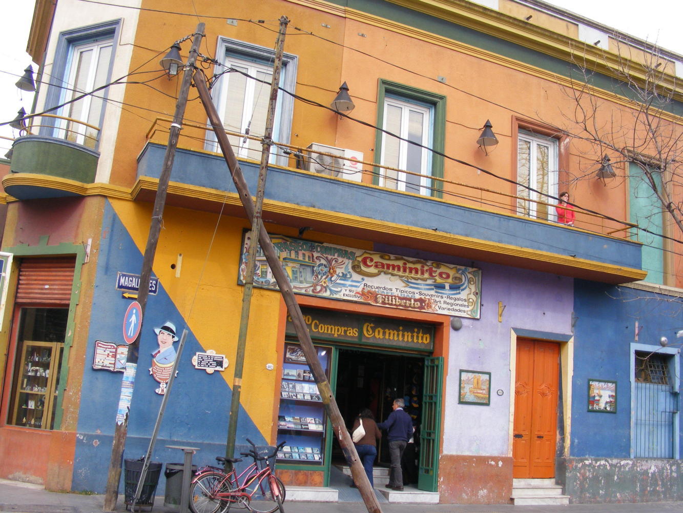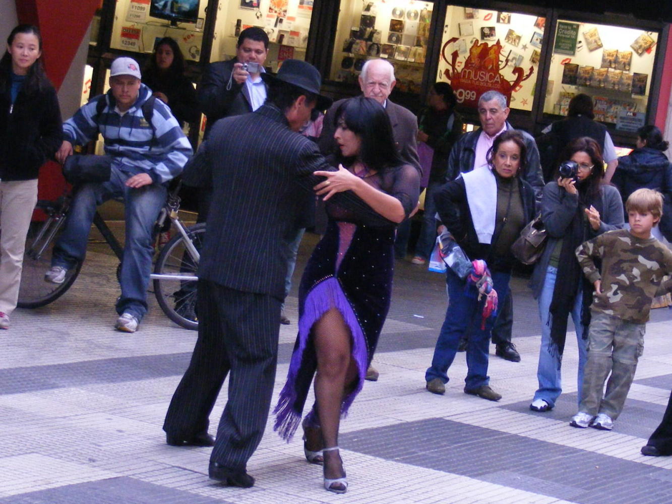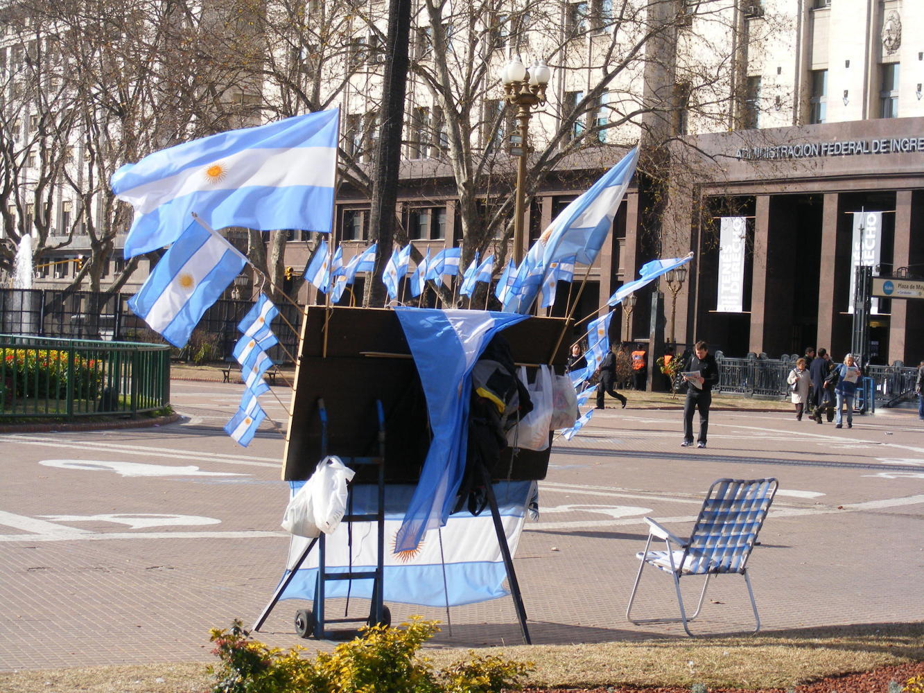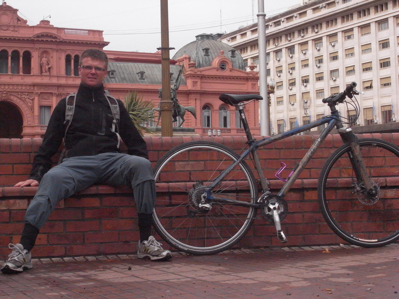 On Wednesday, my second day, I visited the city cemetery Recoleta: the last resting place of the great and good of Argentine society. Thursday, I went on a Millhouse tour to La Boca, the neighbourhood made famous by the dance Tango. The tour-guide done her work showing our group around, then left us to go off on our own, stating a time and a place to meet-up for lunch. But an Australian and I most of misunderstood something along the way, because we waited on a street-corner from twelve-thirty to one, none of the others having turned up. We had to ask a Maradona lookalike making a living by posing for photos with tourists, where Heidi the tour-guide would be. Reunited, our Millhouse party moved on in the afternoon to a tour of the "Boca Juniors" football stadium. Friday, I collected my camera at the work-shop; then set off to Palermo, the district of bars and restaurants where I came to the conclusion that Argentina has got very expensive since 2006; the last time when I thought nothing of whiling away an afternoon in a Palermo bar. On Saturday I took the bike out for a spin to see all was running well. I cycled north-west from Retiro train-station along the wide Avenida Liberador, past the port with it's cranes and shipping containers stacked high against the cold grey gloom of the winter day; then branched off to a park called Hippodromo; apparently Polo is played therein, but there wasn't any horses happening, except that is for a coach and horses wedding procession in a street nearby. Today I was out on the bike again. I got a photo of myself sitting next my steed in Plaza de Mayo before going on to the Sunday flee-market in San Telmo.