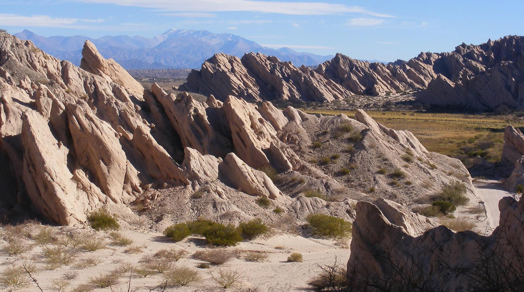 I cycled back out from Angastaca on the two kilometre-access road and turned right at the end, back onto RUTA 40 southbound and straightaway could see Las Fechas ahead of me: The Arrows to tramslate in English, looked like a wall of broken slabs stacked up in a slant at forty-five degrees to a height of over ten metres or thereabouts, rugget and pointed on top and a unique hue, yellowish-light-brown. The road went up a sharp incline enclosed either side to a summit with a veiw around over what was like a honey coloured glacier lurching along both sides of the road which looped up and down onwards. The road builders had their work cut-out carving a way through until the last run-down to a pale green willow enclosed river. Across the bridge Is back to more usual sandy scrubland with bare rocky hills to the side and distant snow-capped mountains peeking over the horizon ahead.