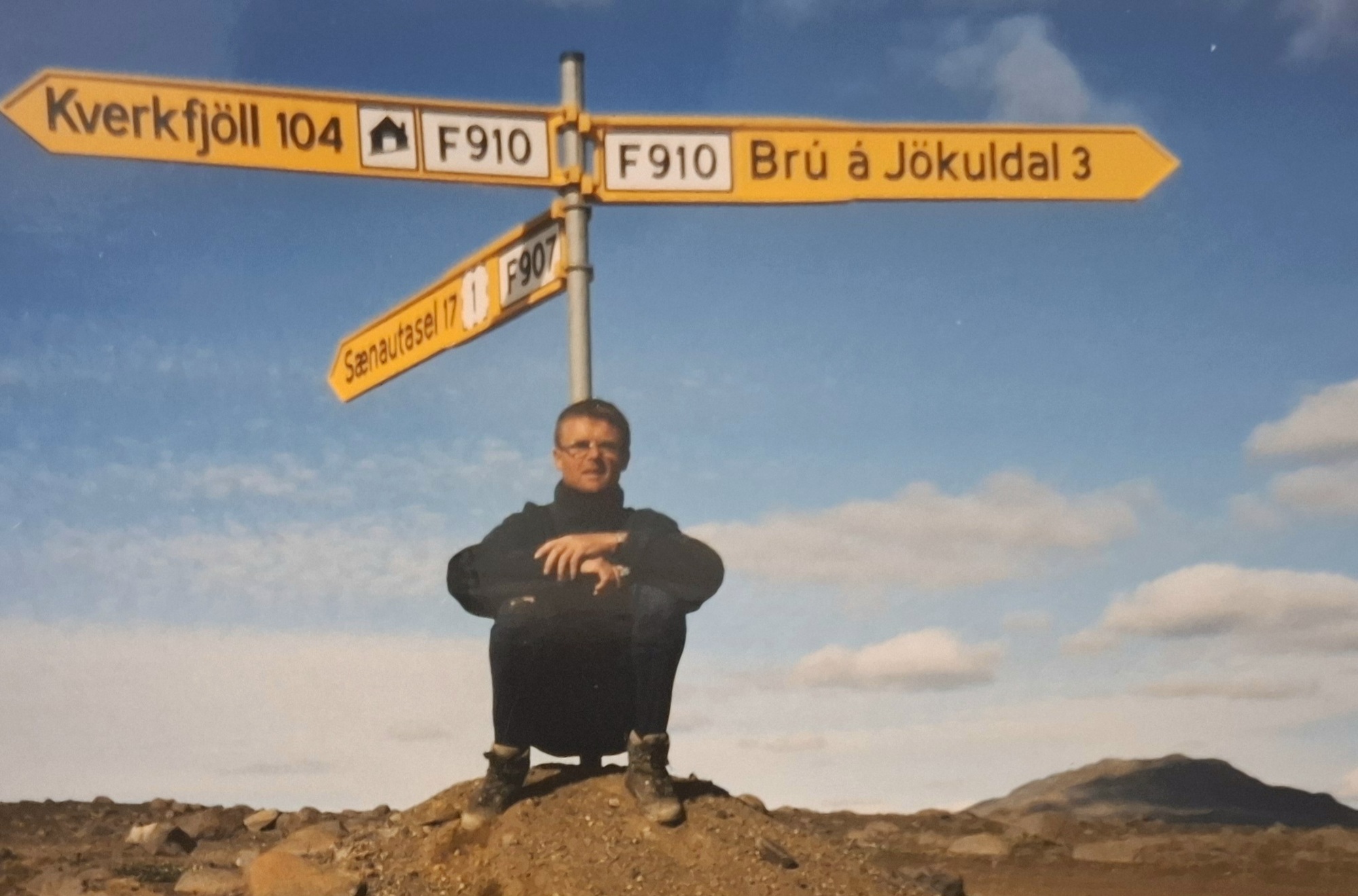 Around 3 I reach a fork in the valley and the road with F910 coming from the left, down the valley from Snaefell (Snow Mountain). I go right and climb up out of the valley around a series of steep hairpin bends to a world of dunes. Up here it was like a crisp winter's day. Sunny but cold on reaching a crossroads where I stop to take my photo by the roadsign with Kverkfoll 104 (a location on the edge of Vatnajokull icecap) with hut symbol indicating that there is shelter in the form of a mountain hut. And a bit further is a sign for Askja 89 km.