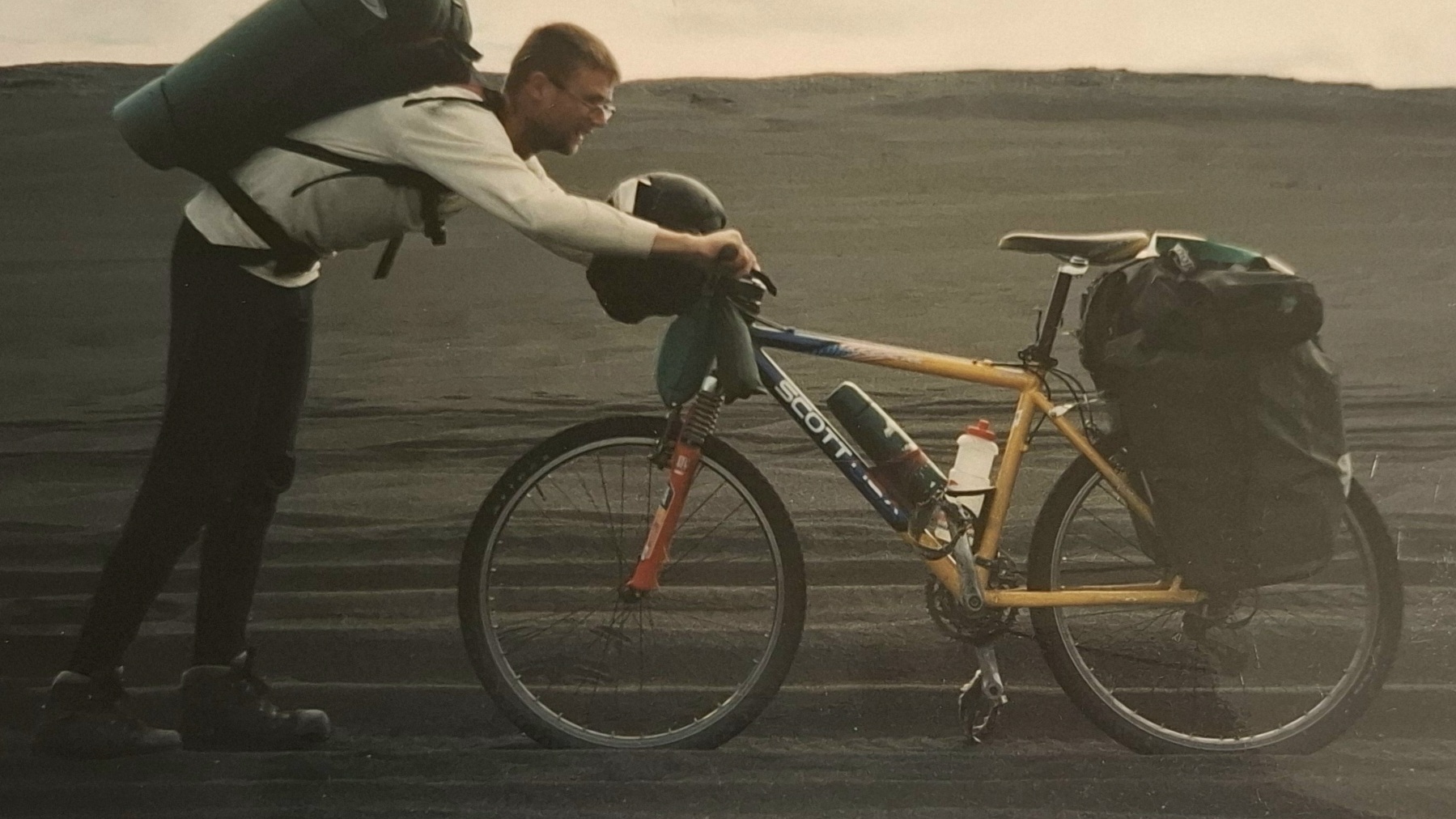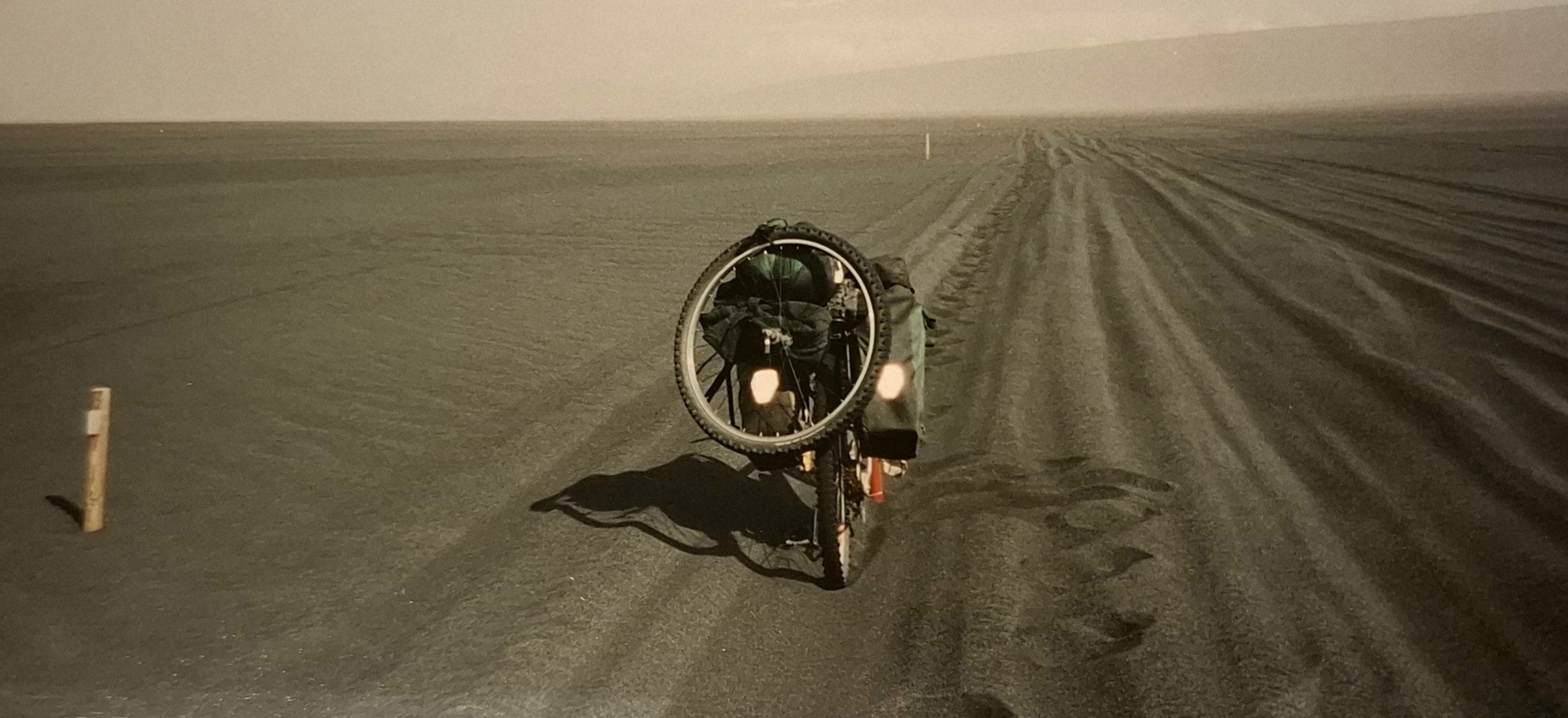 The first few kilometres was slightly downhill, stoney and bumpy. It was here that another spoke broke in the back wheel. Though, instead of going even more out-of-true, the wheel when I checked ran truer due to the freshly broken spoke being opposite the first broken spoke, so it didn't put too much of a dent in my confidence. I continued and not far onward the track levels out on a wide expands of deep black sand. An area called the "Vitisandur" which translates as the sands of hell. There is no longer a firm surface to ride upon, just car tracks through deep loose sand with posts every 200 metres marking the way. Impossible to ride upon, so I was off pushing the bike; not easy when the bike weights so much while my feet sank into the sand. Moreover, the usual way to push a bike is to stand offset while leaning over to hold the handlebars with both hands. The inside foot against the heavy bike drags while the foot on the outside takes long strides, a kinda lopsided walk which quickly became exhausting, leading me to experimenting with different pushing techniques such as pushing in reverse while walking inline with the bike. Whatever way, I had to pause often and soon got into pushing from one post to the next, stop to rest for a minute, push to the next post and so on.