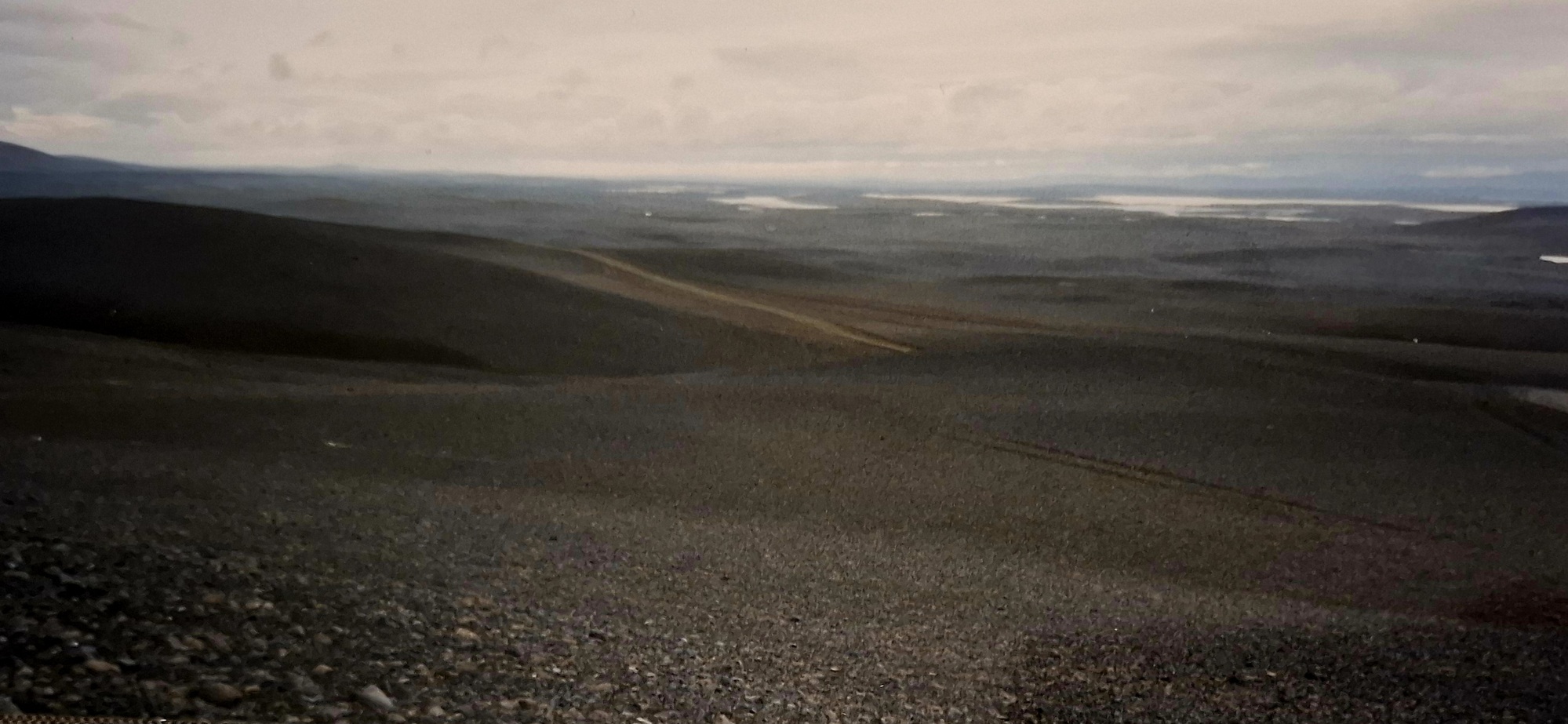 Things were going well with good rideable track undulating over black hills; that is until 3 PM, when the track reached a raging glacier river. The ford was narrow where the river surged out of a canyon. There was no point in even trying to cross here. I went downstream to where the river had fanned out into a multiple of wide channels divided by gravelbars. Here I would attempt to cross. The channels were shallow apart from one main channel and I felt at severe peril wading into this as it came up above the knee and the current tried taking me with it. Somehow I made my way across and deposited my rucksack on the riverbank, as now I had to go back for the bike and I knew I was going to have to find a saver place to ford. So when I crossed back to the bike, I went even further downstream to a spot where the river has fanned out even wider with shallower channels, though there was still that main surging channel that had to be tackled. Starting to cross with the bike this time, I soon discovered in the deepest most powerful part that by keeping the bike upstream and gripping the saddle and handlebars firmly (in effect using the bike like a river crossing wading pole) Then edging slowly sideway in a diagonal across the deepest current surge to reach the safety of the gravelbar. With all the gear on the bike's weight gave a degree of stability.