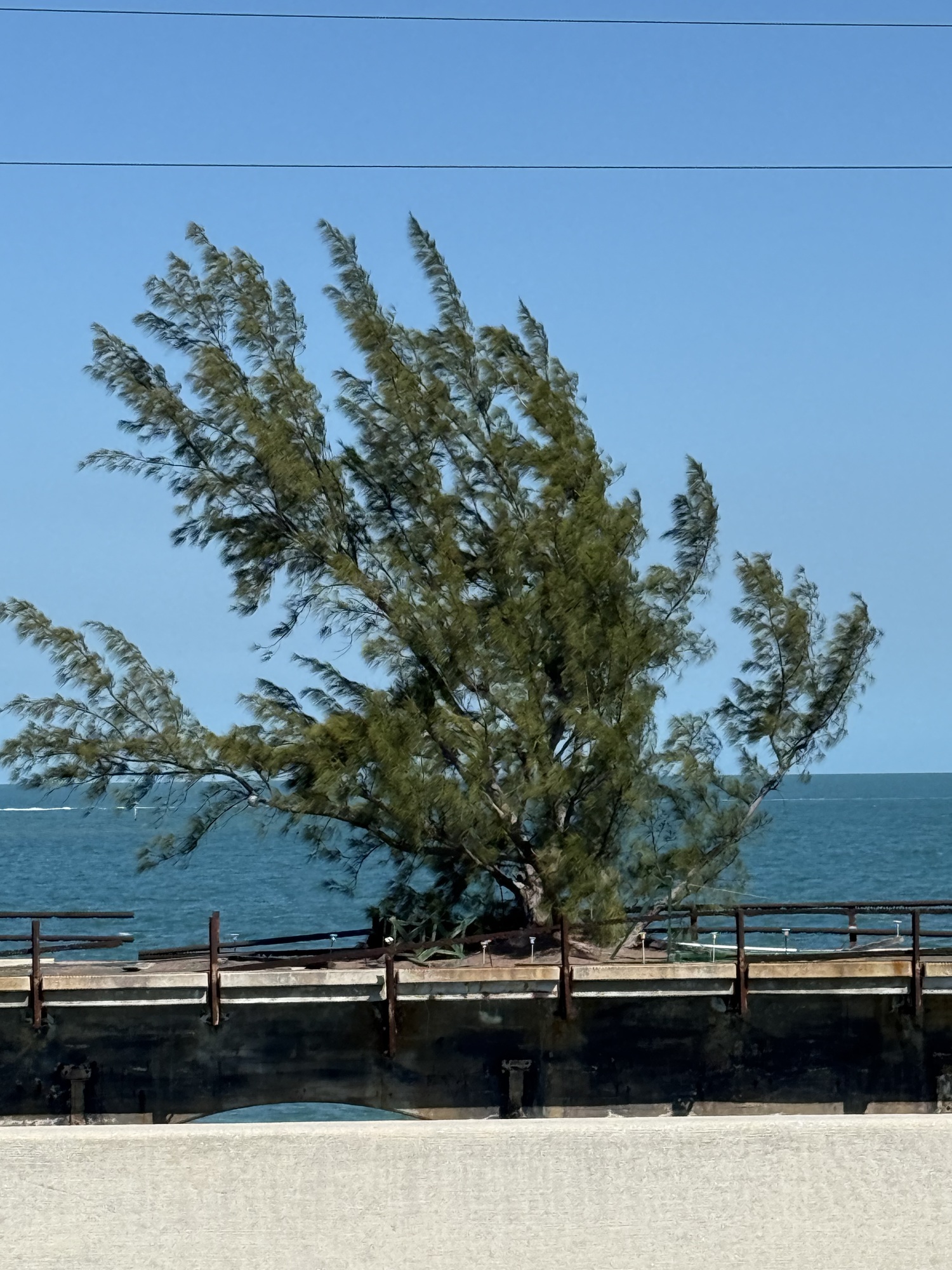 Within a couple of miles, around Mile Marker 42, I came to Fred the Tree, a salt-sprayed Casuarina, aka Australian pine tree, growing out of the roadbed of the historic Old Seven Mile Bridge. He started out in humble beginnings (shit dropped from the butt of a bird), but over the years he's become a living symbol of the resilience of the Keys and its people.