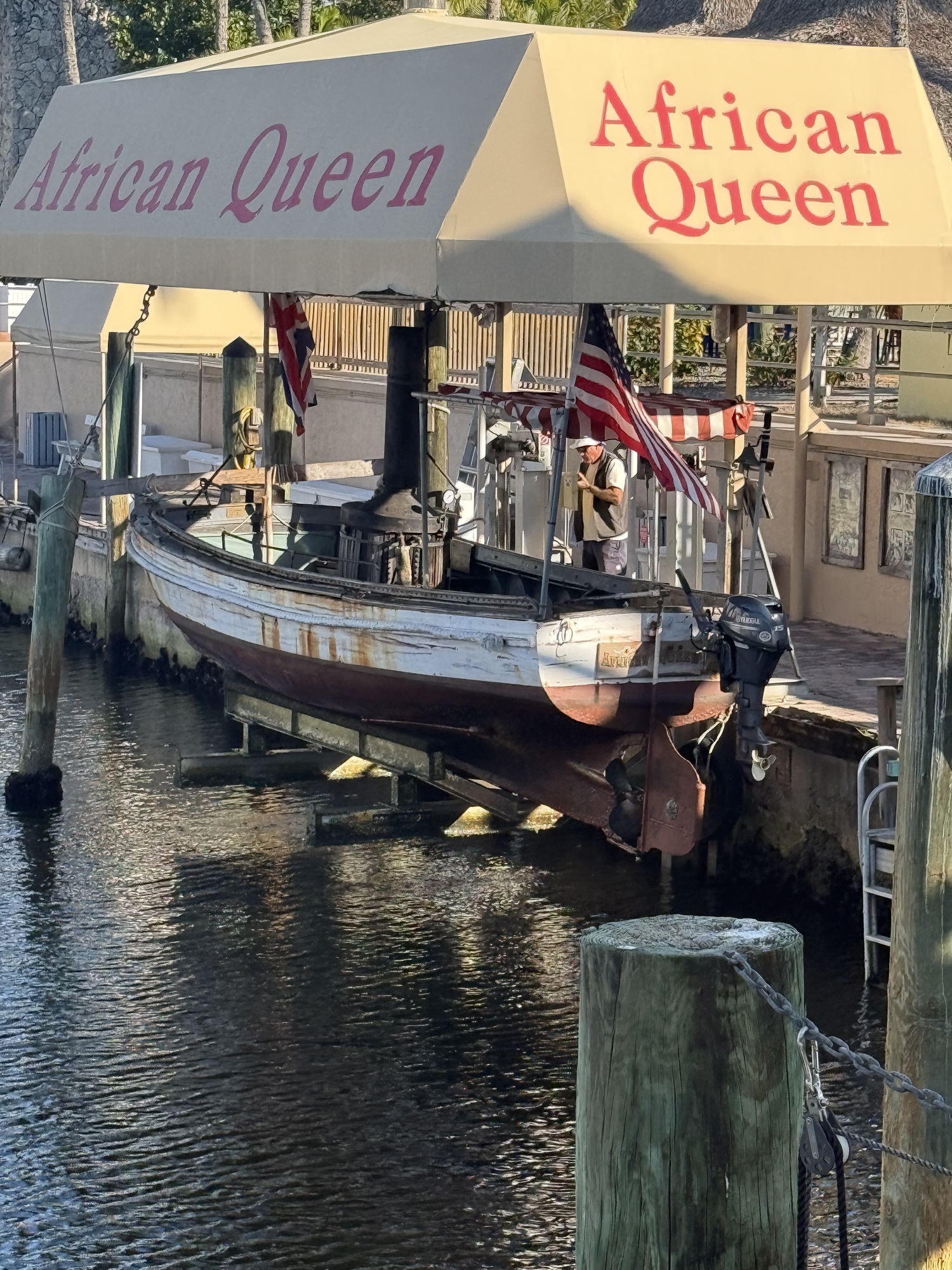 At 4:45 I realized that I should go over to my next Point of Interest, the African Queen. This is the boat in the 1951 movie of the same name, starring Humphrey Bogart and Katharine Hepburn. It was built in 1912, in England, and originally used in Africa to transport cargo, missionaries, and hunting parties across the Victoria Nile. When director John Huston saw it during a hunting trip he chose it because of the riveted steel design and the vertical boiler.