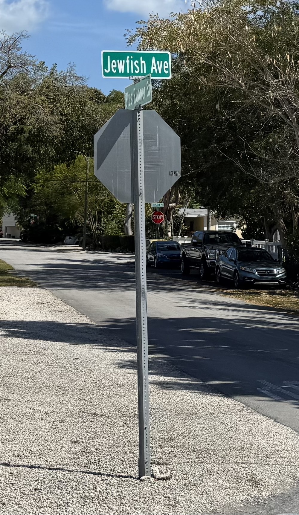 Shortly after leaving OceanFirst, I passed the street sign below. I'd never heard of this kind of fish so I googled it and learned it's now called a "goliath grouper." In 2001, the American Fisheries Society changed the name after complaints that the nickname was culturally insensitive. Here in the Key Largo area, there's still an unincorporated community, a creek, and a bridge with that name.