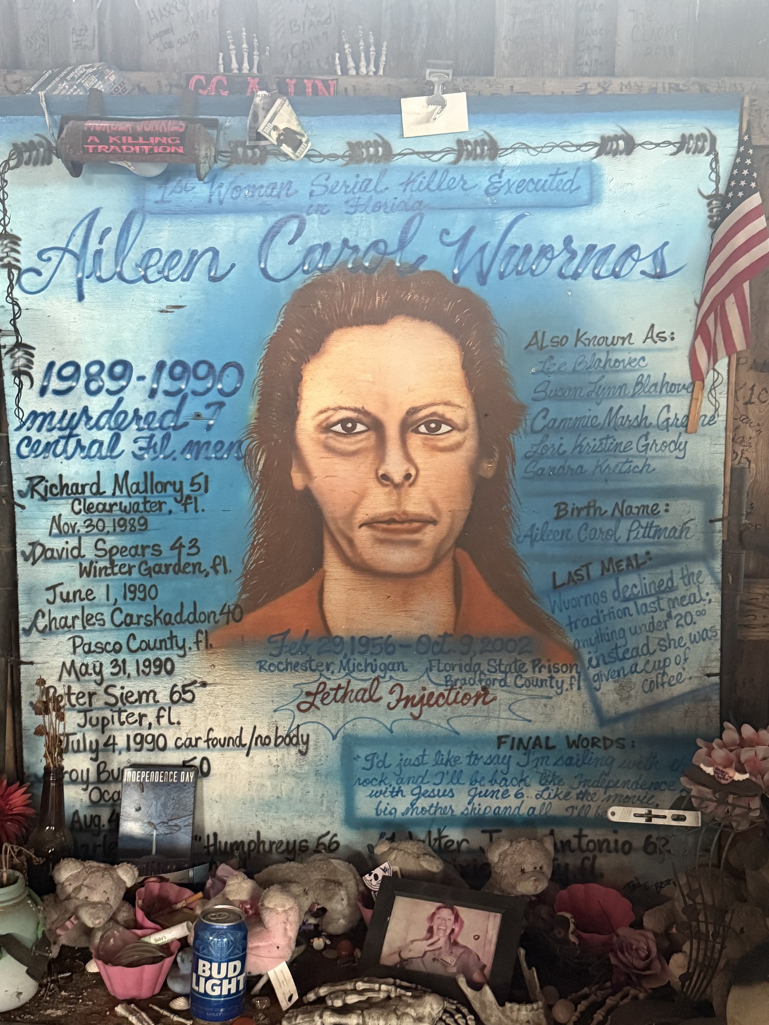I think I made his day, and he mine. My tour guide's name is Bill, a transplant from Pennsylvania twelve years ago. We slipped out the side door where he showed me what can only be described as a shrine to Aileen Wuornos.