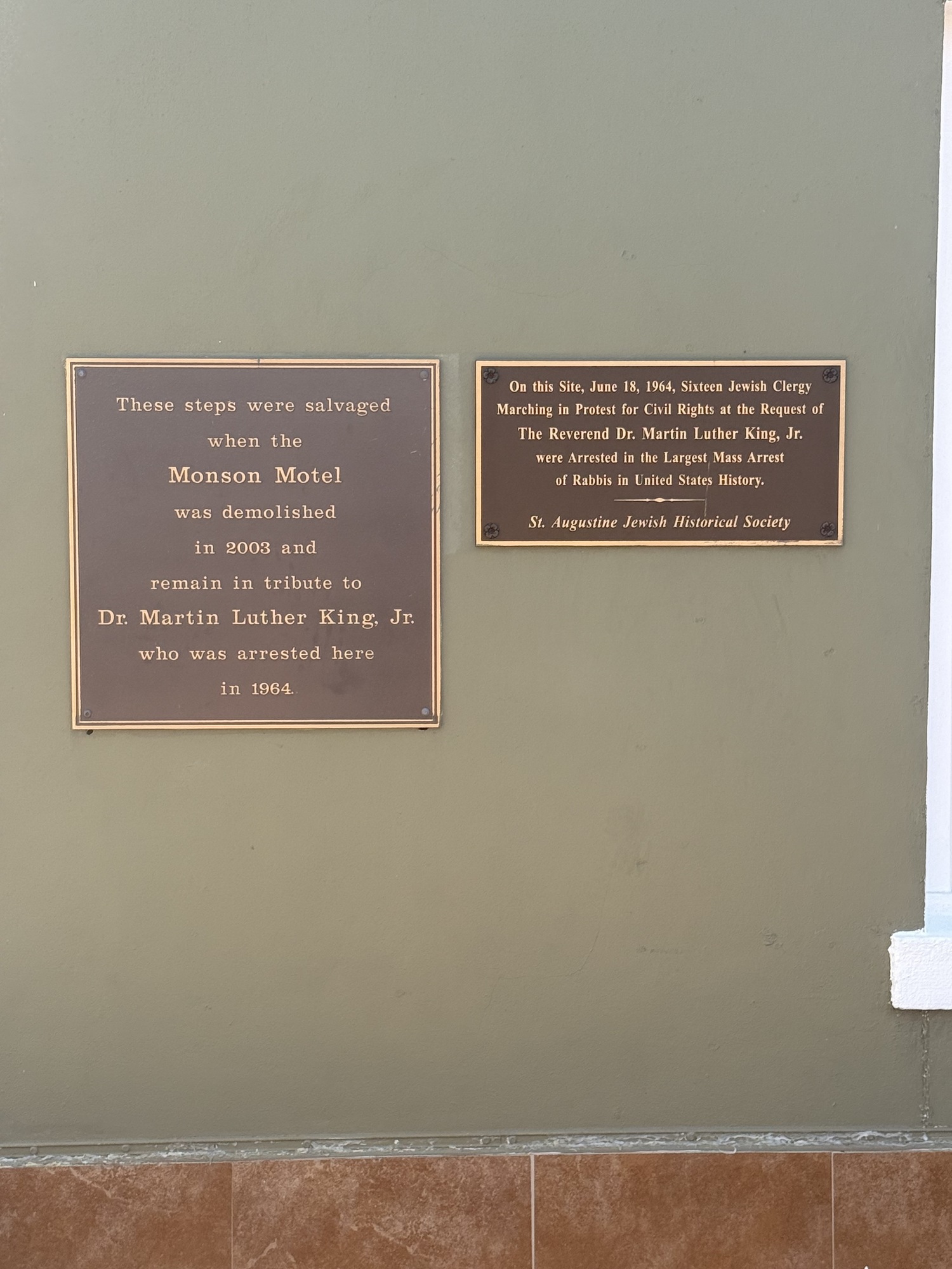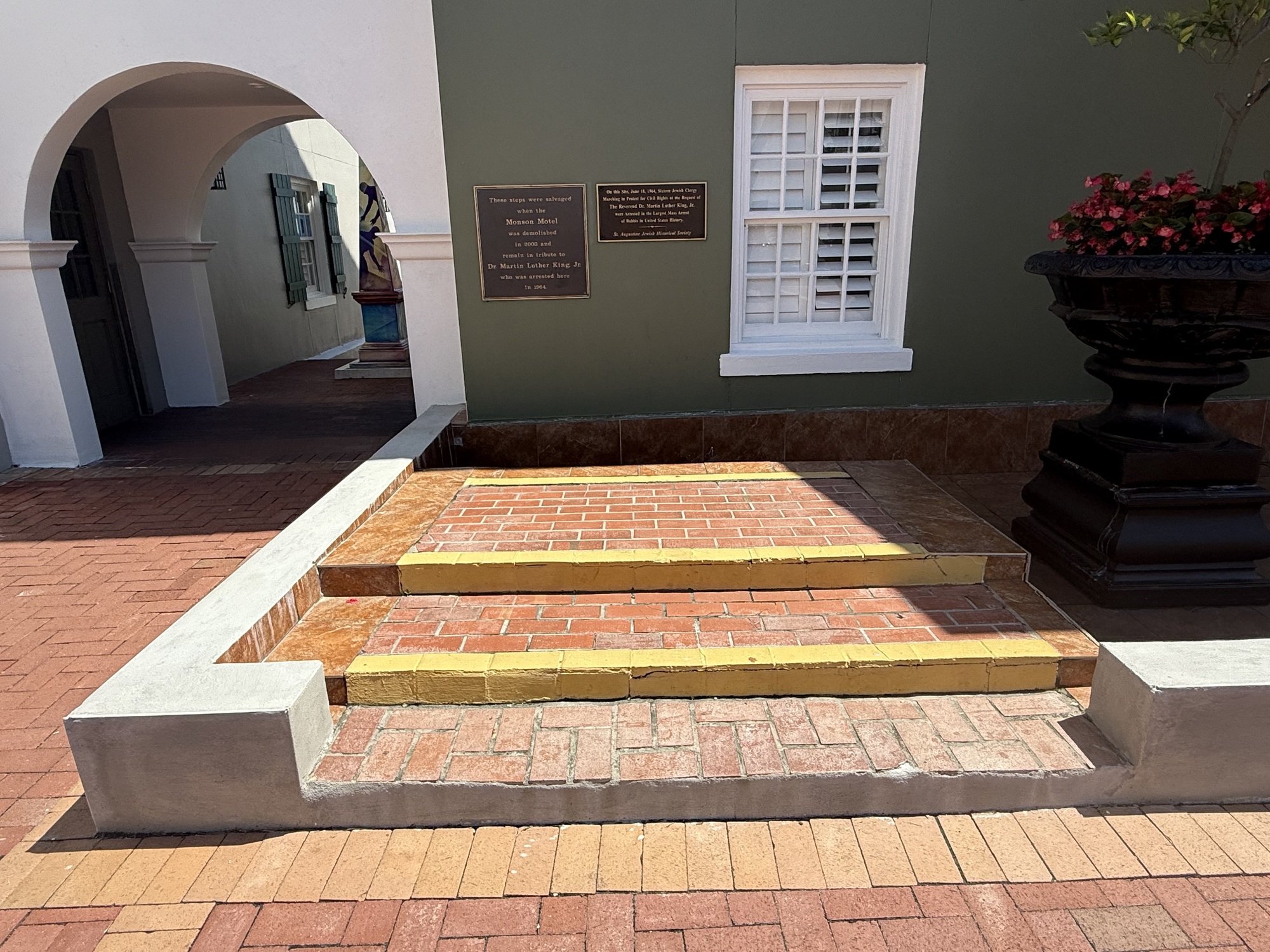 These steps were tucked away off the street and around a corner. They were salvaged from where Martin Luther King, Jr., was arrested for the crime of “trespassing,” that is, entering the Monson Motor Lodge & Restaurant, a “Whites Only” establishment. This motel was also the scene of an infamous hate crime in which the owner poured acid into a swimming pool of anti-segregationists. It was leveled in 2003, but these steps were preserved as a reminder of our history.