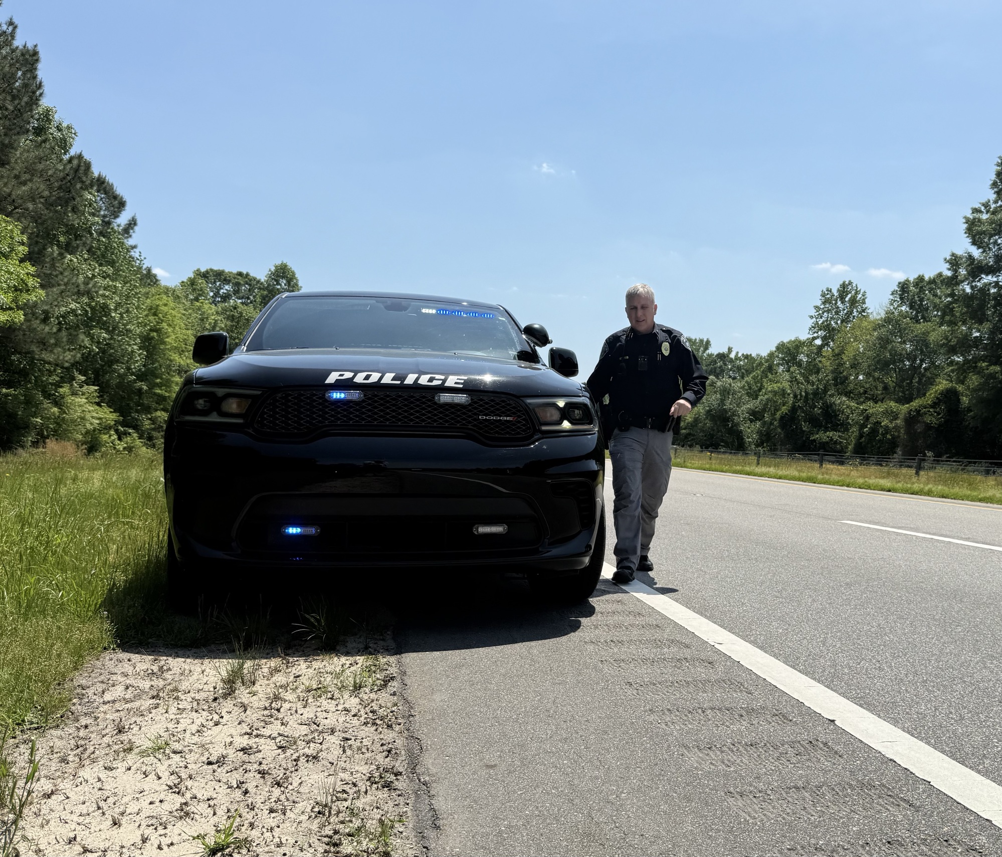 I asked him for his name (“Lt. Miller”) and thanked him for his help. Once back in the car he drove slowly behind me in the right lane with his flashers on, protecting me from the passing cars. When we arrived at the intersection to turn left, he blocked both lanes, then again with the oncoming traffic on the opposite side. After that, he followed me to Business 1 to make sure I didn't miss it. As I turned right I gave him a thumbs up (actually, it was a single thumb up because I needed my other hand to stay on the handlebars) and he turned back to Southern Pines.
