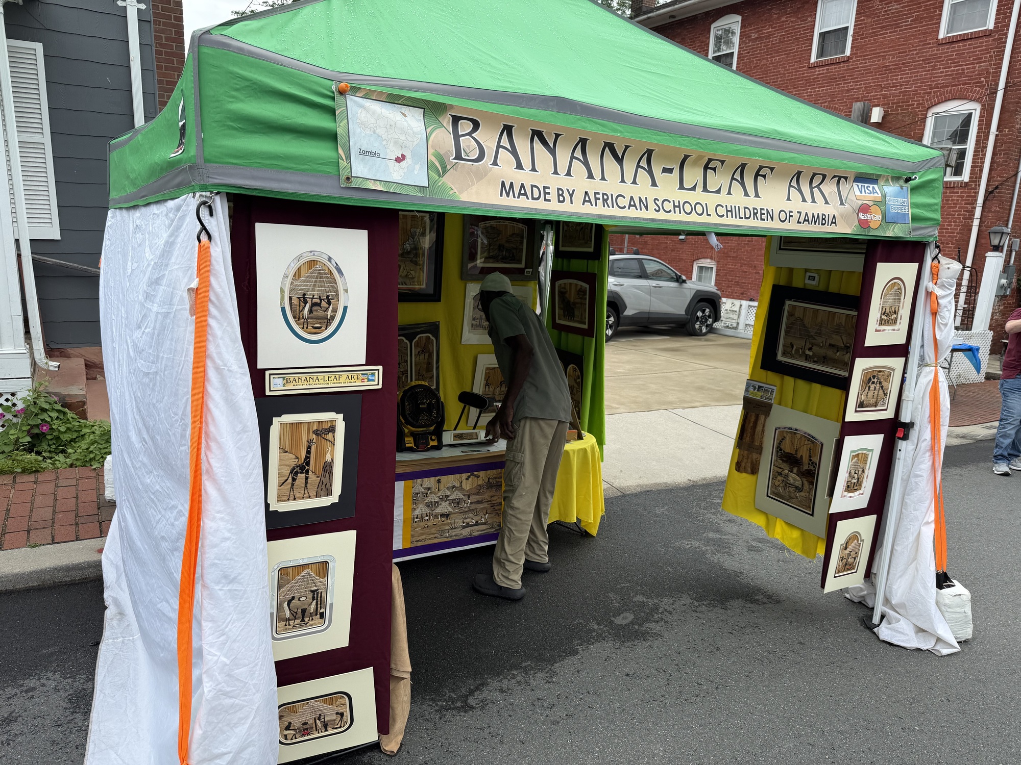 I bought a mocha and what I thought was a chocolate croissant, but turned out to be some type of Middle Eastern equivalent. Still tasted good, though. As I was enjoying my snack, the rain started coming down more heavily, to the point where I wanted some shelter so I could finish eating. I saw a booth with a little extra space inside and a couple of friendly-faced vendors, so I asked if I and my bike could hang out in their tent for a few minutes until the worst of the squall passed.