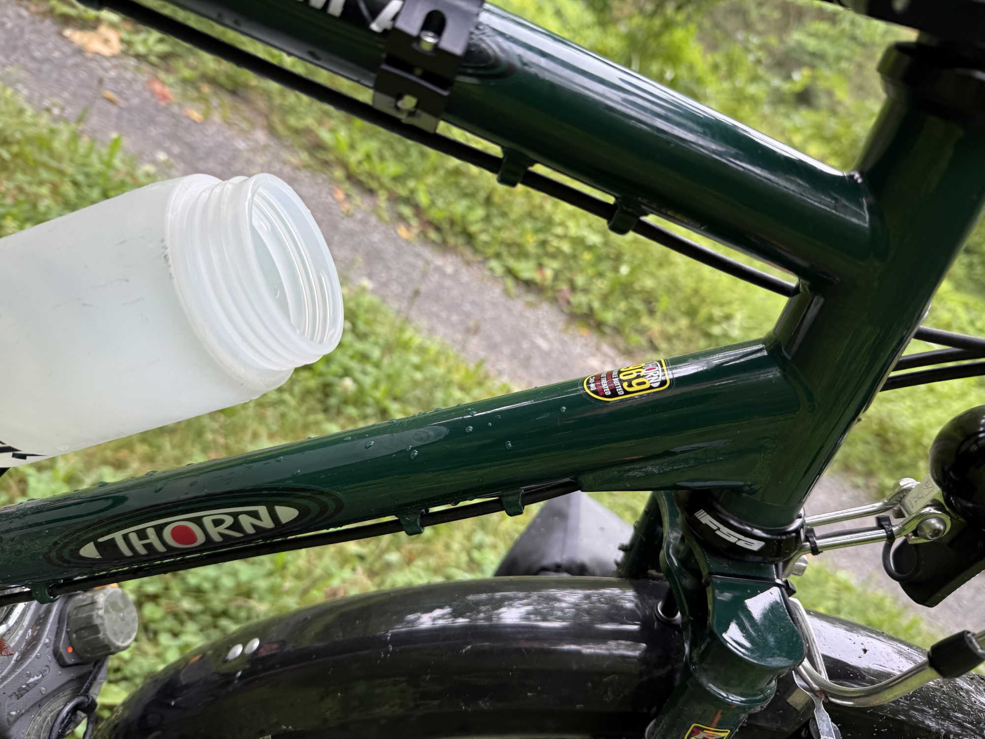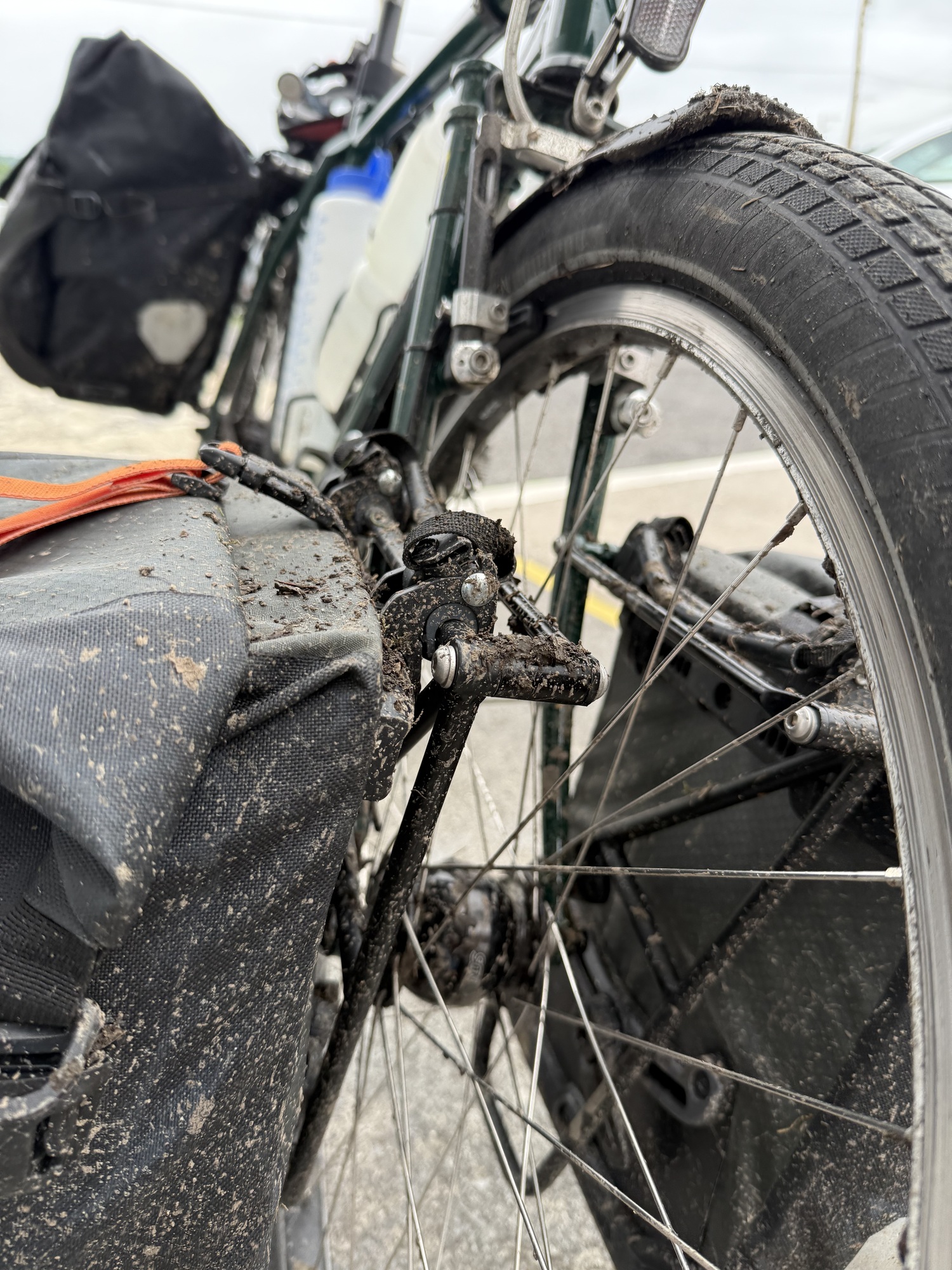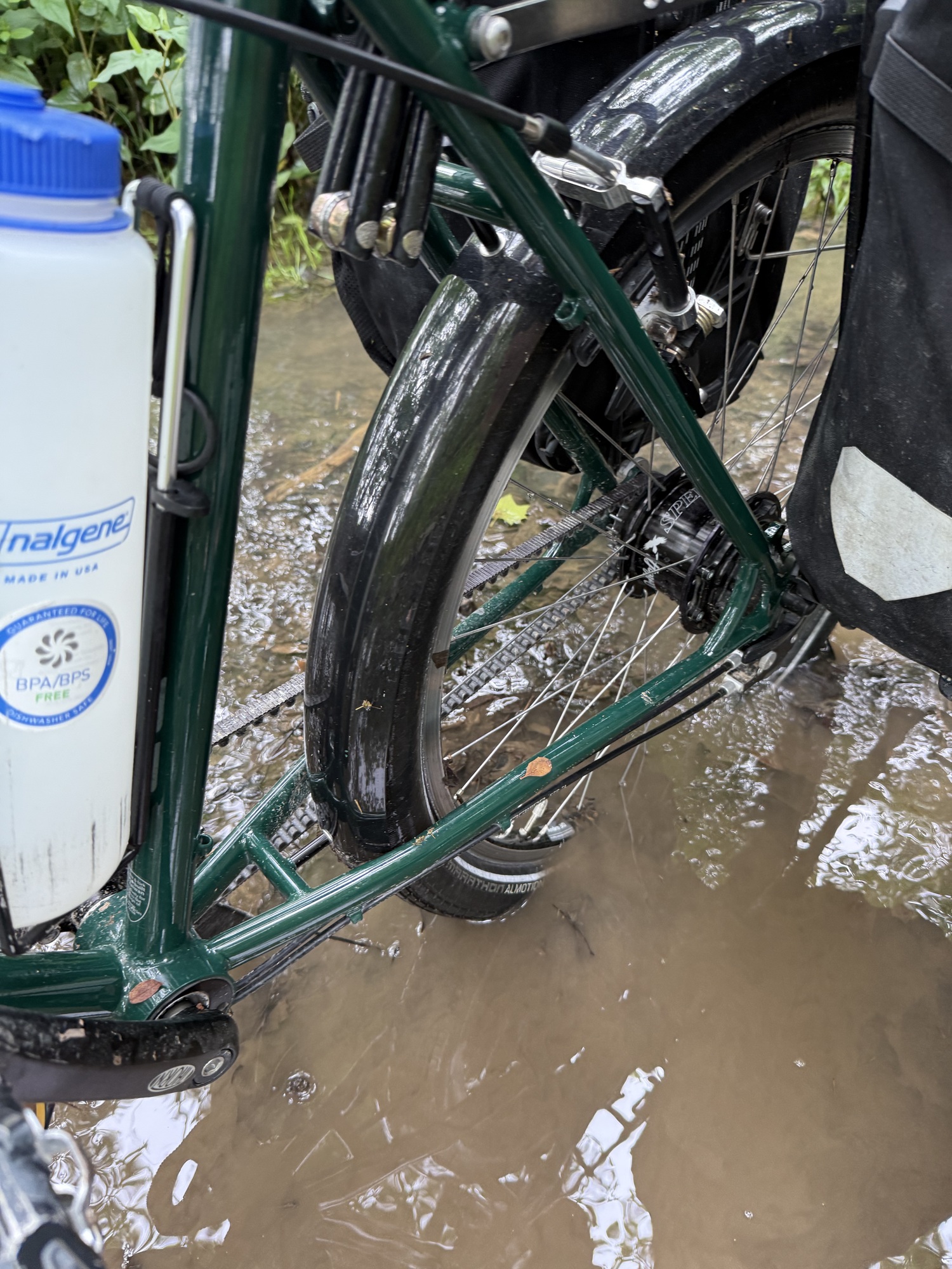 This was a really good day to have fenders, an internally-geared hub instead of a derailleur, and a belt drive instead of a chain. There was a water hose and towels at the cabins so I was able to wash everything down.