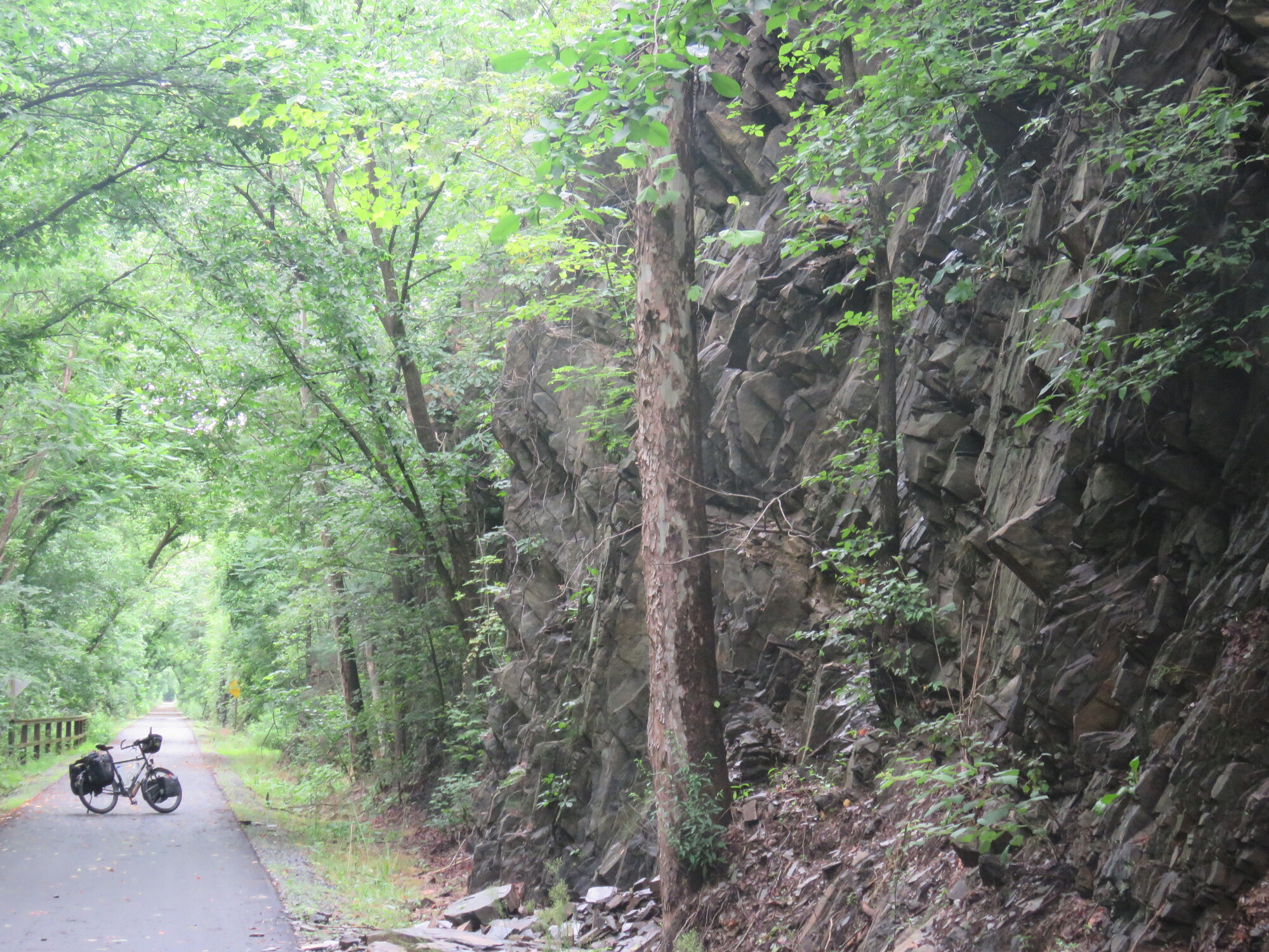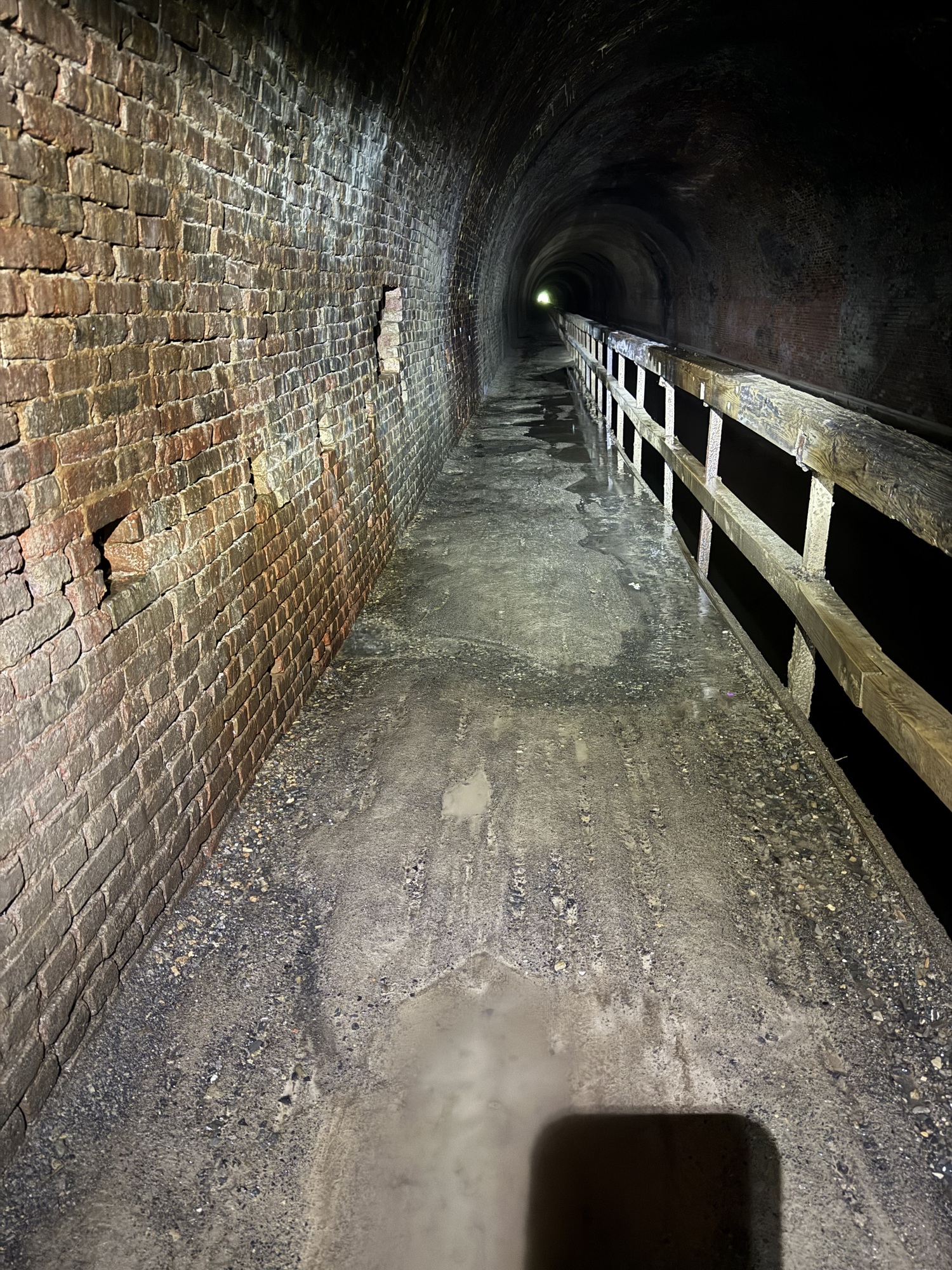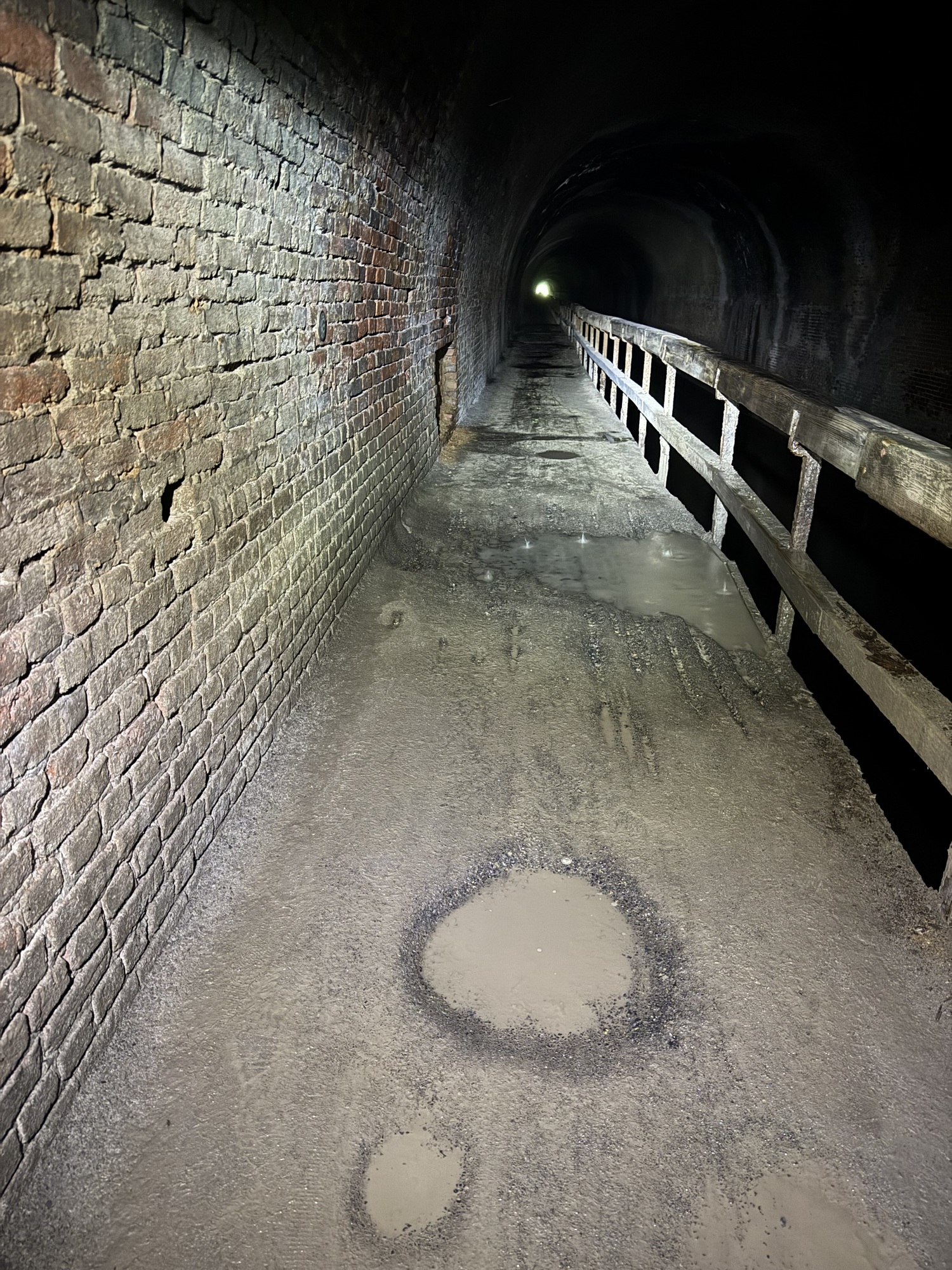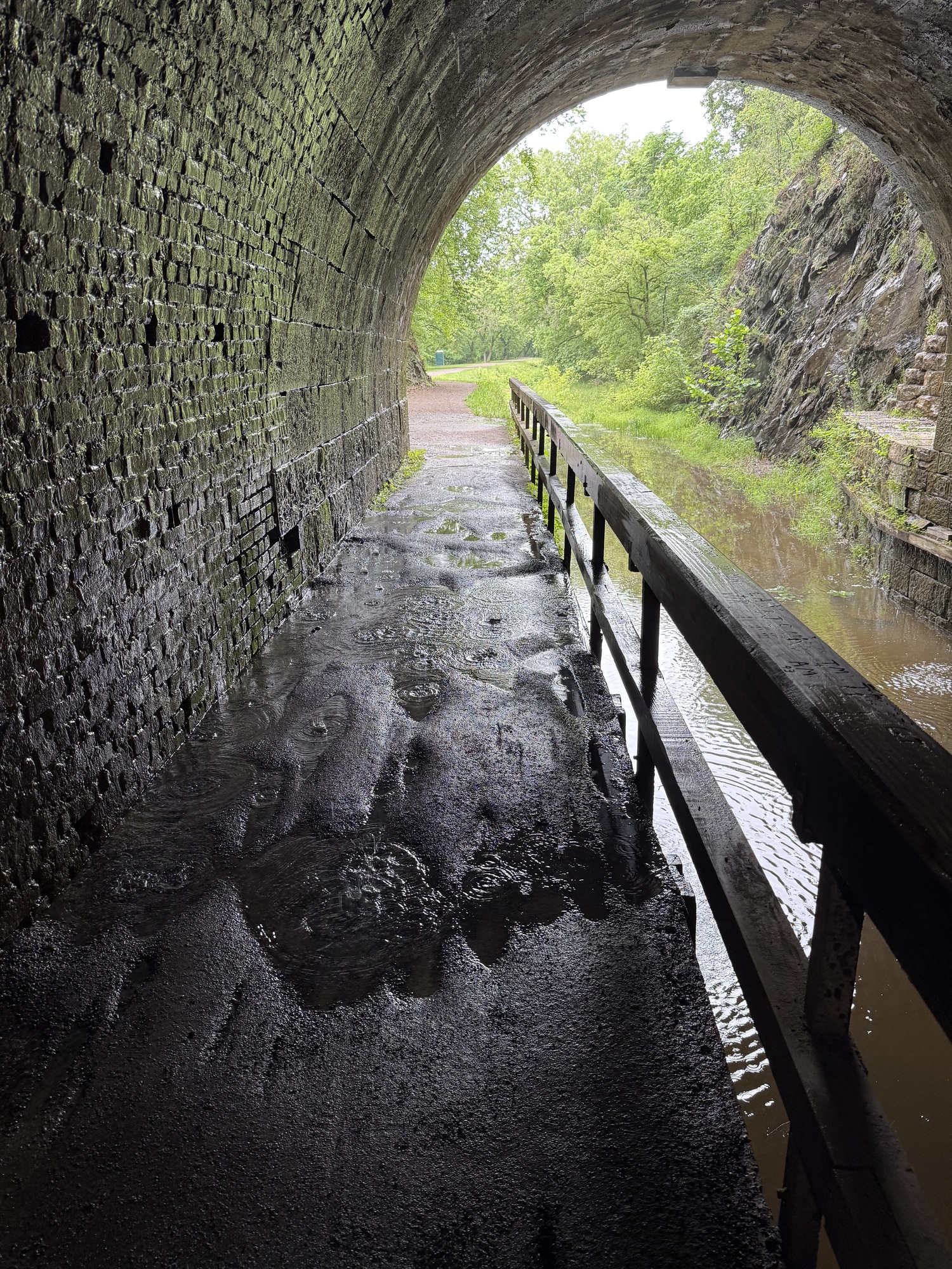 There's no way I could safely pedal through the Paw Paw tunnel. The floor was not only uneven, but pocked and slippery. If my handlebars bump the wall, down I go. If my handlebars bump the wooden rail, down I go. On the right side of the railing is a short fall to some water the color of shiny tar. I used my bike like a scooter, standing on the right pedal and pushing myself along with my left leg.