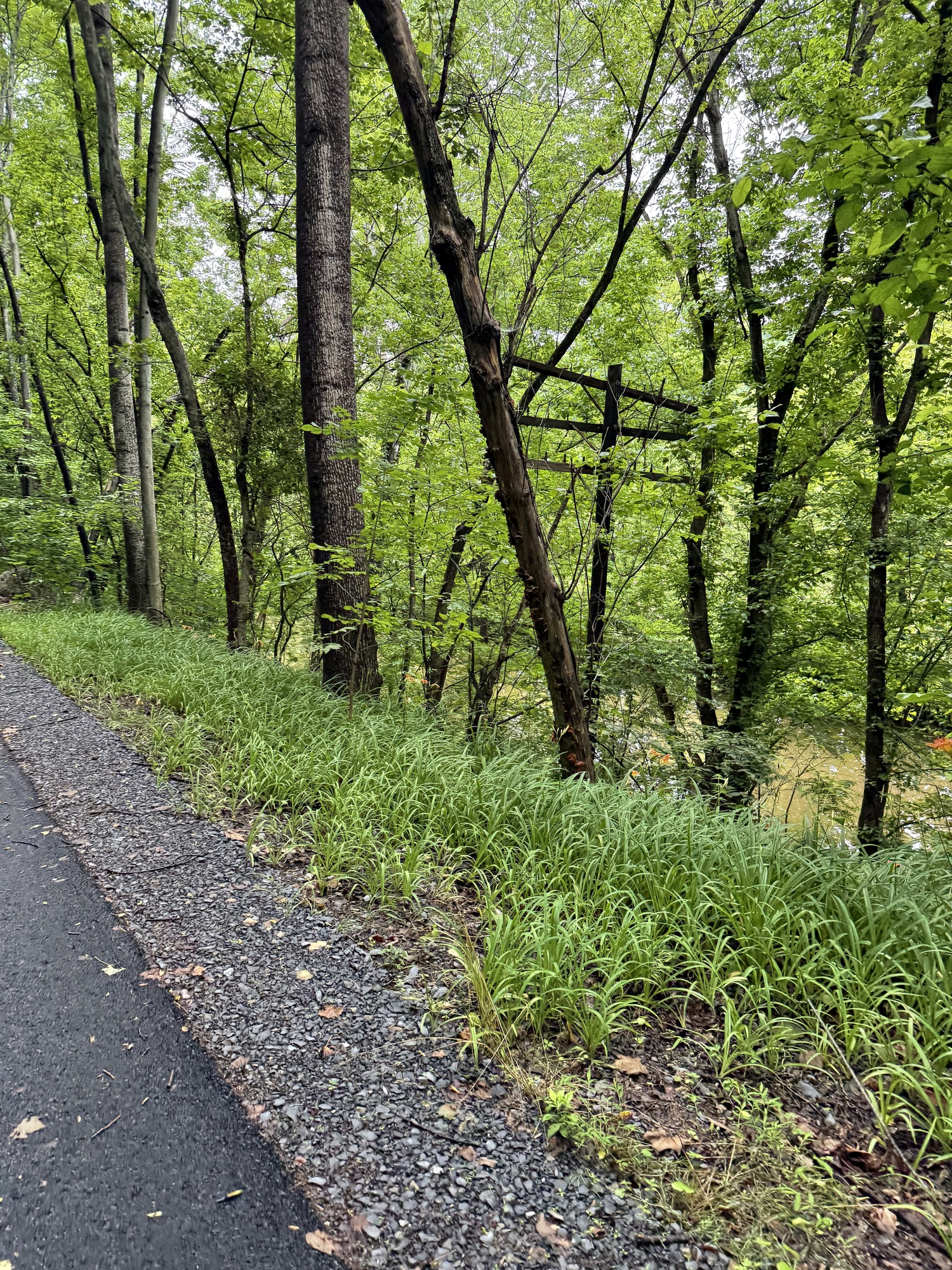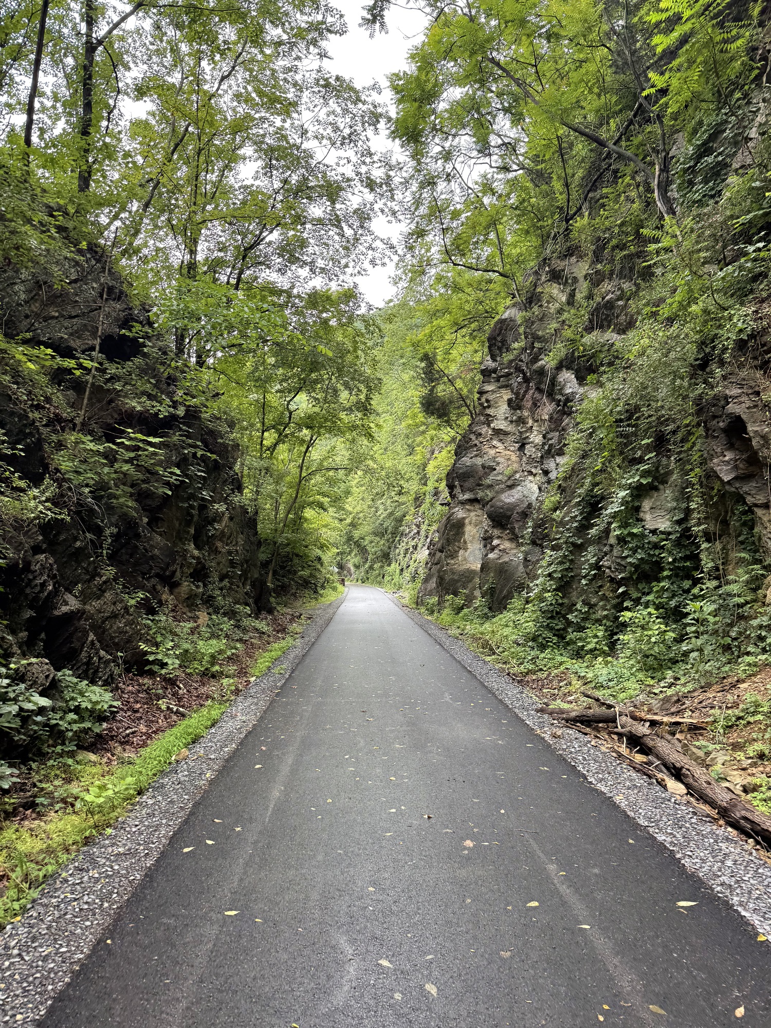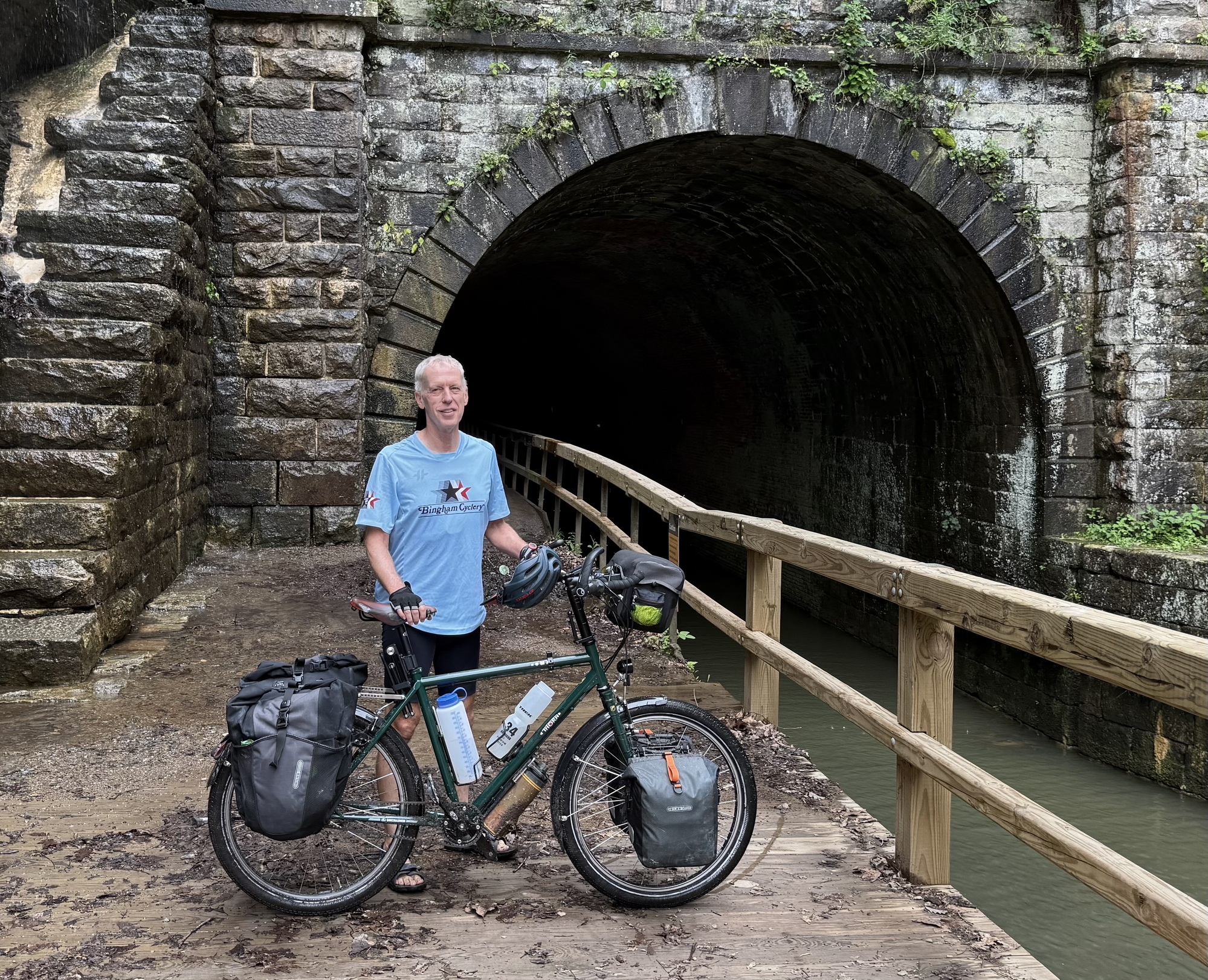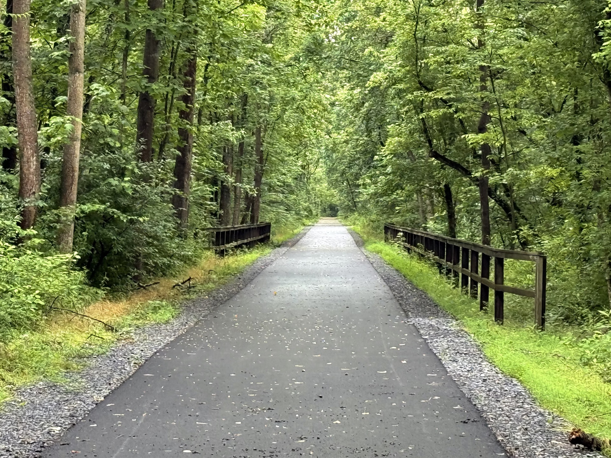 There's no way I could safely pedal through the Paw Paw tunnel. The floor was not only uneven, but pocked and slippery. If my handlebars bump the wall, down I go. If my handlebars bump the wooden rail, down I go. On the right side of the railing is a short fall to some water the color of shiny tar. I used my bike like a scooter, standing on the right pedal and pushing myself along with my left leg.