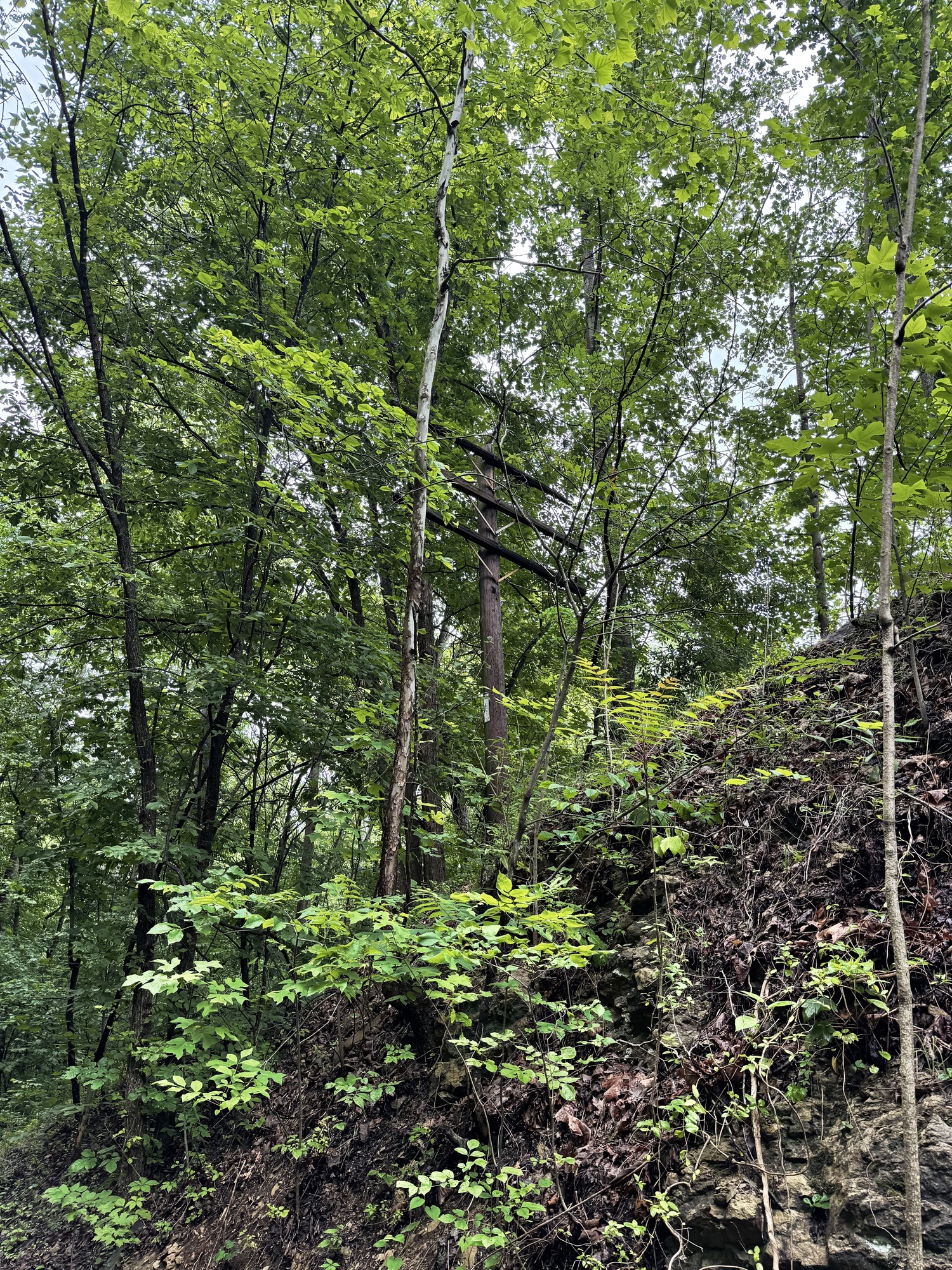 Very old telephone poles appear at regular intervals just off the trail, many of them now becoming almost invisible as they blend in with the forest which has grown up around them.