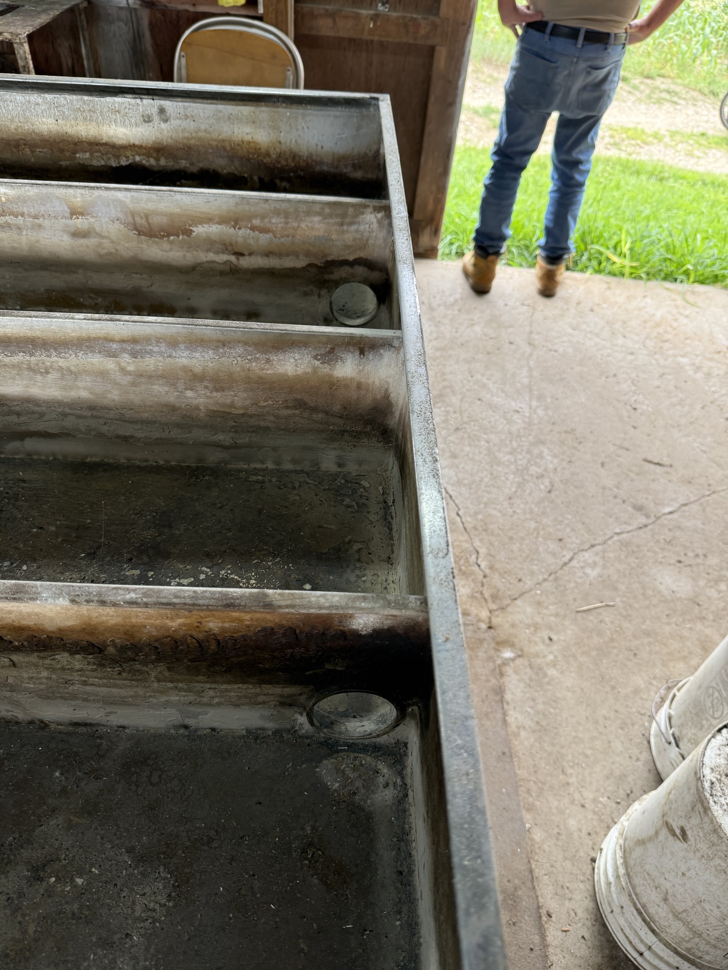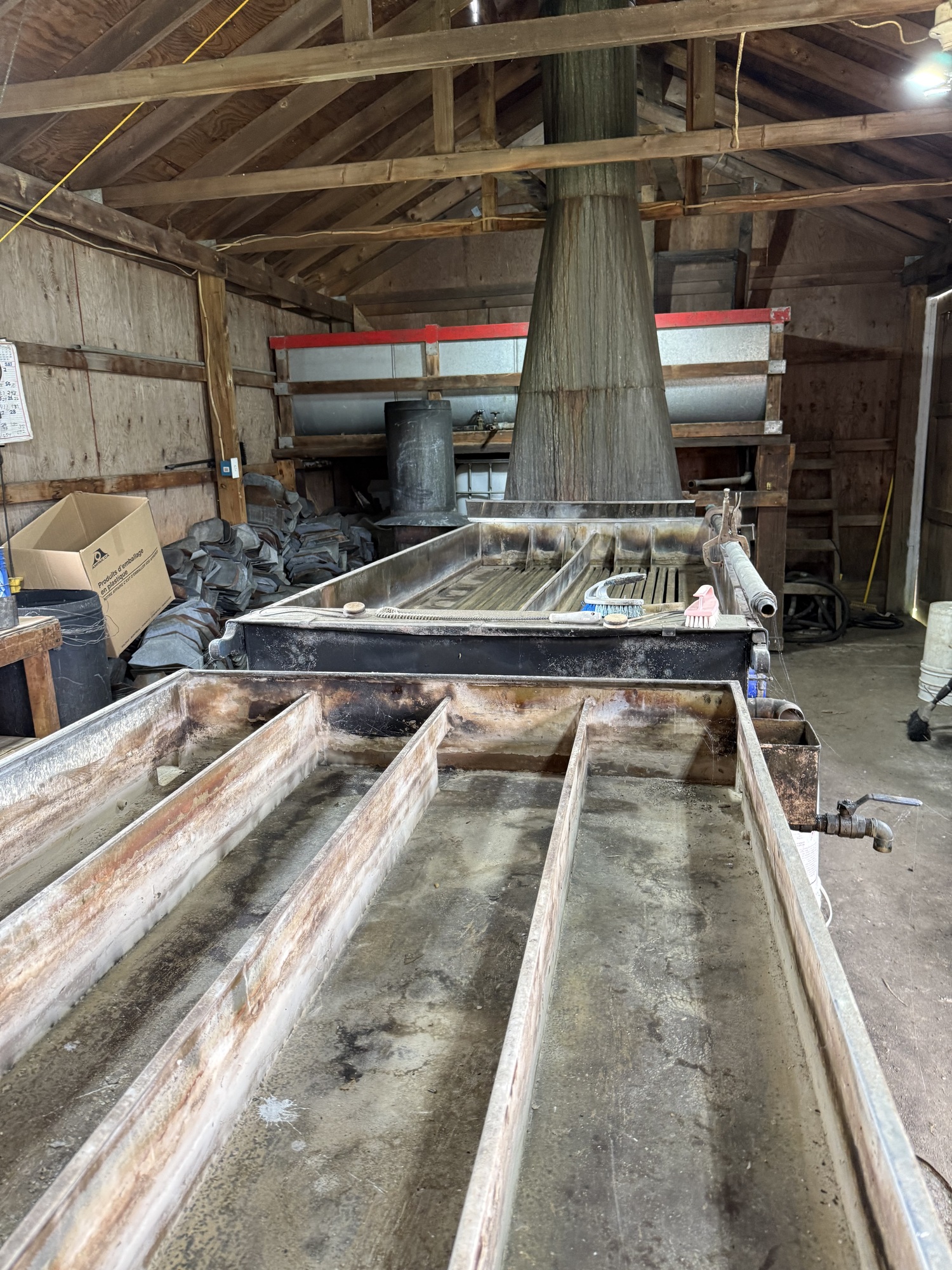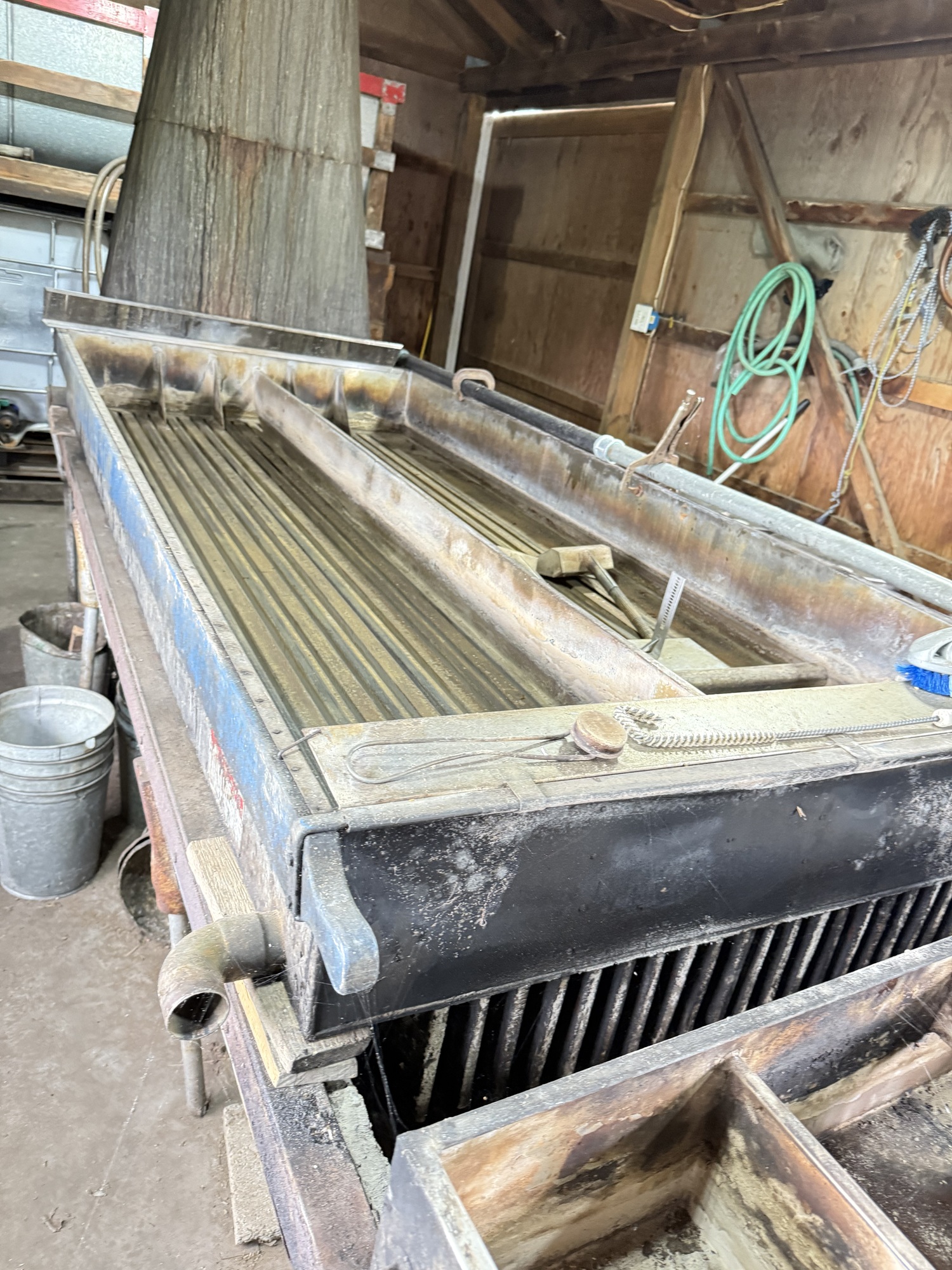 What I learned: * It takes forty gallons of sap to make one gallon of syrup. * "A sugar bush" is a grove of maples. * How much sap they get depends on the temperature, and the best time to tap is in the Spring. The trees have been hibernating all winter and sense the temperatures becoming warmer. When the thermometer climbs above freezing then the sap rises, and if it drops below freezing the sap drops. Therefore, if it's above and below freezing on the same day then they can get two "runs." * Bacteria can start growing in the sap or syrup if it sits in buckets or tanks too long. * The sap is in the xylem and phloem, just under the bark, which is how deep you want to hammer in the spile. * Jim, his brother Jeff, a cousin, and a nephew do 1-3 taps per tree, and 1500-2000 taps per season over 4-6 weeks. They alternate sugar bushes, and just the collection part takes about 5-6 hours daily, which involves a lot of slogging through forests with heavy buckets of sap. They pour the buckets from the trees into 5 gallon buckets, then dump those buckets into 200-300 gallon tanks. From there it goes into the 700 gallon tank in the Sugar House where the boiling takes place. * They use a wood fire to boil the syrup, but a lot of other places use propane. Many producers use flexible piping to connect multiple trees in a sugar bush. Gravity then causes the sap to flow to a large collection tank. It's convenient and less labor intensive, but the downside is that it's also unsightly because it's left in place year-round. * The sap initially runs through a reverse osmosis filter that reduces the water by 50% while doubling the sugar content of the raw sap - that helps reduce boiling time. * Then the sap is boiled to make concentrate, after which it goes into a pan (about 4 X 12 feet) with a fire underneath. It's slightly angled, so the heavier syrup goes to the bottom and eventually to the next section. * The longer the sap sits in the tanks, the deeper the color becomes, and the more flavor it develops (although overcooking it can also darken the color). Chefs and bakers prefer darker colored syrup because of the richer flavor and the slightly thicker consistency * It then goes through back-and-forth channels, still using gravity to bring the denser syrup to the finish line. * Their Sugar Shack produces about a gallon every half hour or so, and you can tell it’s ready when the “brix” is at the goal of 70. Brix is a scale used to measure the percentage of sugar in a liquid. If someone says their syrup is “72 brix,” it means that the syrup is 72% sugar. The percentage of sugar in the syrup is checked with a hydrometer, with "seven" (i.e. 70%) being the goal. * All of that is why maple syrup typically sells for $60-$70 a gallon: They collect sap for about 5 hours, then they boil for the rest of the day. If the weather is perfect, they may work 8-10 hours/day, but it's usually longer, and even longer still if they have a good run. It can be exhausting, especially for the older guys in their 60s and 70s. * Their small family-run farm, Pioneer Ridge Tree Farm, produces 200-300 gallons of syrup every year, which requires about 12,000 gallons of sap.