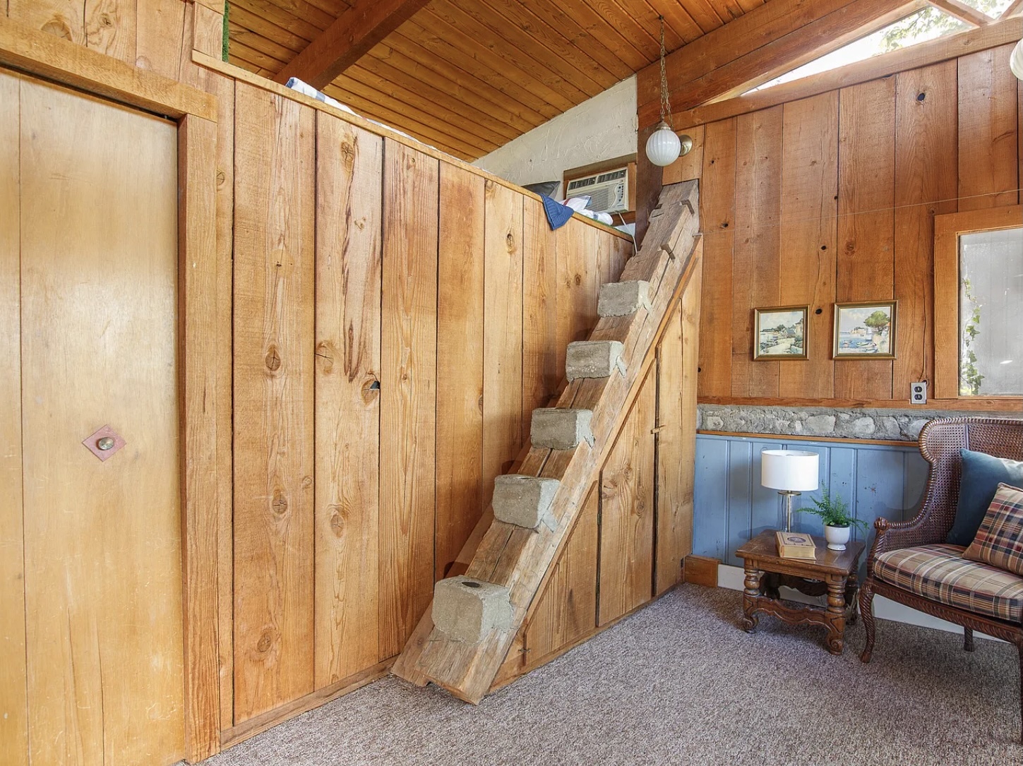 This house was built from cast off parts: the hardware came from flea markets, the ceramic tile squares under the stove came from a silo that was being torn down, studs for framing were ripped from old buildings, the marble slab to protect the wall behind the stove came from a building being razed, the wood-block countertop was once the core of a door at a school, and the siding is knotty waste strips from the sawmill. It has a high studio ceiling with a narrow band of windows across the front which lets light in, but with an overhang to block the sun.