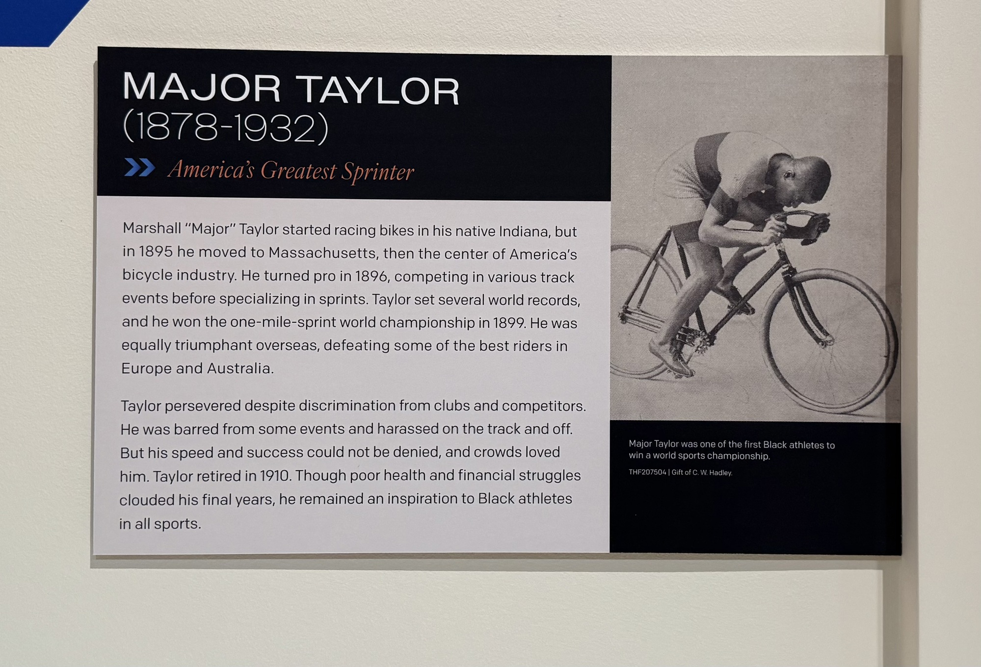 I wanted to add this poster because I'm a fan of Major Taylor. When he was 13 years old, he worked at the Hay & Willits bicycle shop, performing cycling stunts in order to promote bicycle sales. Mr. Hay, his employer, insisted that Taylor compete in a 10-mile handicapped road race organized by his store, thinking that watching this black kid "race" would be entertaining to the crowd. Never having raced before, Taylor was reluctant, but his boss insisted and, despite his lack of experience, won the race by six seconds, collapsing from exhaustion after crossing the finish line and receiving his first gold medal. This victory set the stage for his remarkable career in professional cycling.