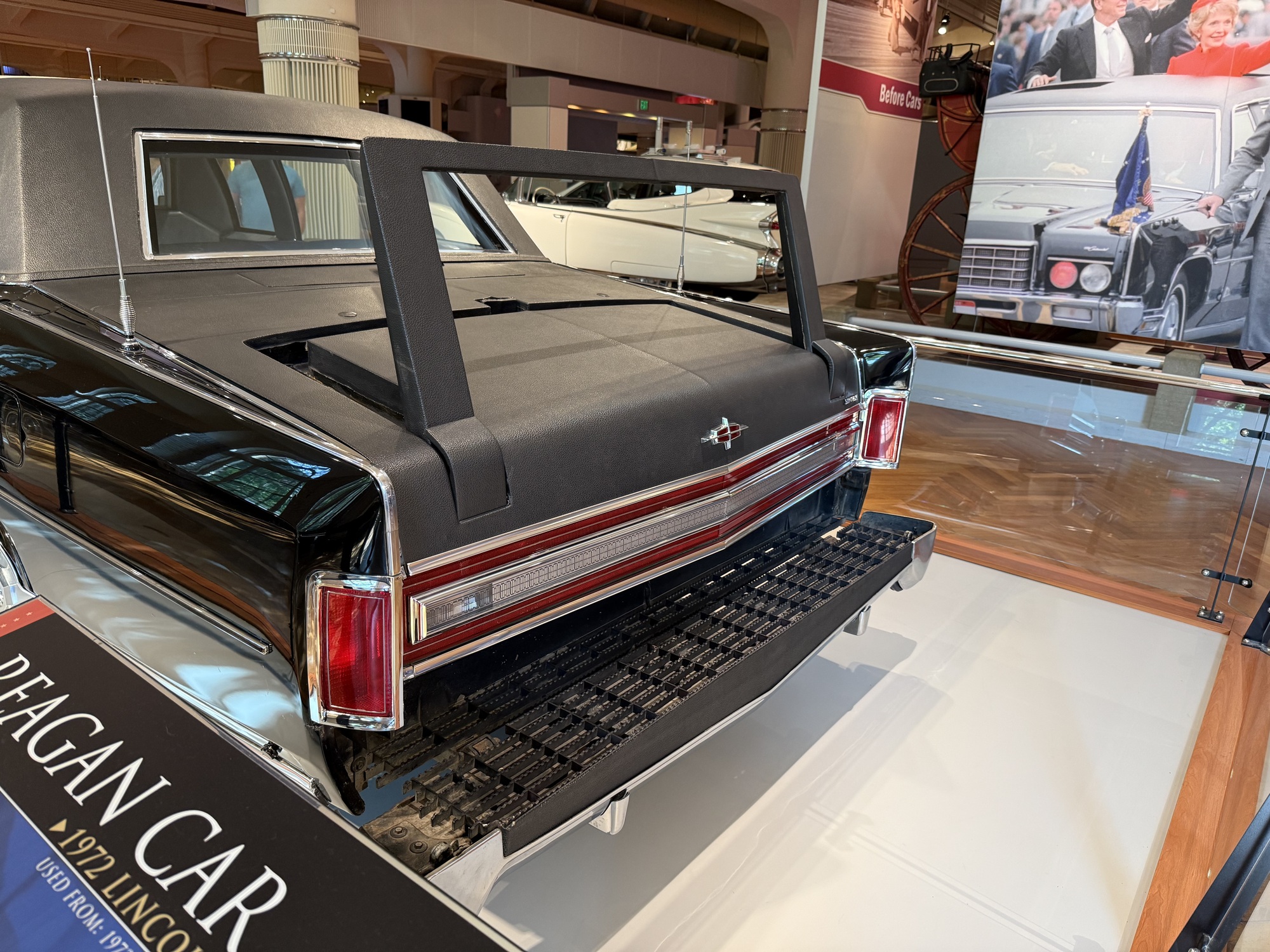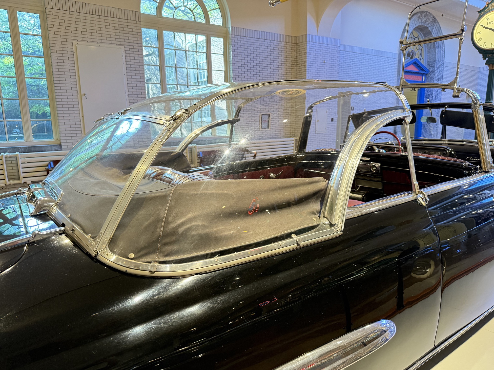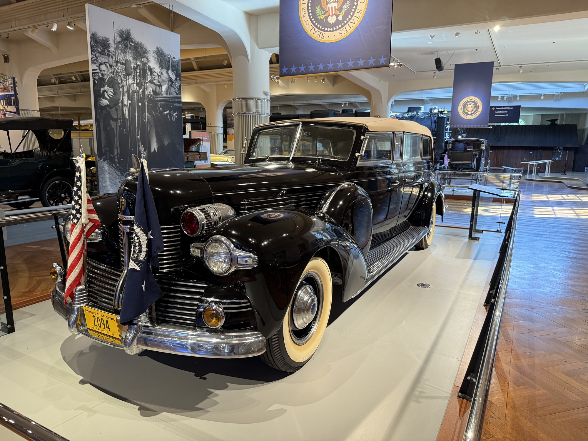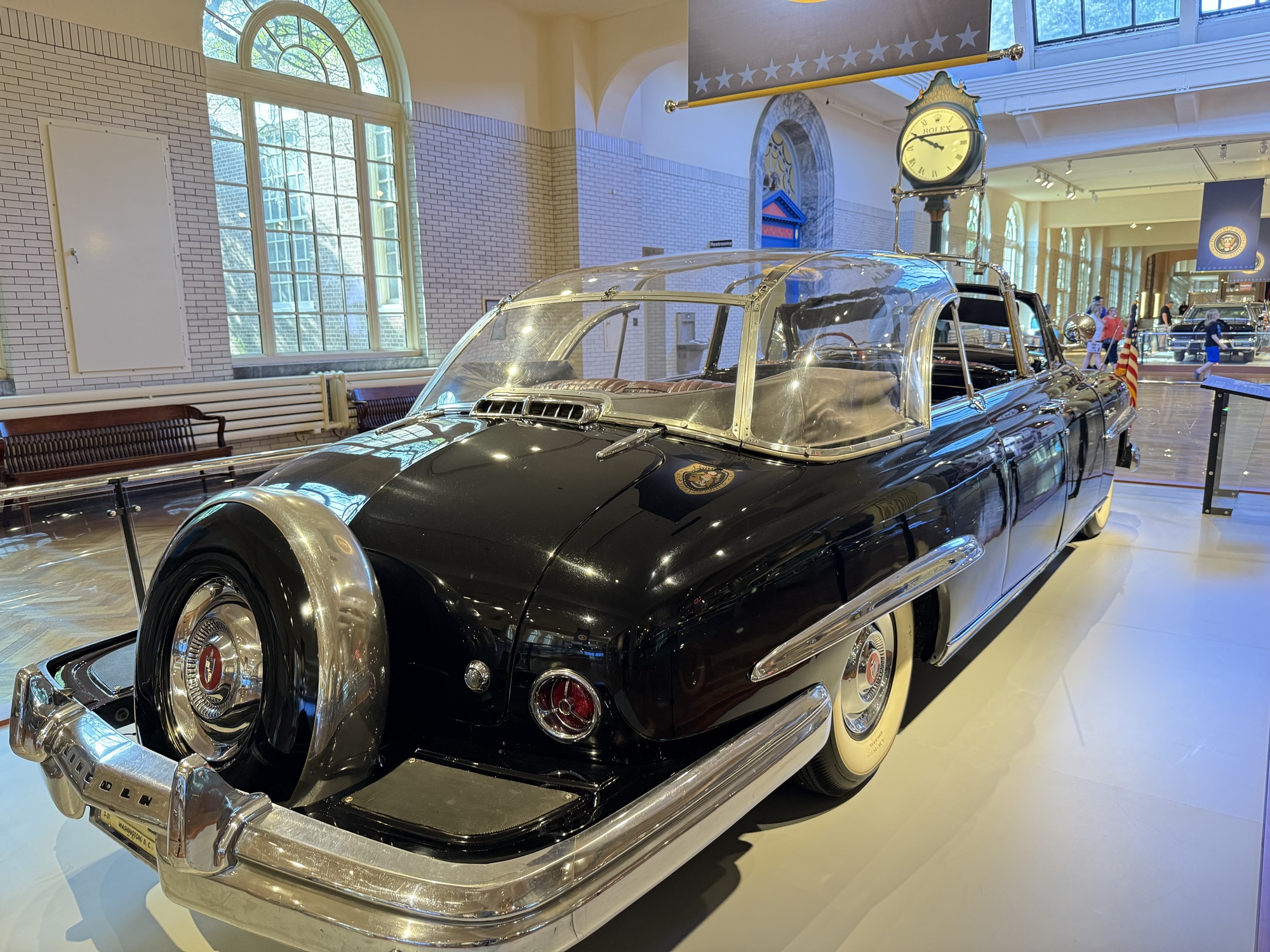 FDR's car, the "Sunshine Special," was the first car to be expressly designed and built for a President. World War 2 was looming so Roosevelt needed extra security, and after the Pearl Harbor bombing even more protective measures were added. Because of his paralysis, other features made it easier to lift him in and out of the car. This is also a convertible - Roosevelt enjoyed riding in public, and the top was often down so he could greet the crowds.