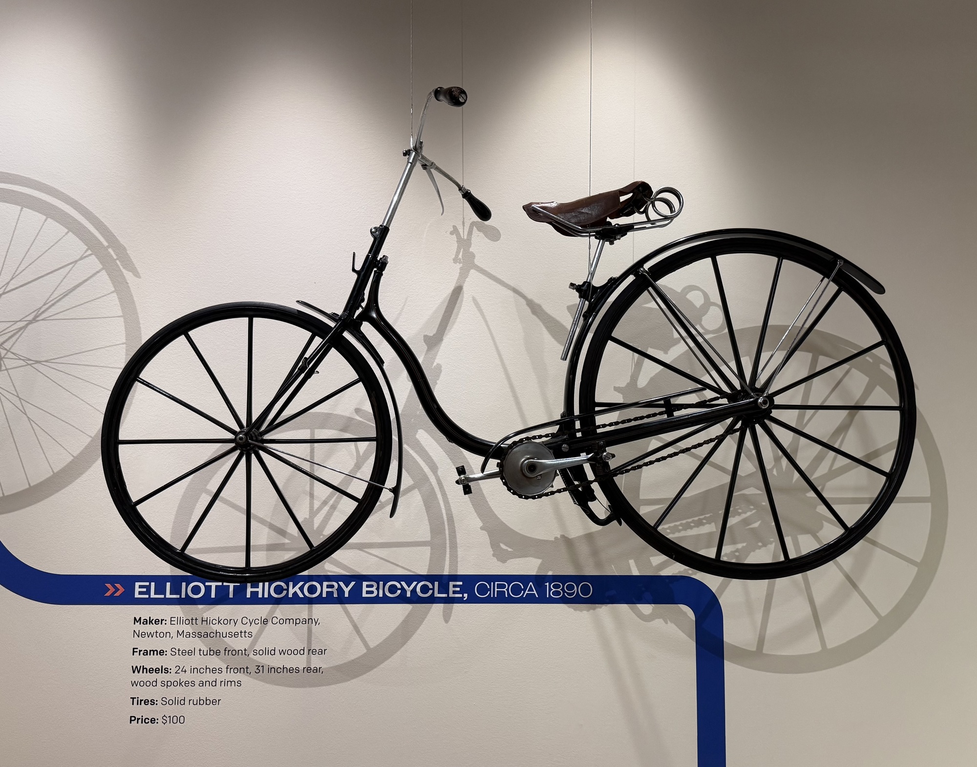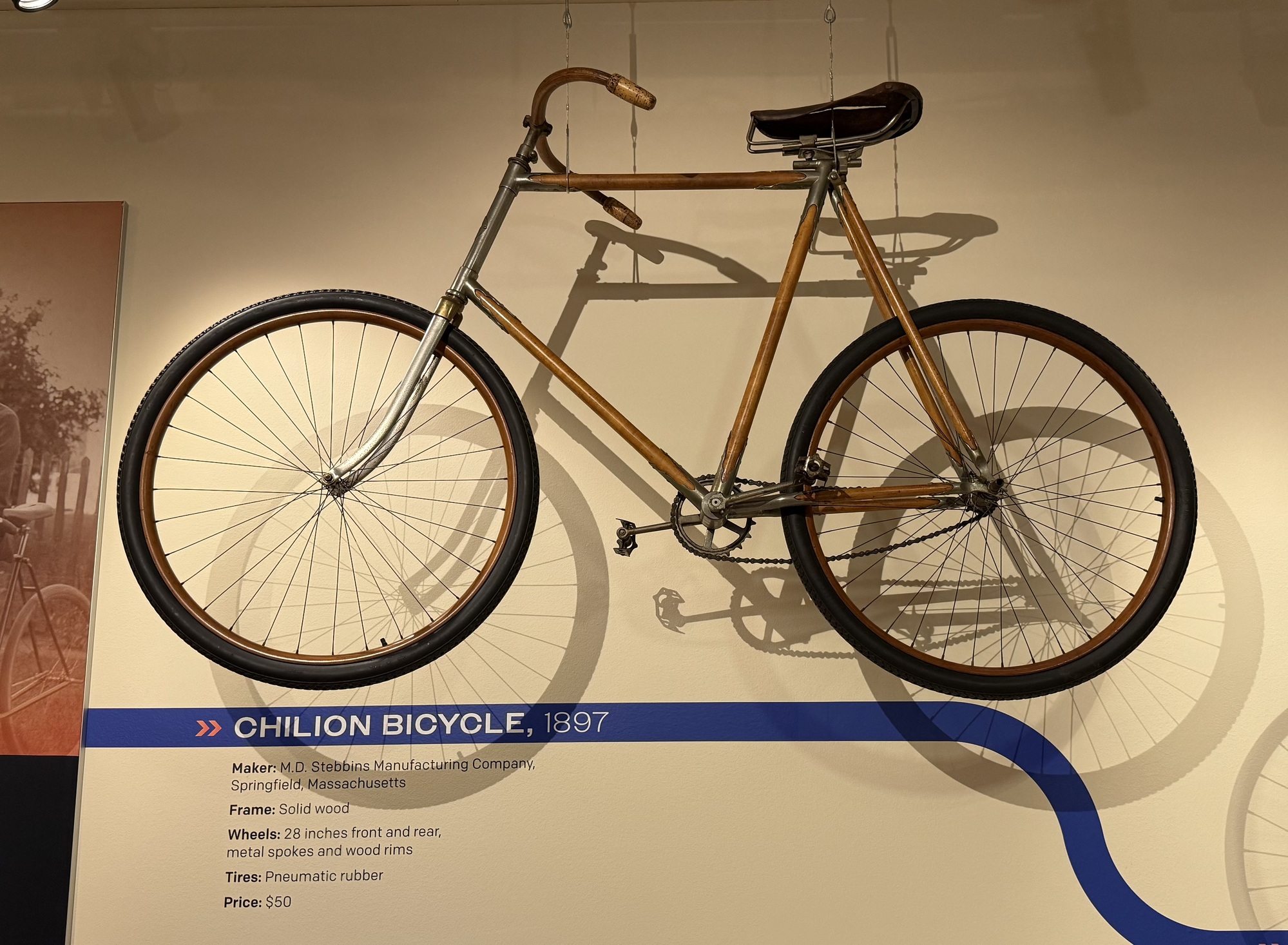 Makers of the Chilion stressed that it has a hickory frame, and therefore wouldn't rust or buckle like others made at the time. It has no brakes, and the crank doesn't freewheel, so the rider has to backpedal in order to stop. It's also one of the first bikes to have air-filled tires, which offered a more comfortable ride but were easily punctured.