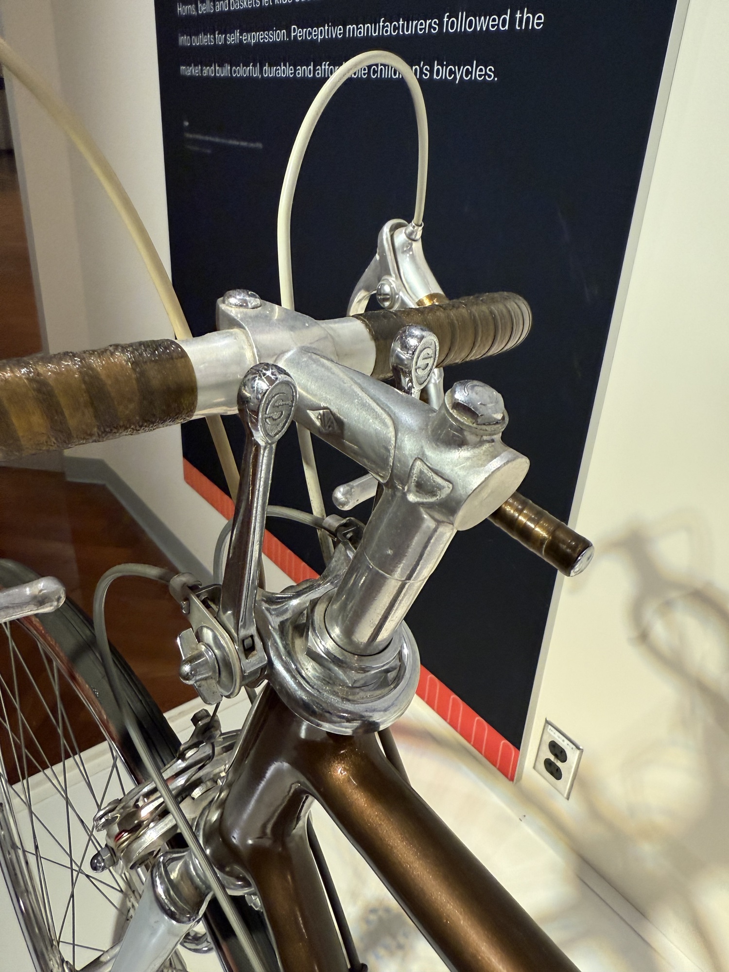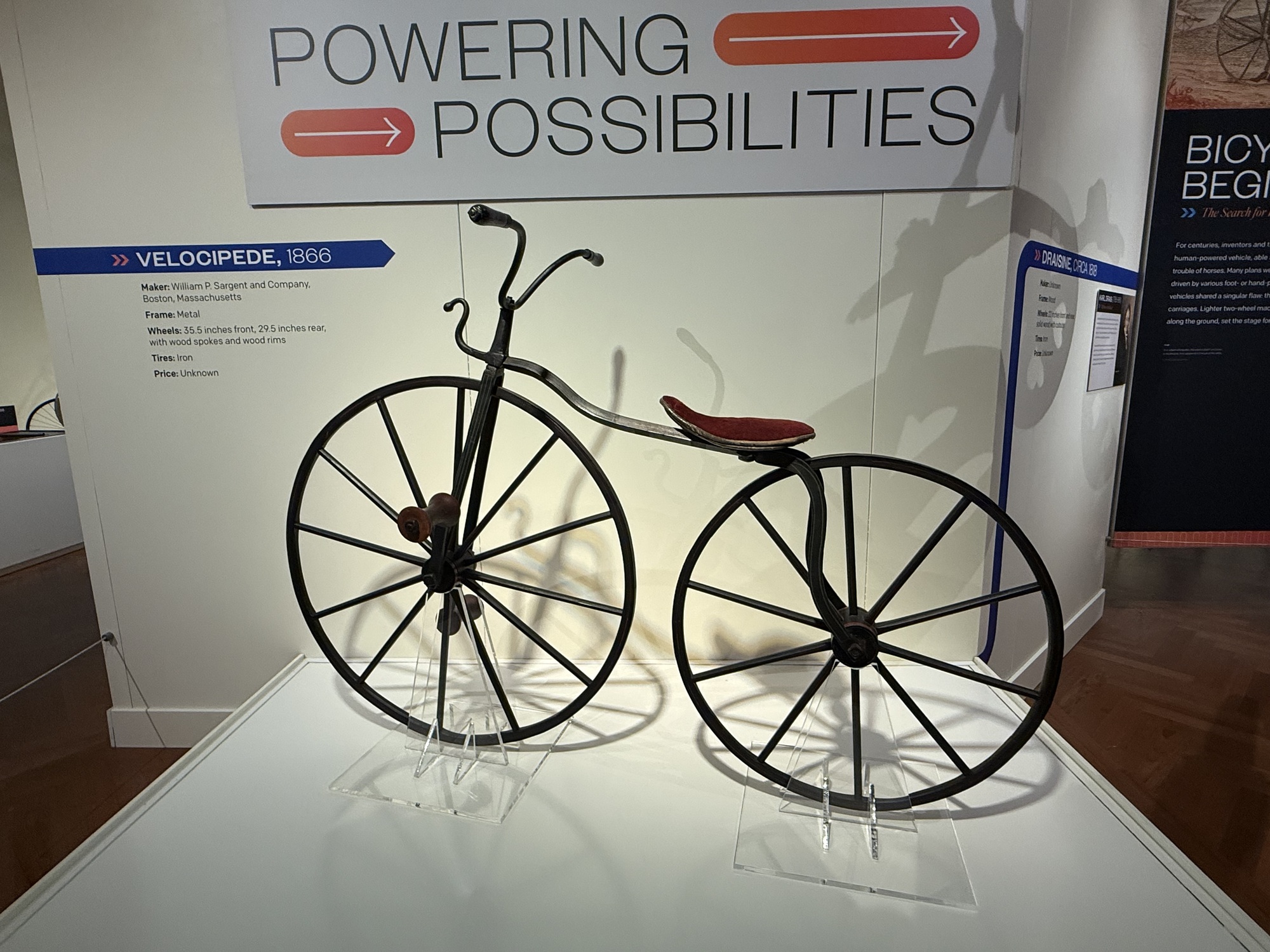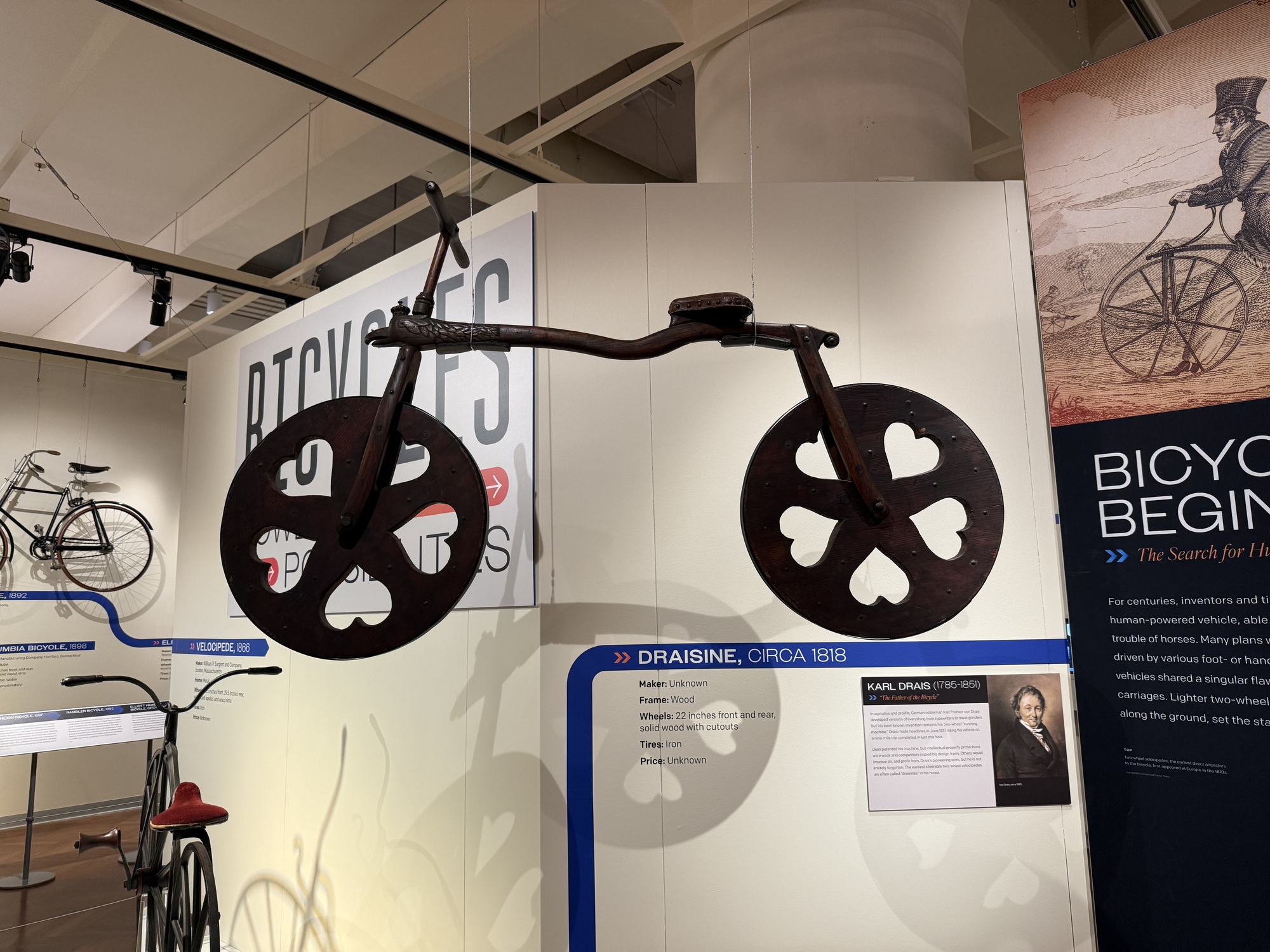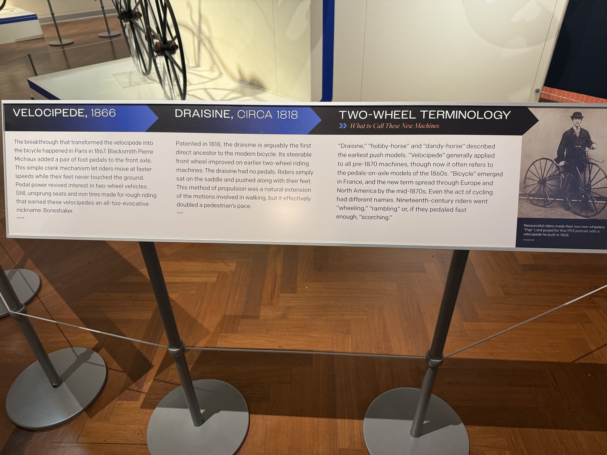 I won't just copy this entire panel, but the breakthrough from a "running machine" to a "bicycle" happened when a blacksmith, Pierre Michaux, added a pair of pedals to the front axle in 1867.