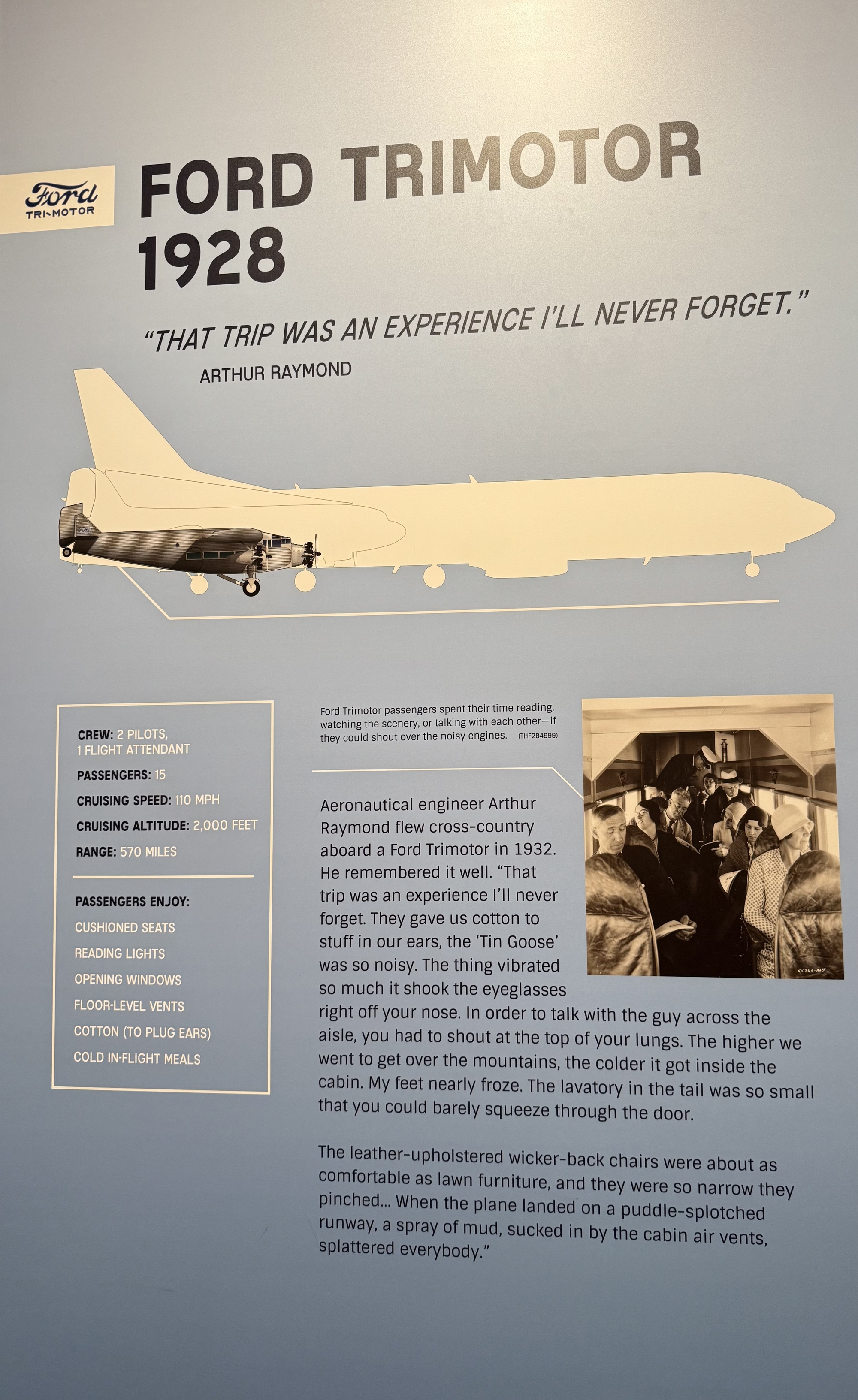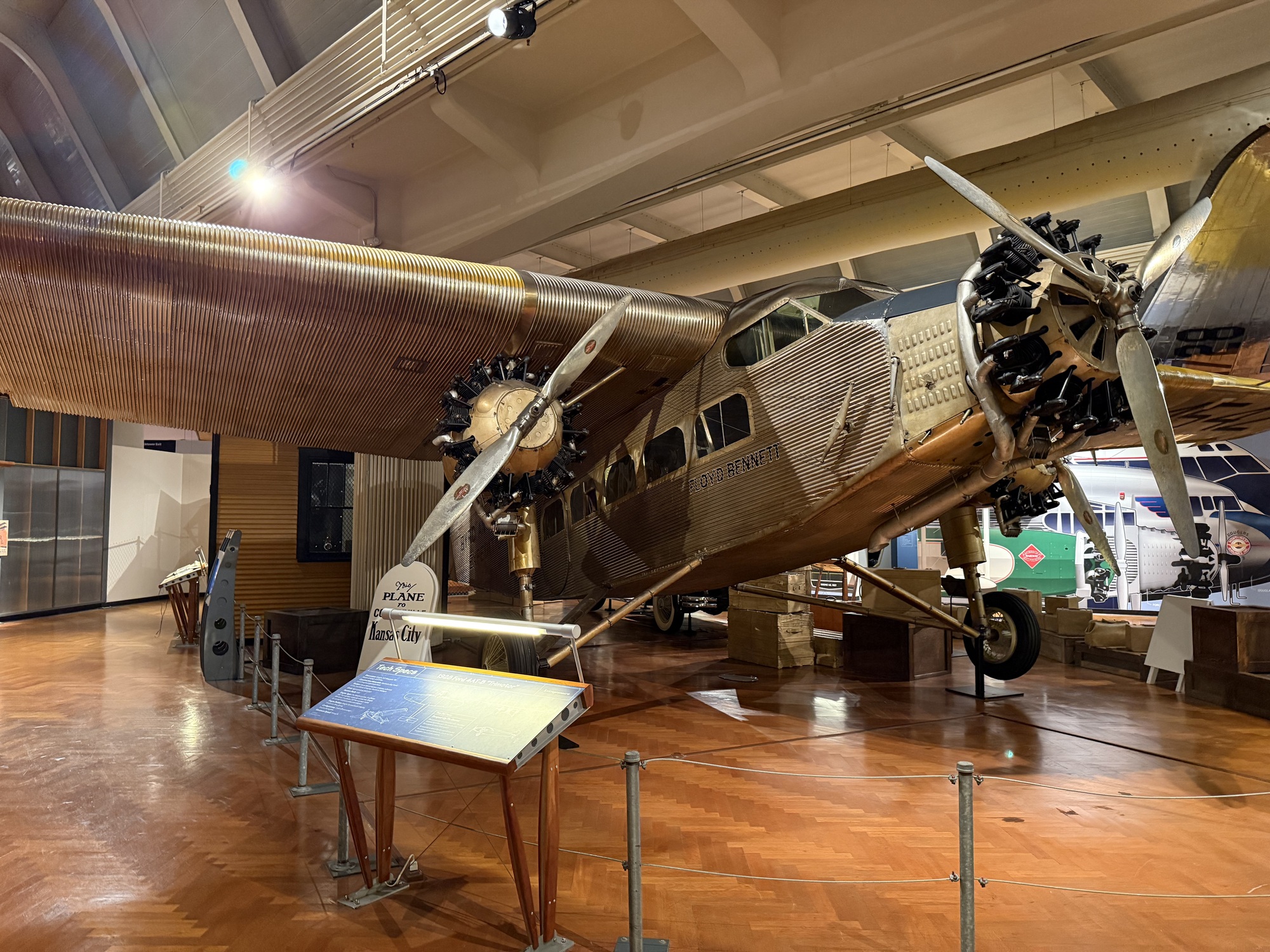 This Tri-Motor, aka "Tin Goose," is the plane that 6-year-old Neil Armstrong first went up in when he was passing through Warren, Ohio (not THE plane he we went up in, but one like it). It's the first all-metal airplane, and the one Charles Lindbergh carried Henry Ford in for his very first flight. Ford traveled in an airplane only a few times in his life, and Lindbergh mailed him a letter thanking him for the honor.