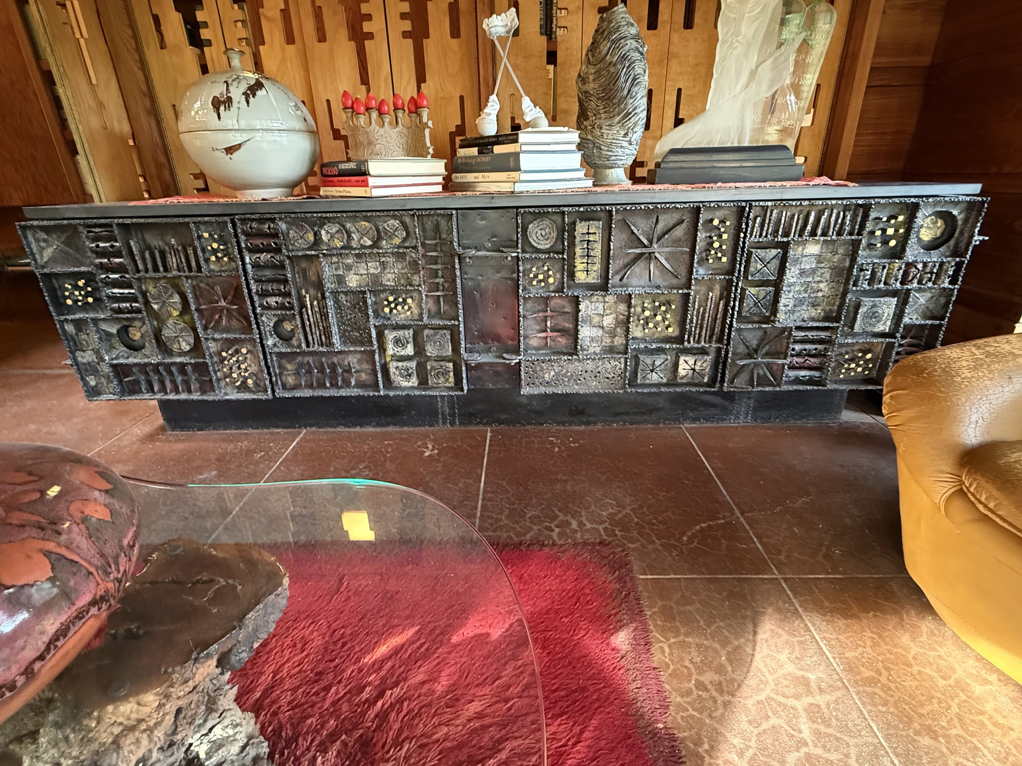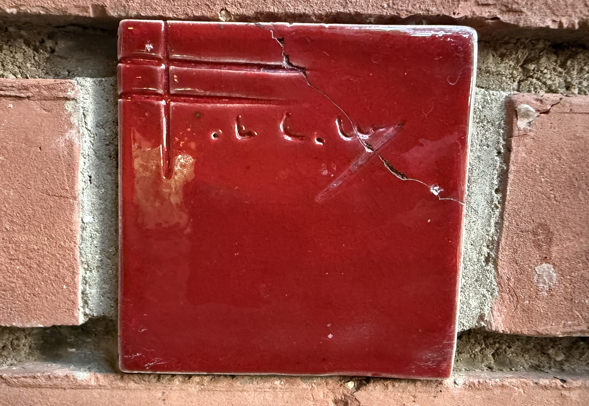 Wright would make a tile for each house he built, then autograph it. Melvyn's hands were so shaky when he was holding it that he dropped it, cracking the corner. He was too shy to ask for another one, and it remained as it is.
