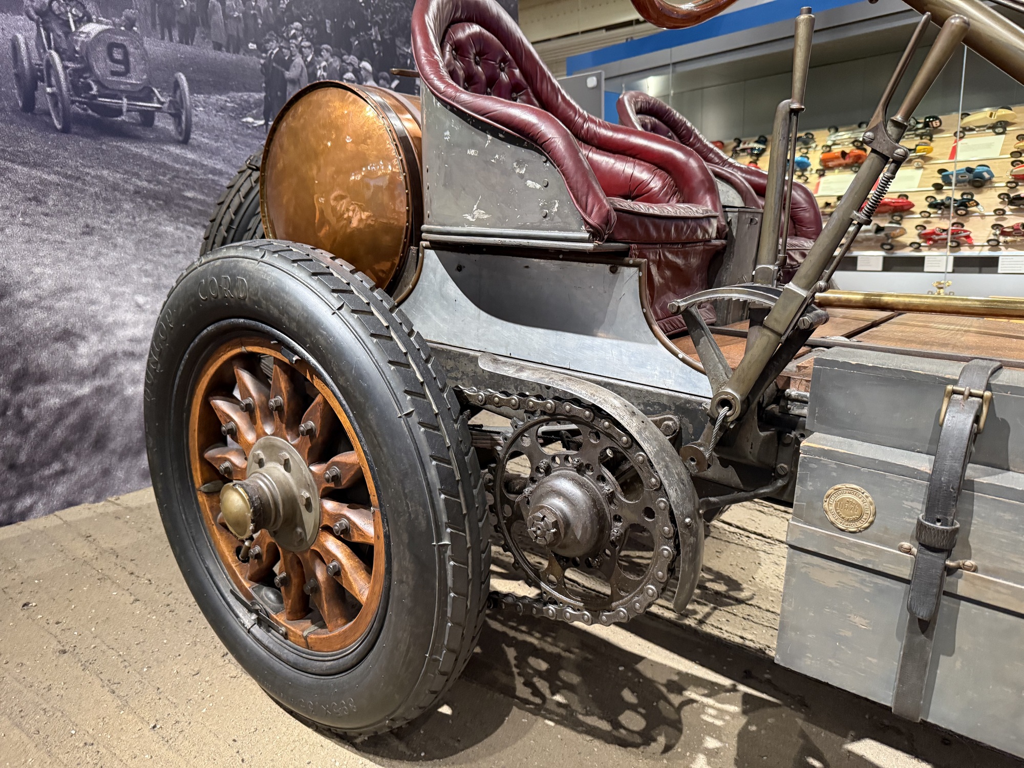 I'm mainly including this photo because of the impressive chain. This car was the first American winner, in 1908, of the Great American Race (previously won thrice by French vehicles), a contest through the streets of Long Island in New York in which, inevitably, one or more of the 250,000 spectators was killed. These deaths helped shift racing to purpose-built tracks.
