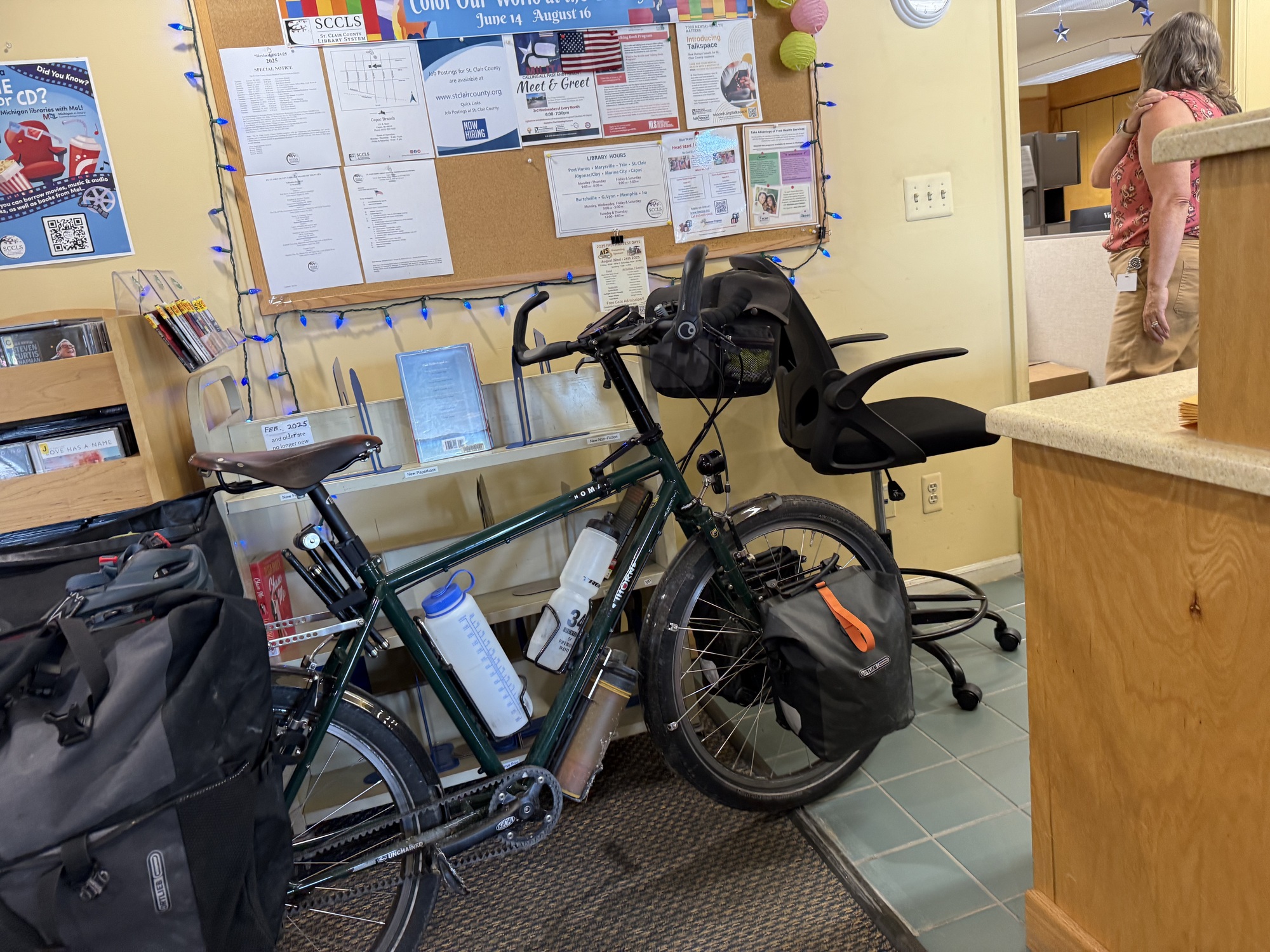 “A bicycle and pannier bags,” I explained, almost verbatim from yesterday. “I’m riding from Key West to the UP and wanted to ride in Canada, but you can’t take a bike across the bridge.”