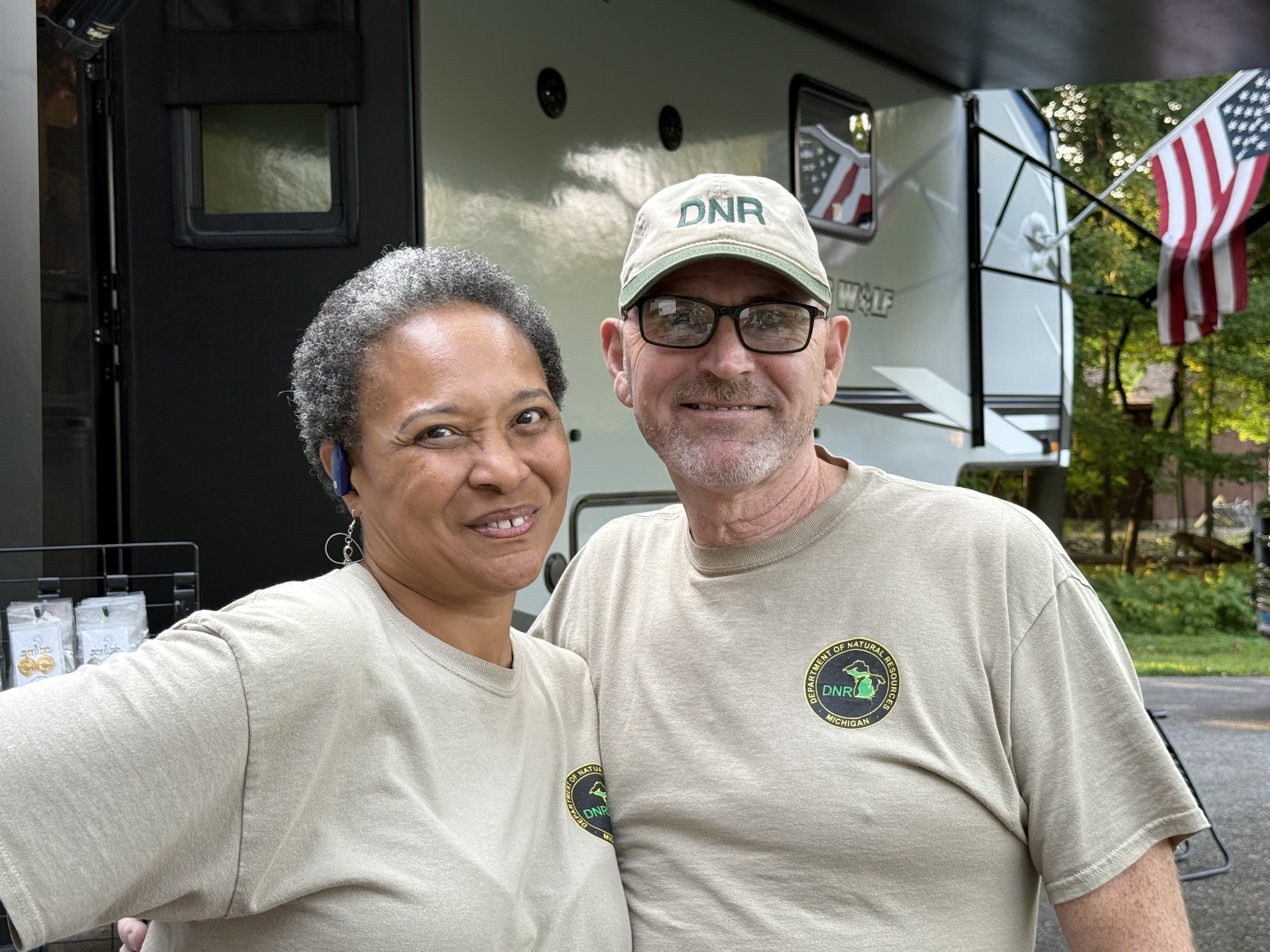 While she was gone I chatted with her husband, Tim. (Tim and Gail are the Campground Hosts, hired by the State Park to help out. Tonight at dusk they're showing an outdoor children's movie with free popcorn, and the crafts she was working on are for the Park.) They live in possibly the largest RV I've ever seen, a self-sufficient Island On Wheels which contains not only eighteen bedrooms and as many bathrooms, but a game room, a fifteen-lane bowling alley, a rugby pitch, and a gymnasium. He shared what he paid for it new and I was astonished. I would certainly have guessed three times that much, and at least six figures.