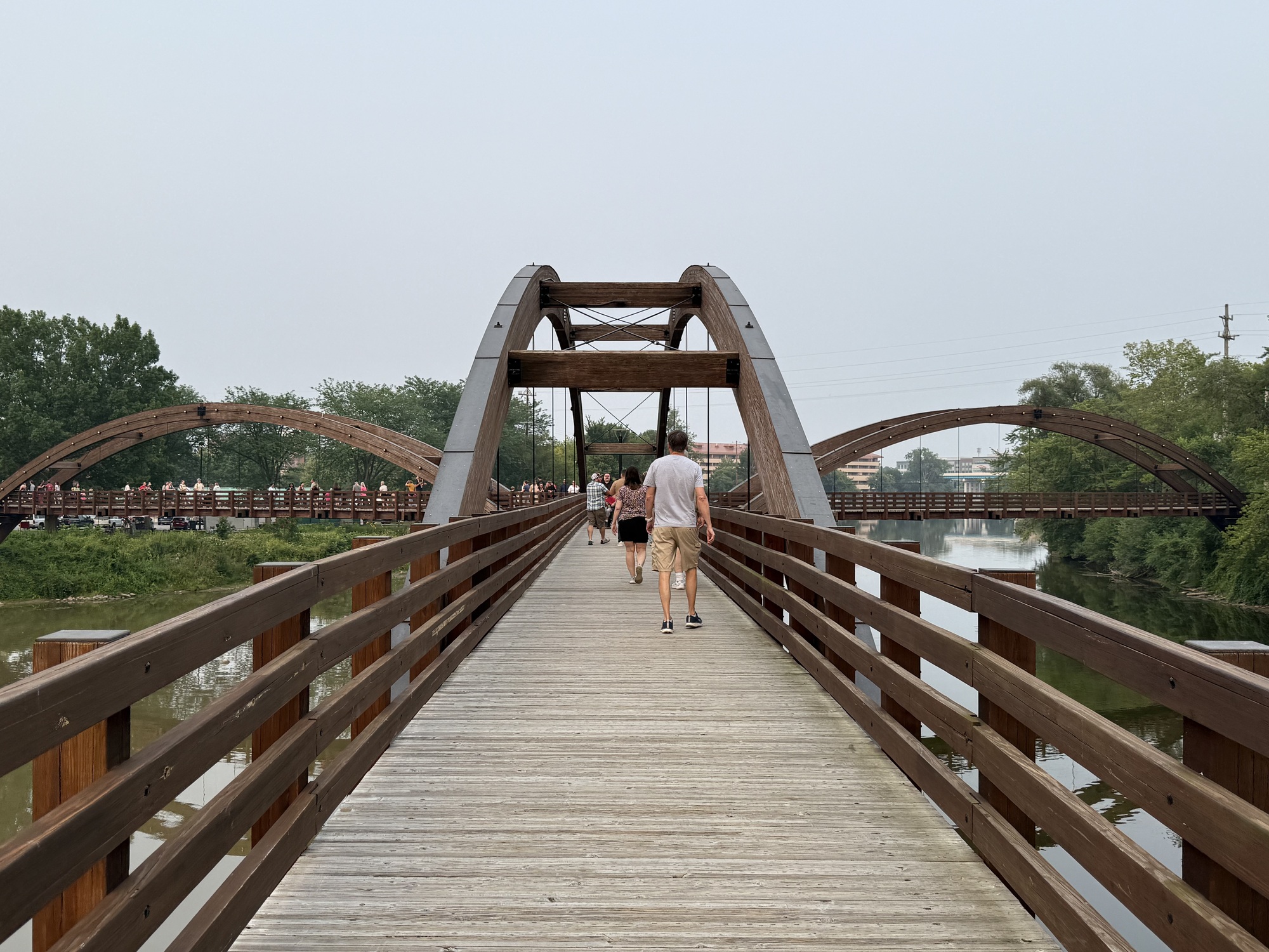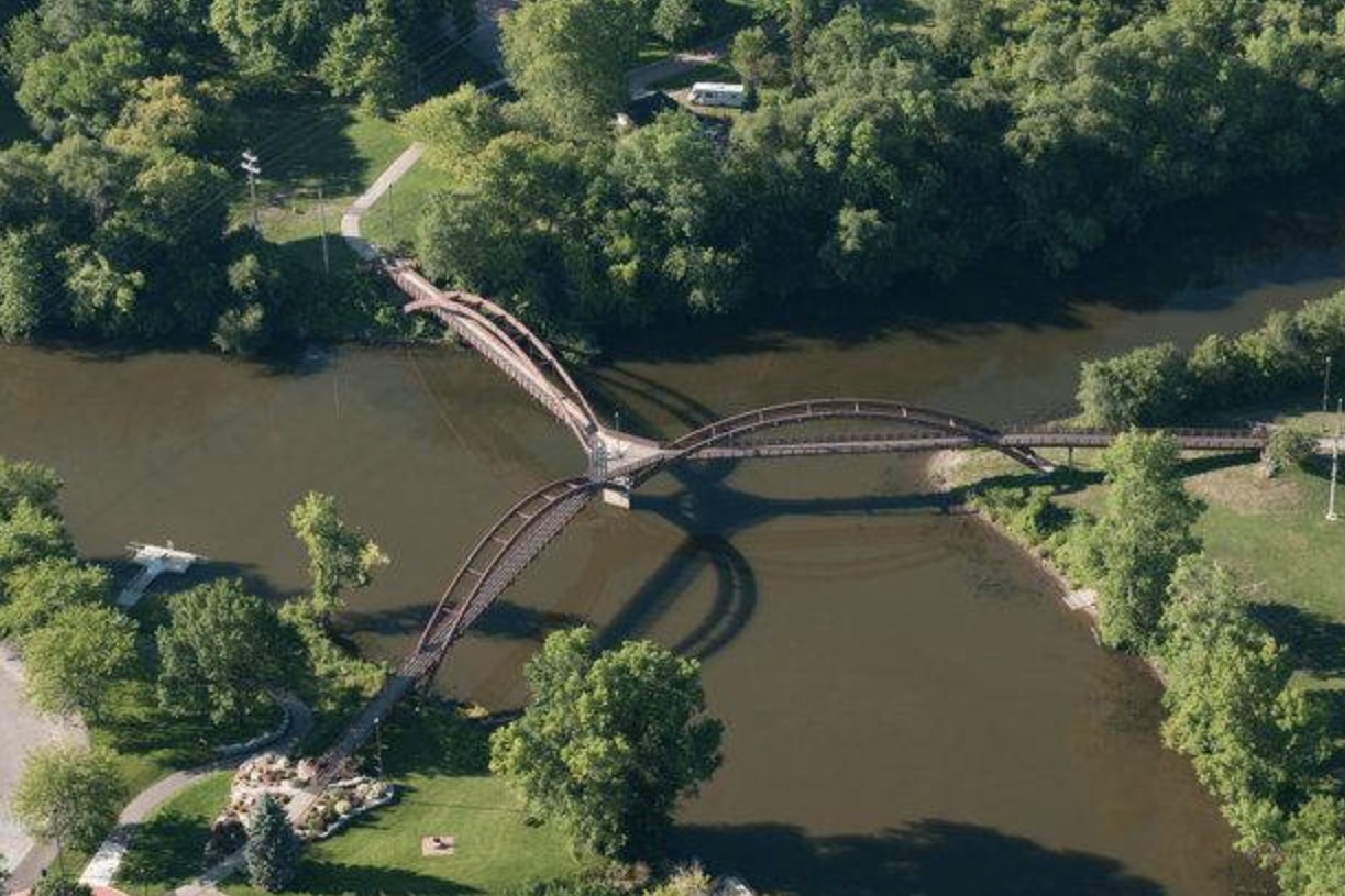 "The Tridge," a contraction of "three-legged bridge," was coined by local elementary school kids during a fundraiser, and spans the intersection of the Tittabawassee and Chippewa Rivers. Also, I absolutely didn't steal this picture from the internet.