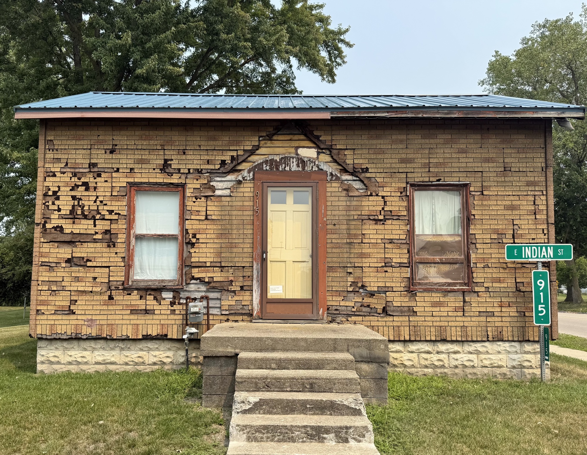 When I passed this house I couldn't tell what was wrong with the brick. When I turned and rode over to it I found that it isn't brick at all, it's just some type of vinyl-like material covering the house to make it look like brick, and it's peeling off.
