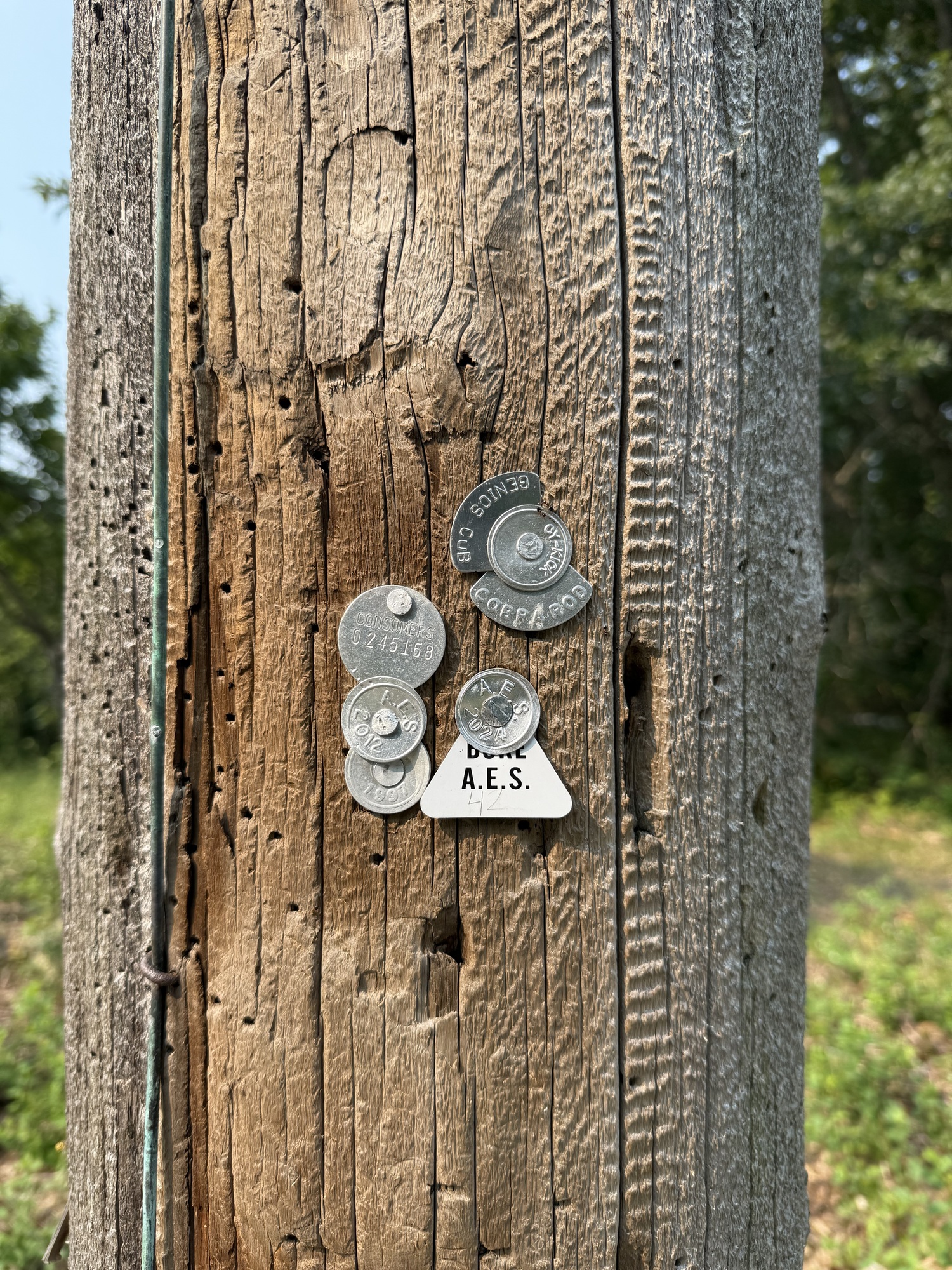 Yesterday I posted a picture of a telephone pole with one of these discs, and Buddy Hall let me know that they’re called “pole tags,” used to help identify which pole is which. This pole, and others I’ve seen along the way, have additional discs. I see the pole tag (Consumer 0245168), indicating that this is pole #245,168, but now I’m curious about all of the other discs. Hey Buddy, can you spare a line?