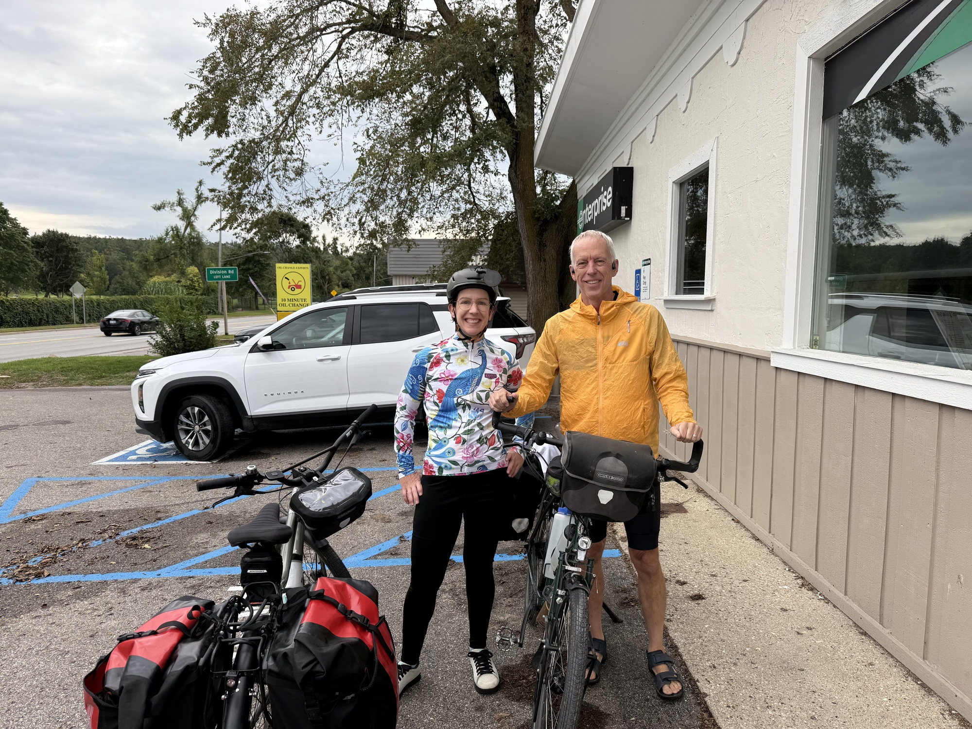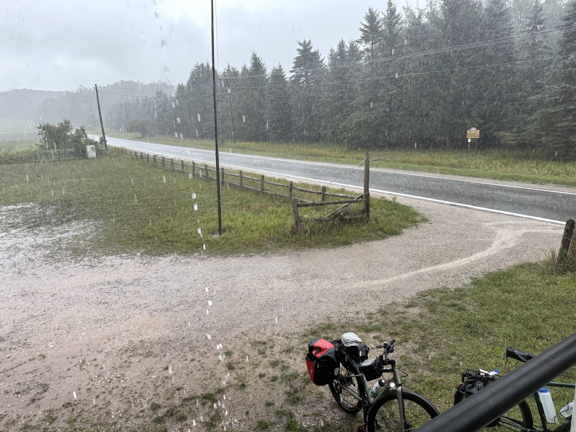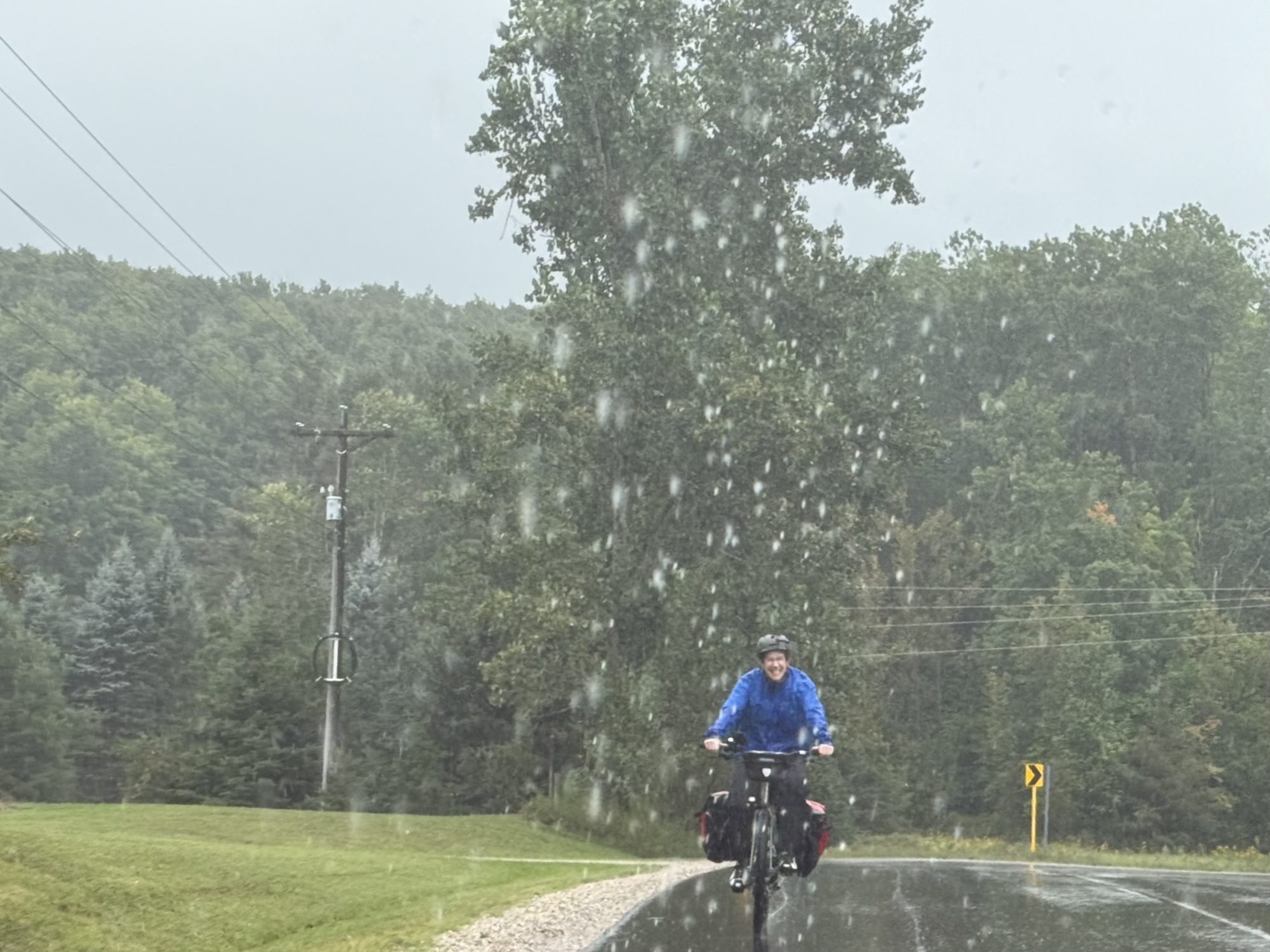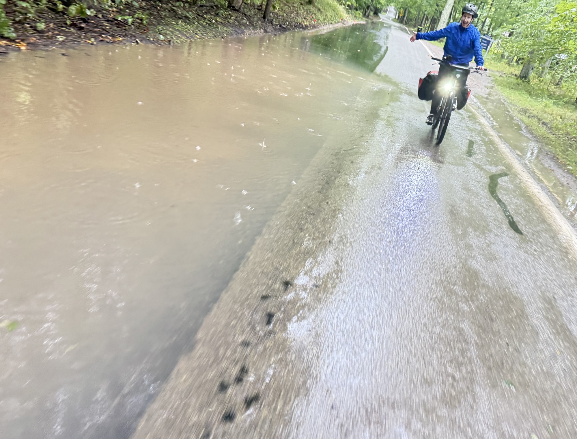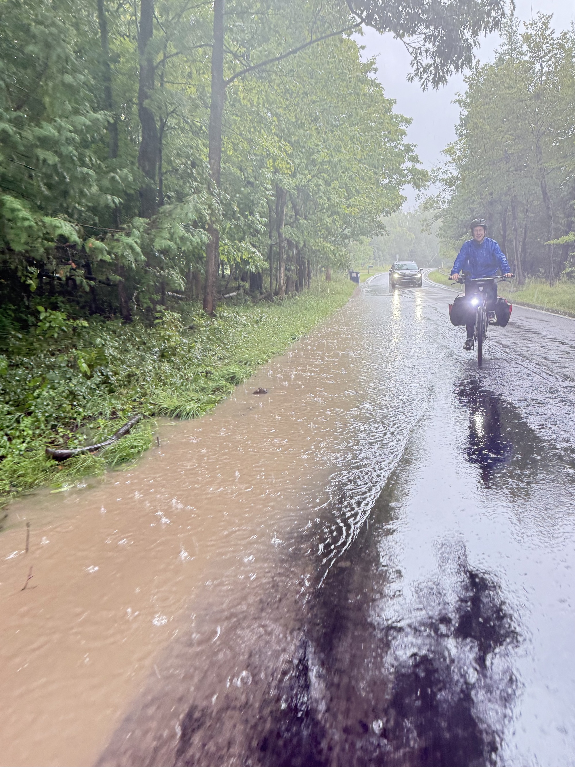 I should tell you that I was a bit worried about Lori. Today has been difficult, even for an experienced rider like me. The skies gifted us with a generous downpour, filling the streets with brown rivers and silt. The rain was horizontal, rarely stopping, and blowing straight into our faces at a steady 20 mph all day.... far more rain than I've experienced on any trip since I started cycling in the early 1980s. How can anyone but a seasoned tourist know that this isn't a typical day? Obviously, only an insane person, present company included, would actually enjoy this....