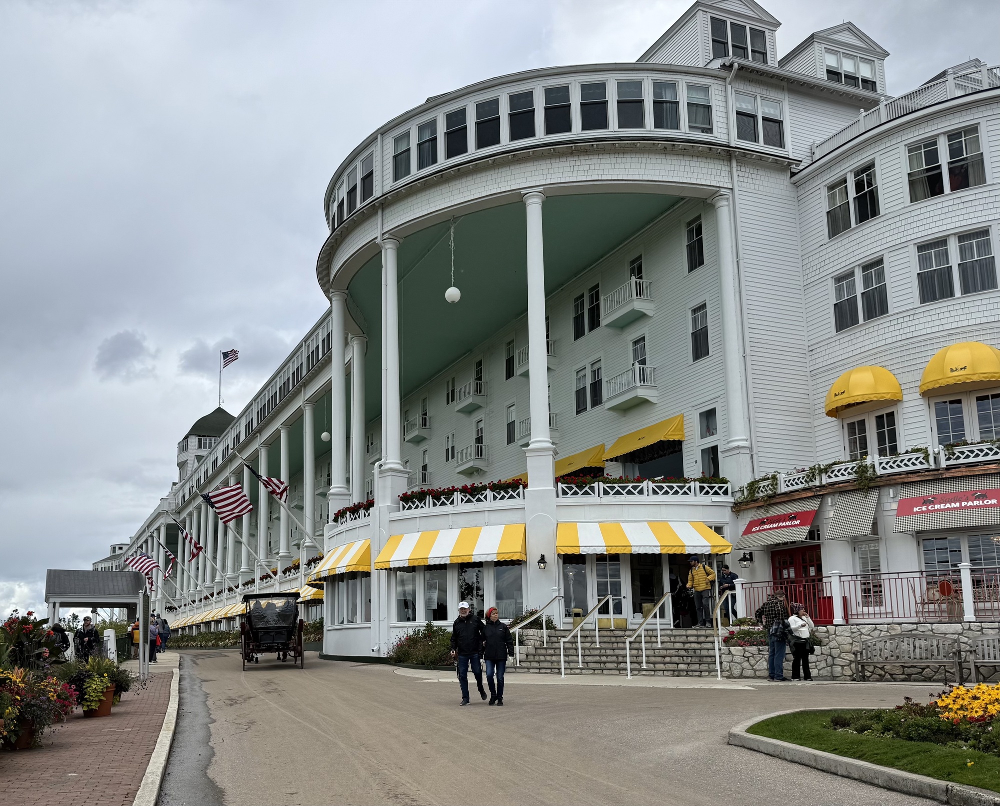 + The hotel maintains more than 125,000 flowers. More than one ton of flower bulbs are planted each Autumn to create the gardens on the Grand Hotel's grounds..... geraniums, the hotel’s signature flower, as well as tulips and daffodils. These are best seen, unsurprisingly, from the front porch and, as mentioned earlier, that view can be yours for only $1,000.
