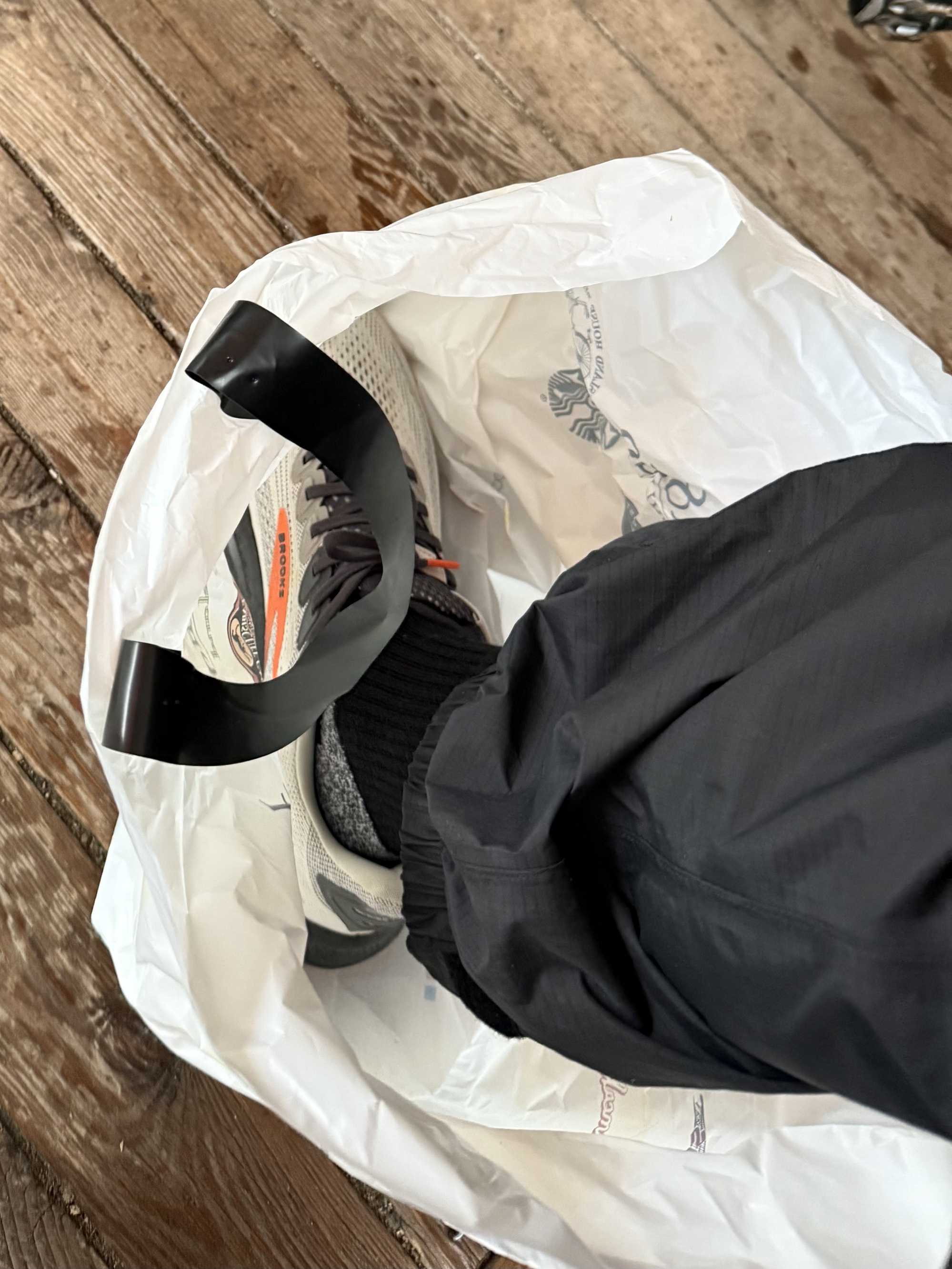 Because I was wearing my recently-purchased tennis shoes instead of my cycling sandals I needed to devise a creative way to protect them, so we asked for bags from the restaurant.