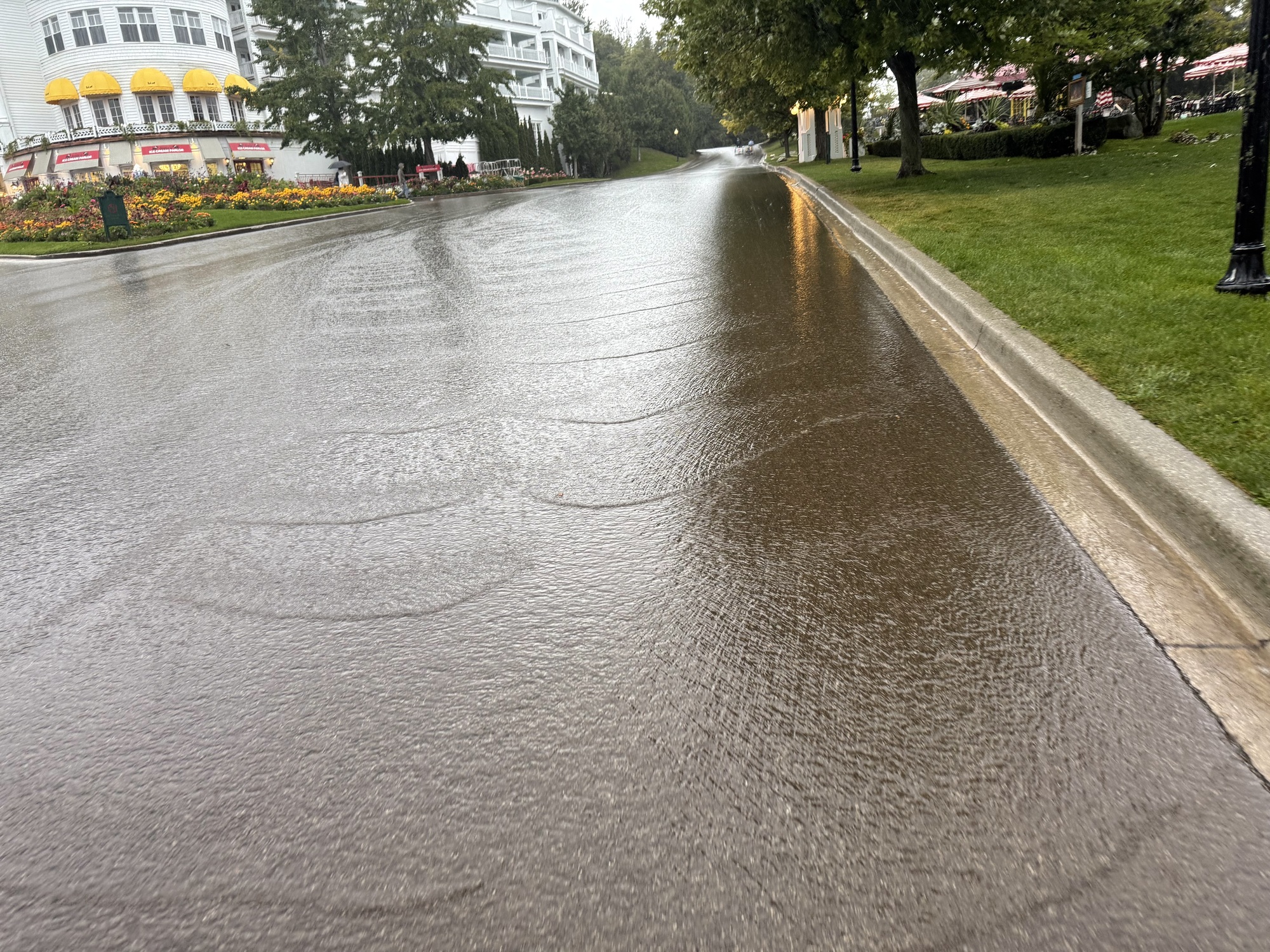 We finished our dinner and walked outside to find that the rain earlier was merely a preliminary sprinkle. The skies had simply been waiting for us to finish our meal so it could get on with its main purpose: dumping water on us.