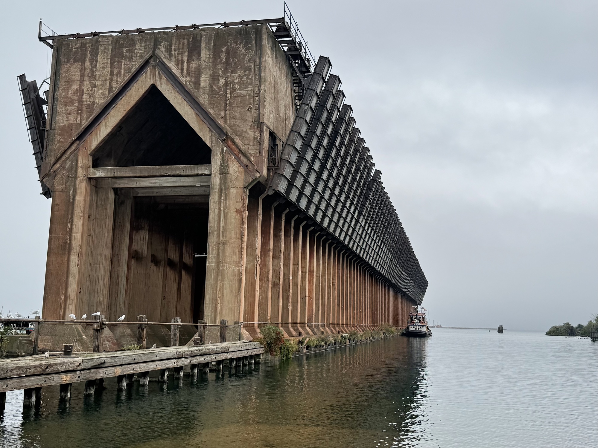 It doesn't take much imagination to picture what it was like when this place was booming.... all those chutes dumping ore into a boat. There's a tugboat for scale.