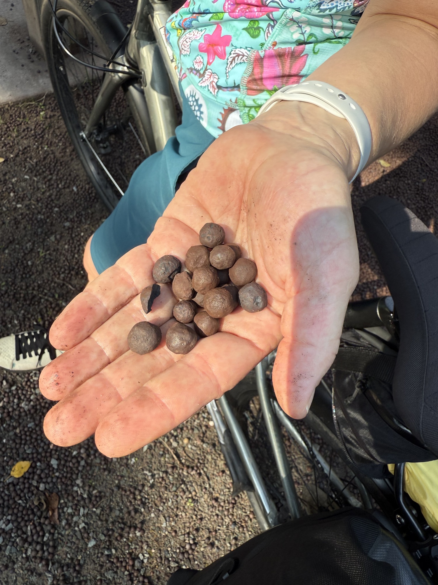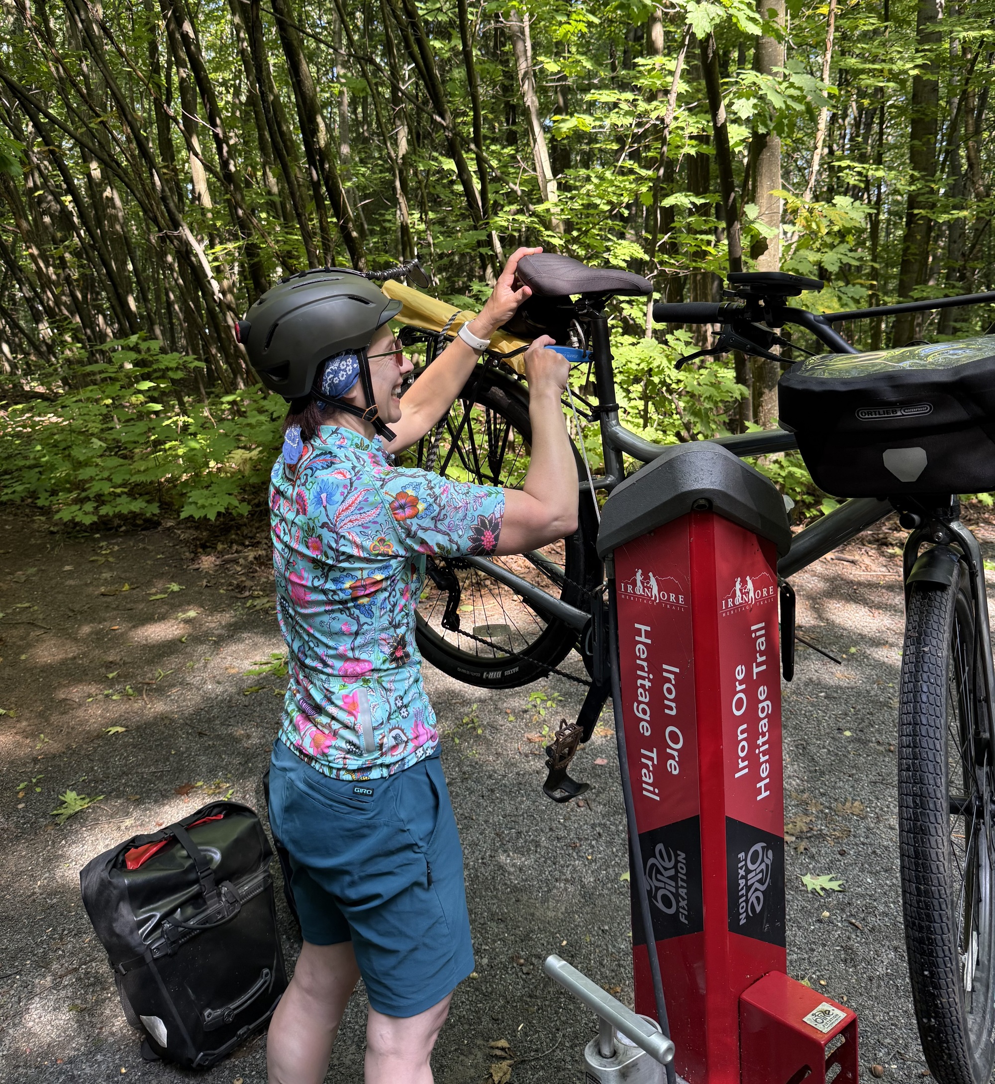Lori's saddle worked loose and was a little wiggly, so as we were riding she suddenly pulled over at the trailside repair stand, lifted her bike onto the bars, and tightened it up. I was glad, because otherwise I would have had to go to the terrible inconvenience of reaching into my handlebar bag to retrieve my Allen wrench.