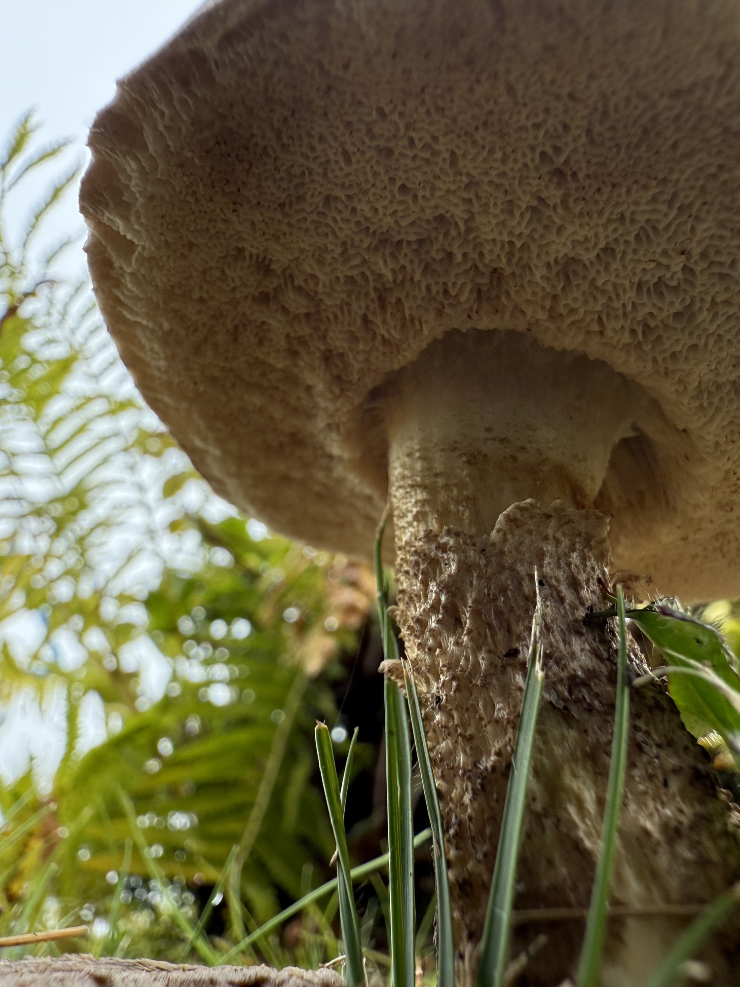 Bill ShaneyfeltSome kind of Bolete. Porous underside as opposed to gilled underside of most mushrooms. Some are quite poisonous and some that look similar are considered excellent. I avoid eating them due to the ease of confusion.