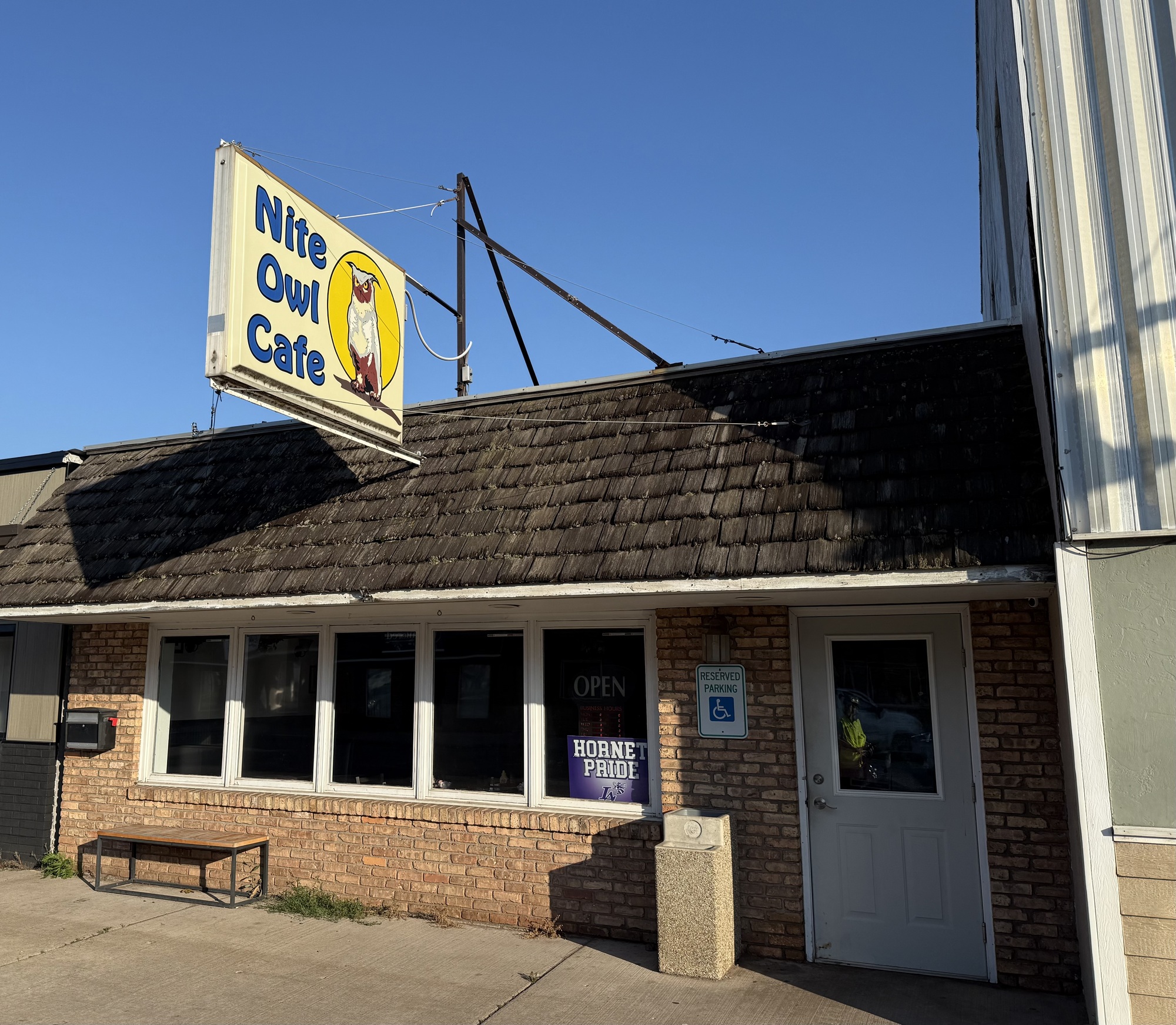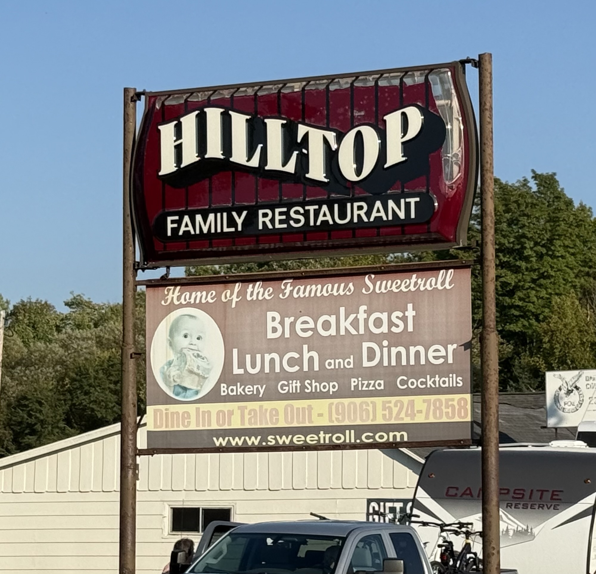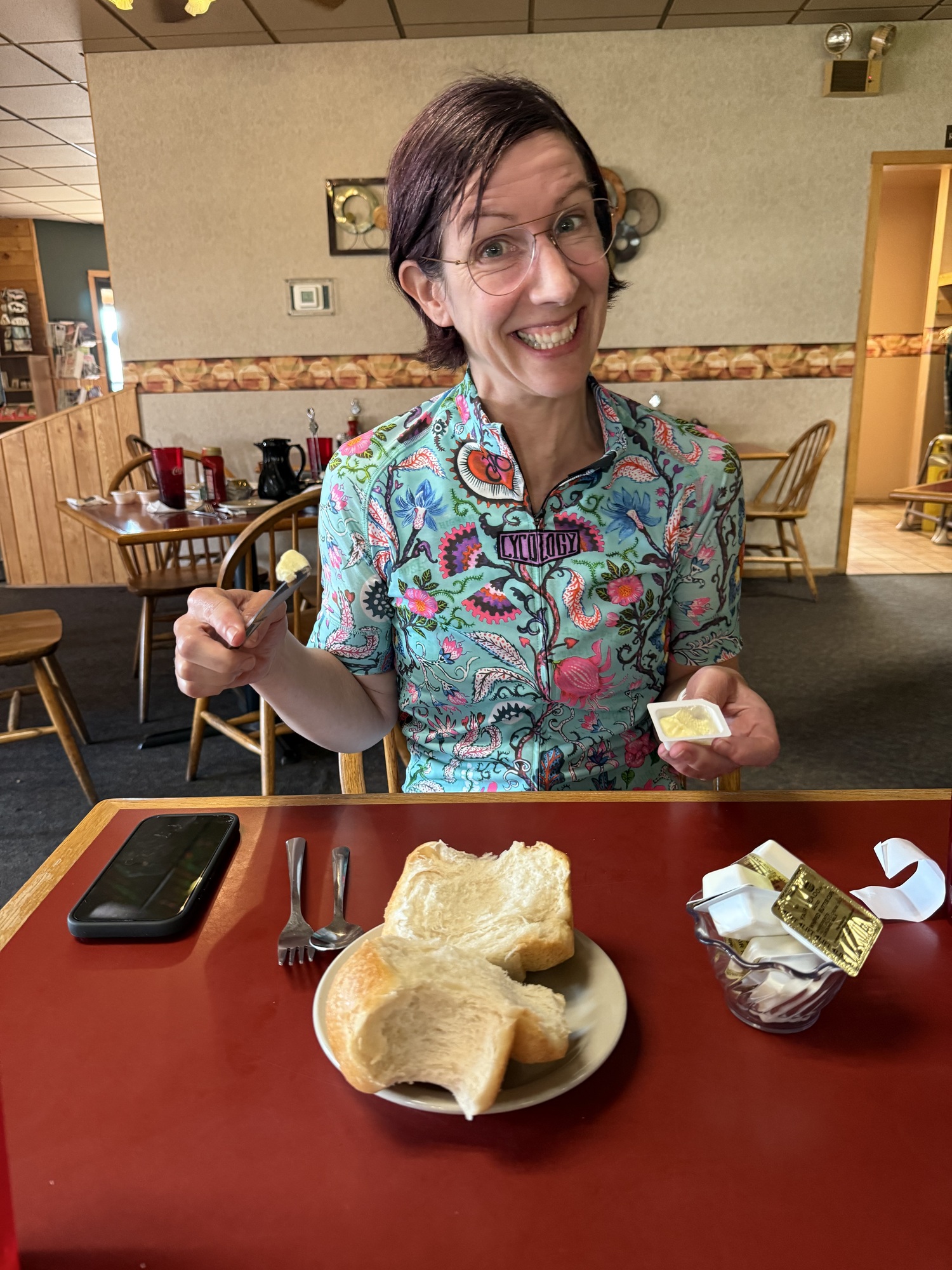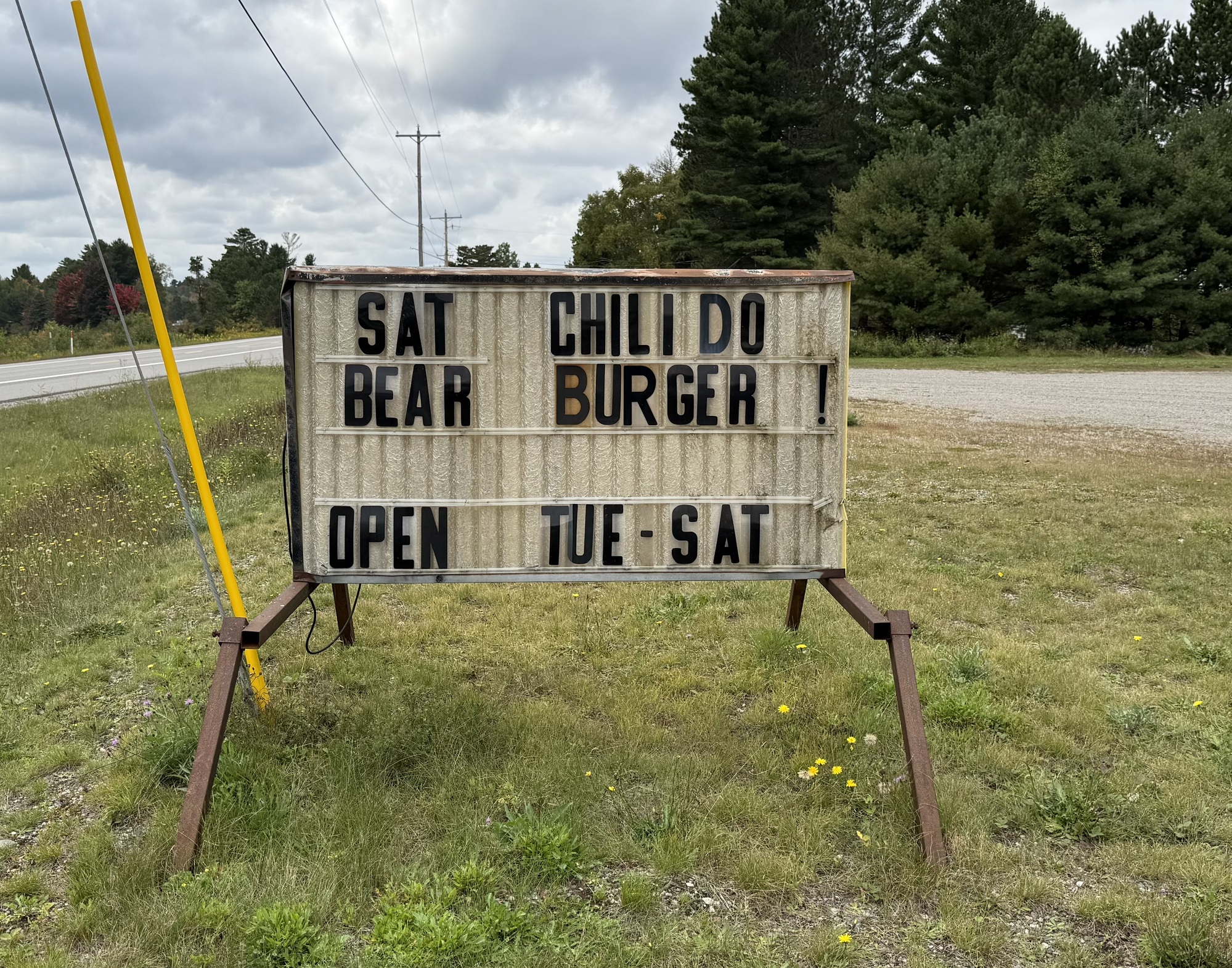 Lori, riding in front of me, pulled into the parking lot of this restaurant. It was time to eat lunch and upon seeing the marquee she decided right then and there that she wanted a bear burger. The sign said they’re open Tuesday through Saturday (today is Saturday), and the hours are 2-8 (it’s 2:06) but even after hanging around for about fifteen minutes no one ever showed up. It’s now past peak season so a lot of the cafes are closed in spite of what their signage states.