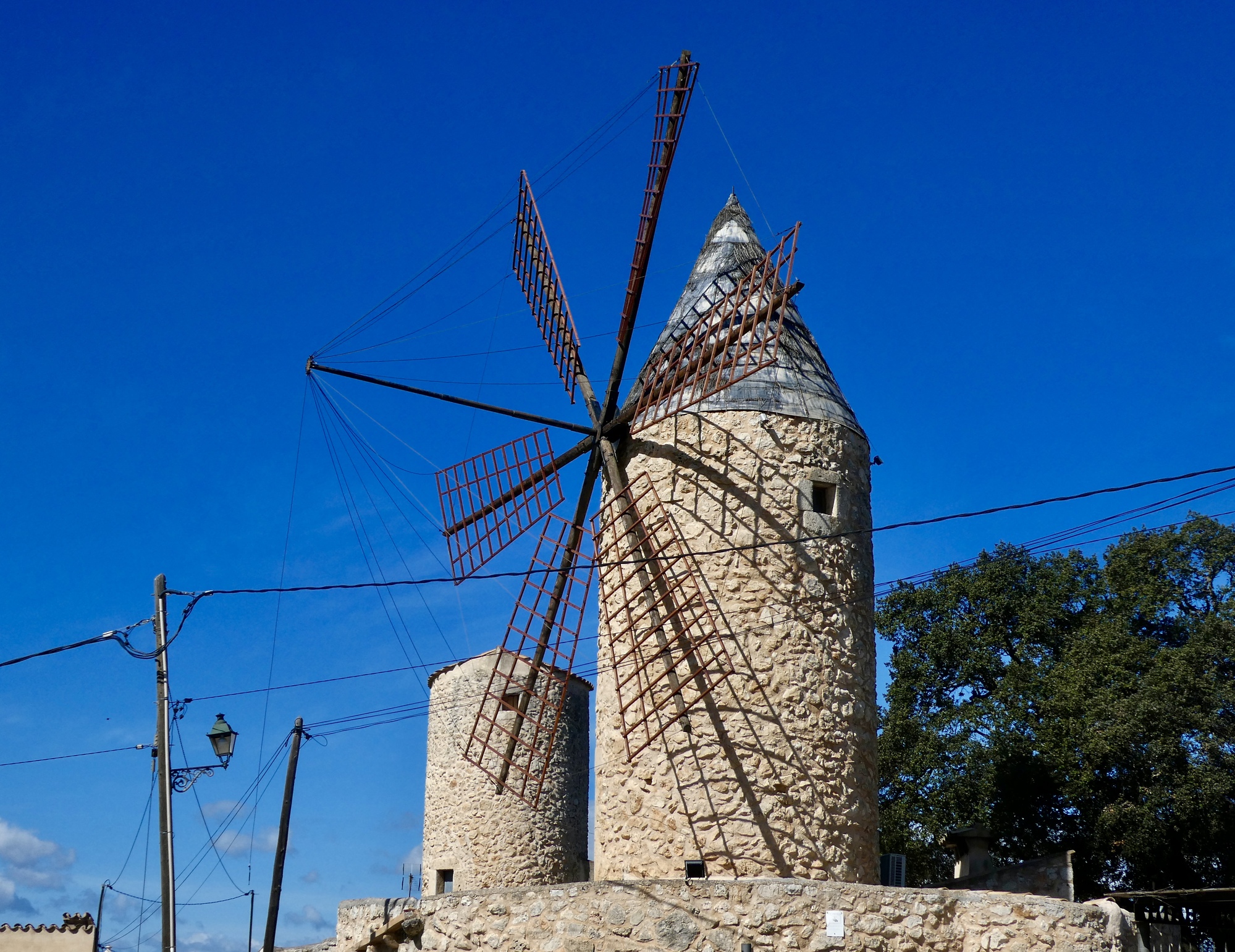 It doesn’t take long until I’ve crossed the tracks and a highway and approach the windmill. It’s in such well preserved condition that I’m not surprised to see that it’s the site of an upper class restaurant, el Moli d’en Pau. Shortly before I reach it I see another pair of windmills off the road to the north, and decide I’ll try to get a better view of them later.