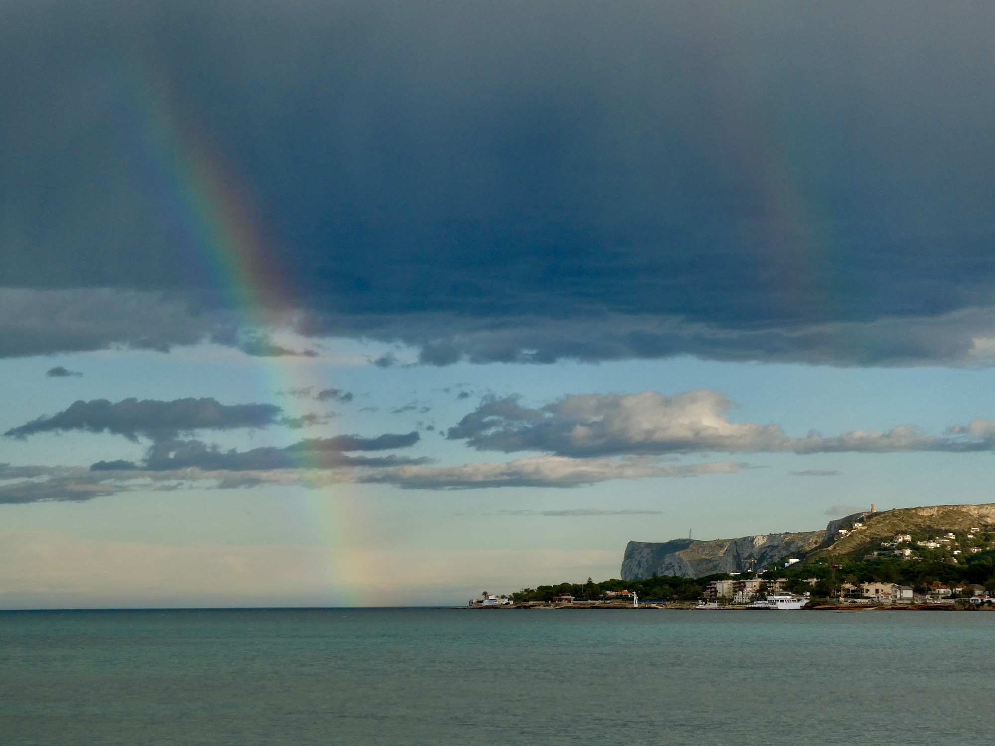 So finally I’m outside, and on the path out to the pier with all the other walkers. It’s a long pier, and my goal is to get to the dogleg near the end where I hope for an unobstructed view back at Montgó Massif, and across the bay to the castle we biked beneath when we arrived.